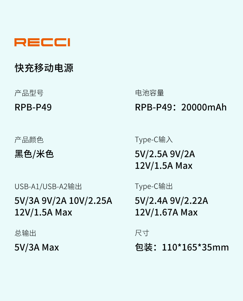商品名称:Recci/锐思20000mAh新星两万快充移动电源RPB-P49