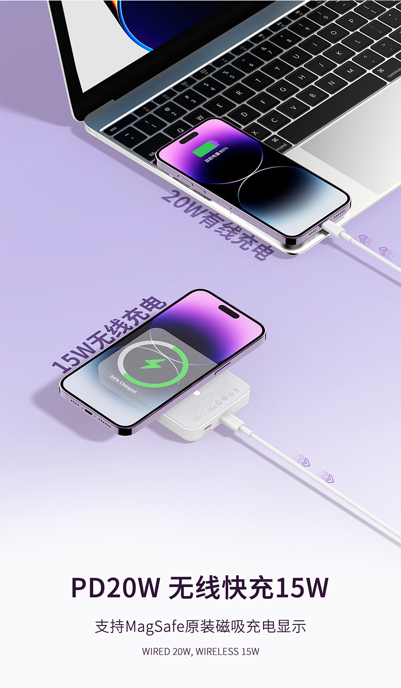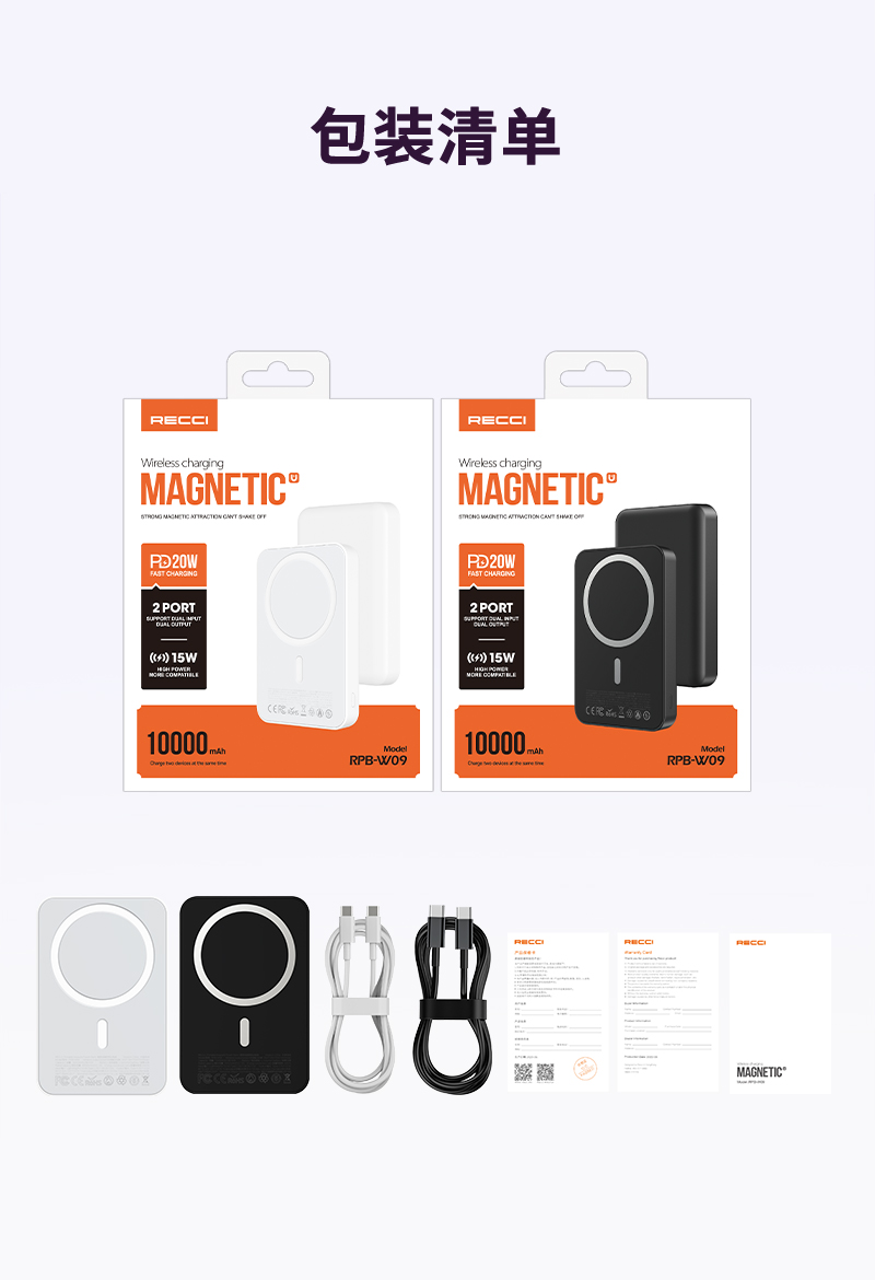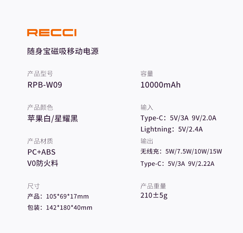 商品名称:Recci/锐思10000mAh薄至随身宝磁吸移动电源RPB-W09