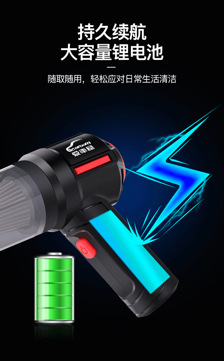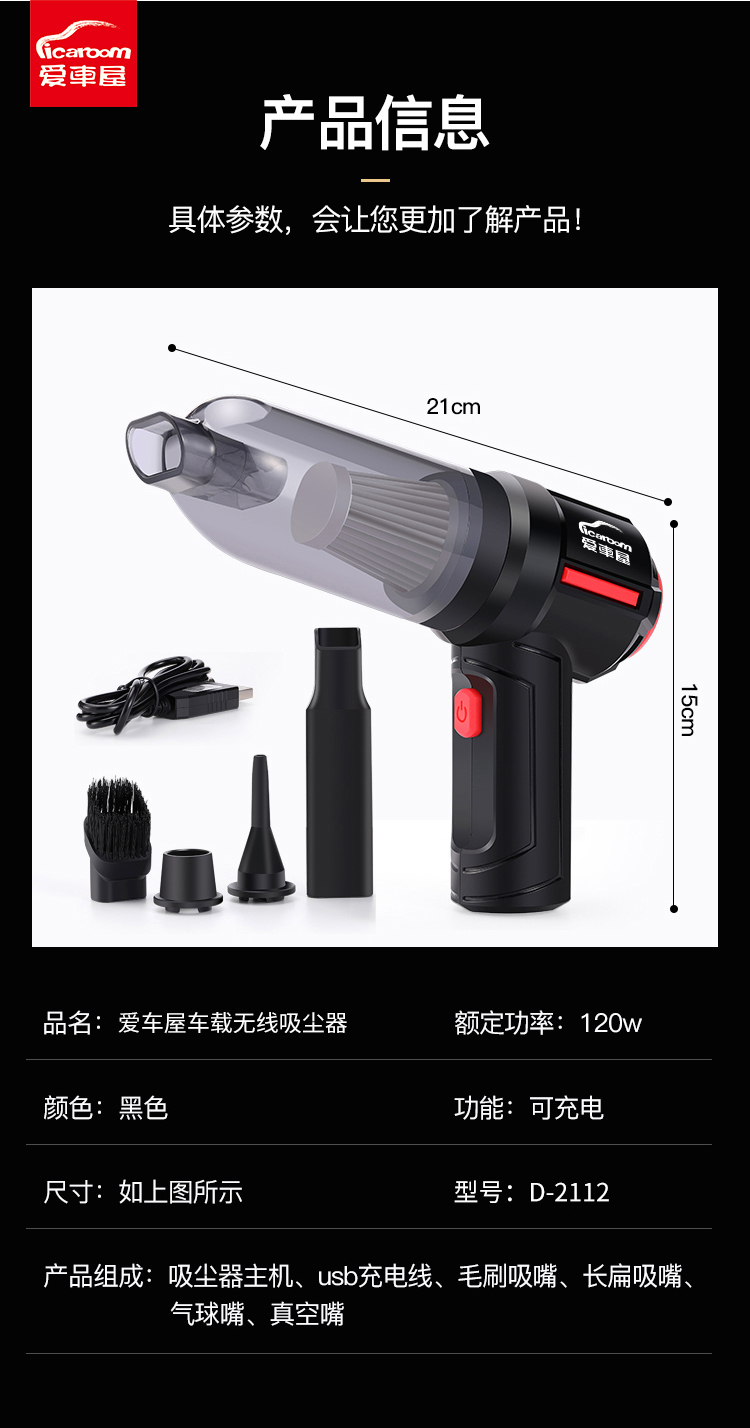 商品名称:ICAROOM/爱车屋车载无线吸尘器-黑色D-2112