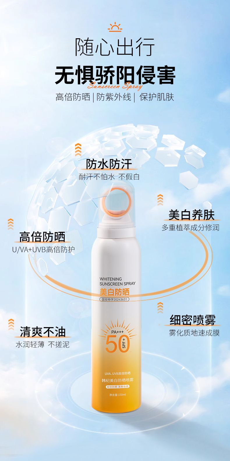 商品名称:【热销品】韩纪小光圈防晒喷雾SPF50 150毫升 清爽不粘腻防紫外线150ml