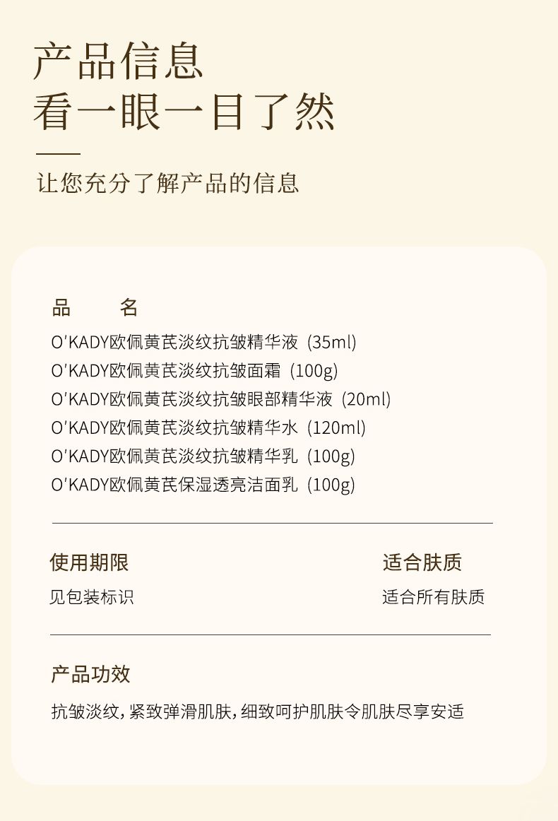 商品名称:欧佩黄芪霜淡纹六件套抗皱护肤品套装补水保湿水乳520节礼物送妈妈 欧佩黄芪淡纹抗皱菁萃六件套