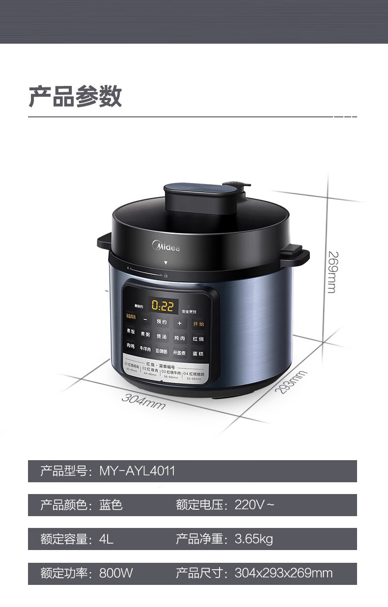 商品名称:Midea/美的4升电压力锅-蓝色MY-AYL4011