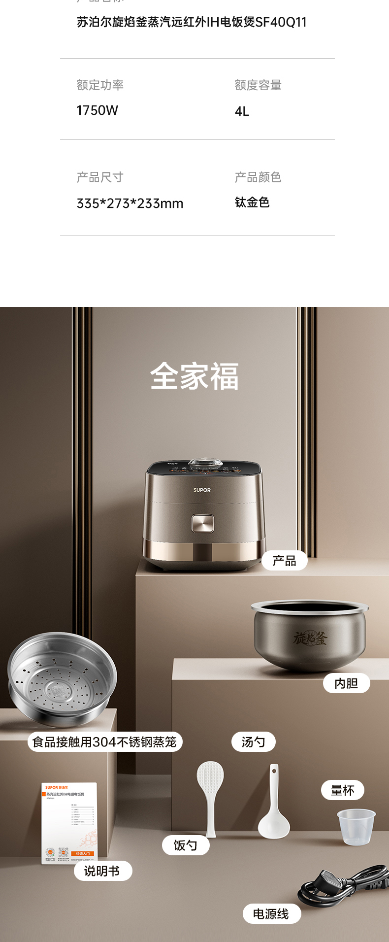 商品名称:SUPOR/苏泊尔4升旋焰釜蒸汽远红外IH电饭煲SF40Q11