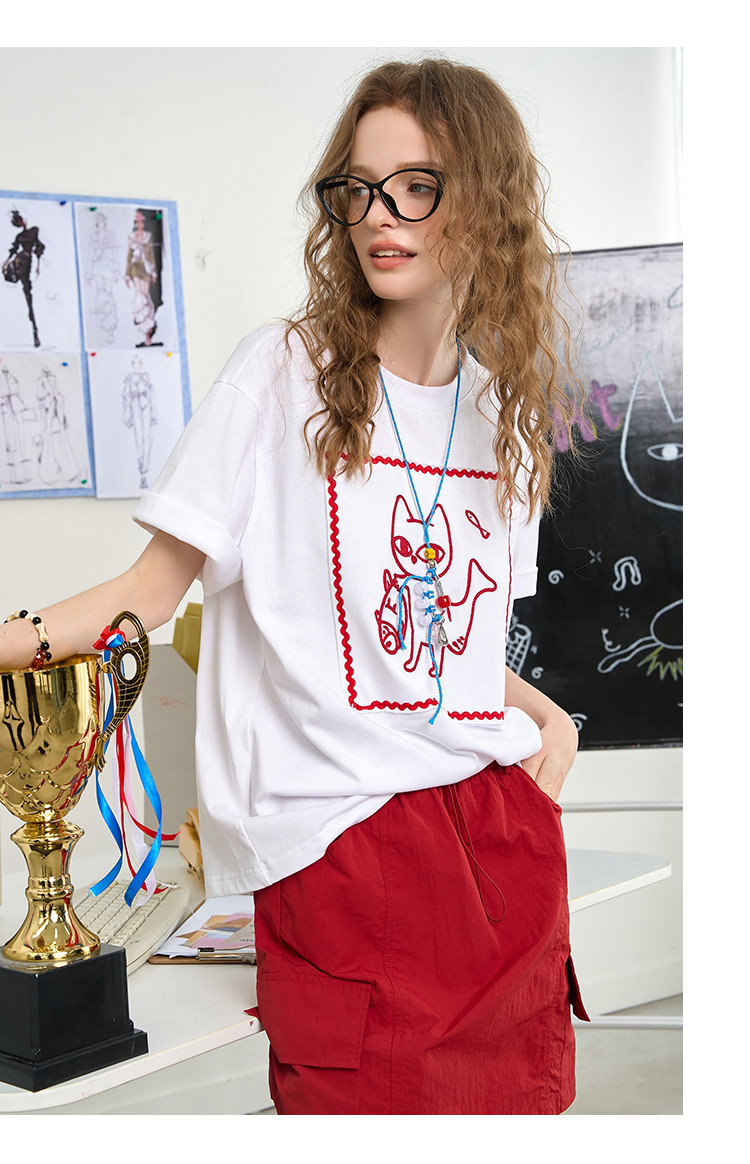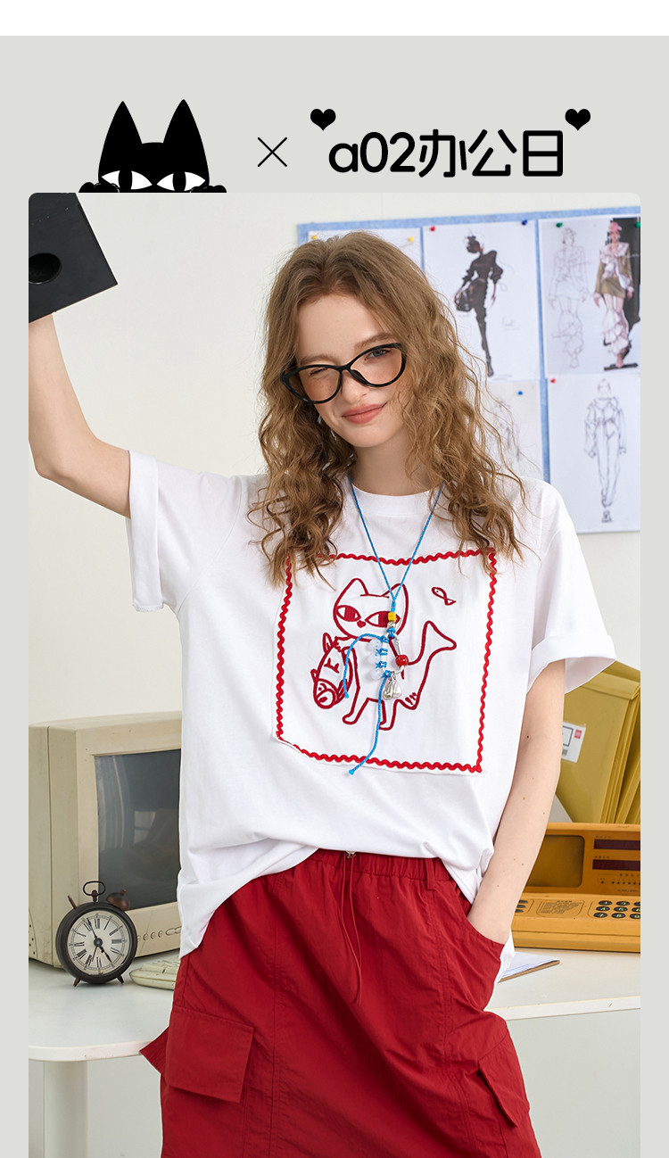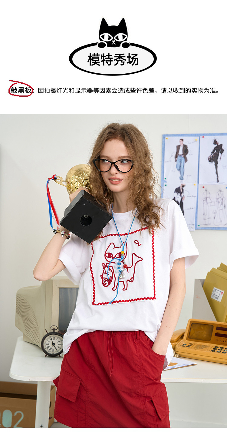 商品名称:美式刺绣宽松圆领撞色短袖上衣2025夏季百搭休闲女式T恤 307997