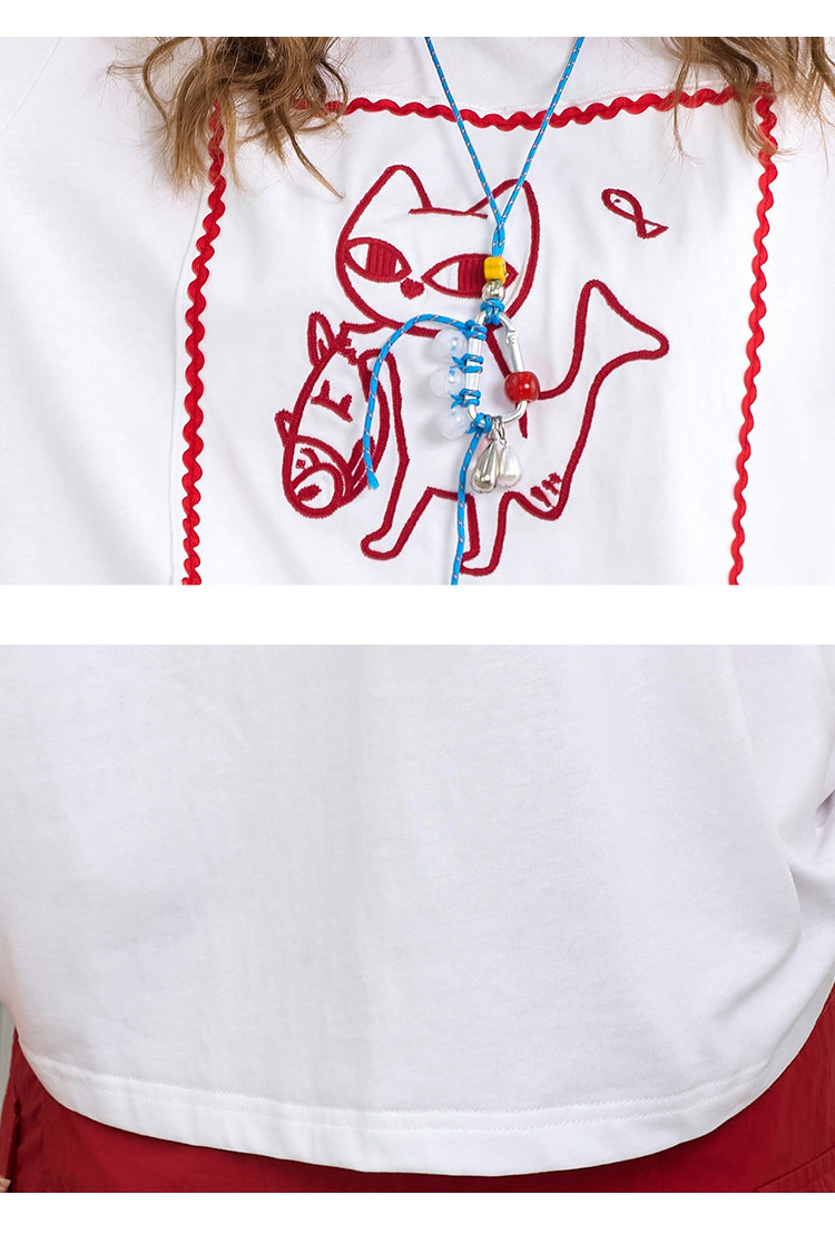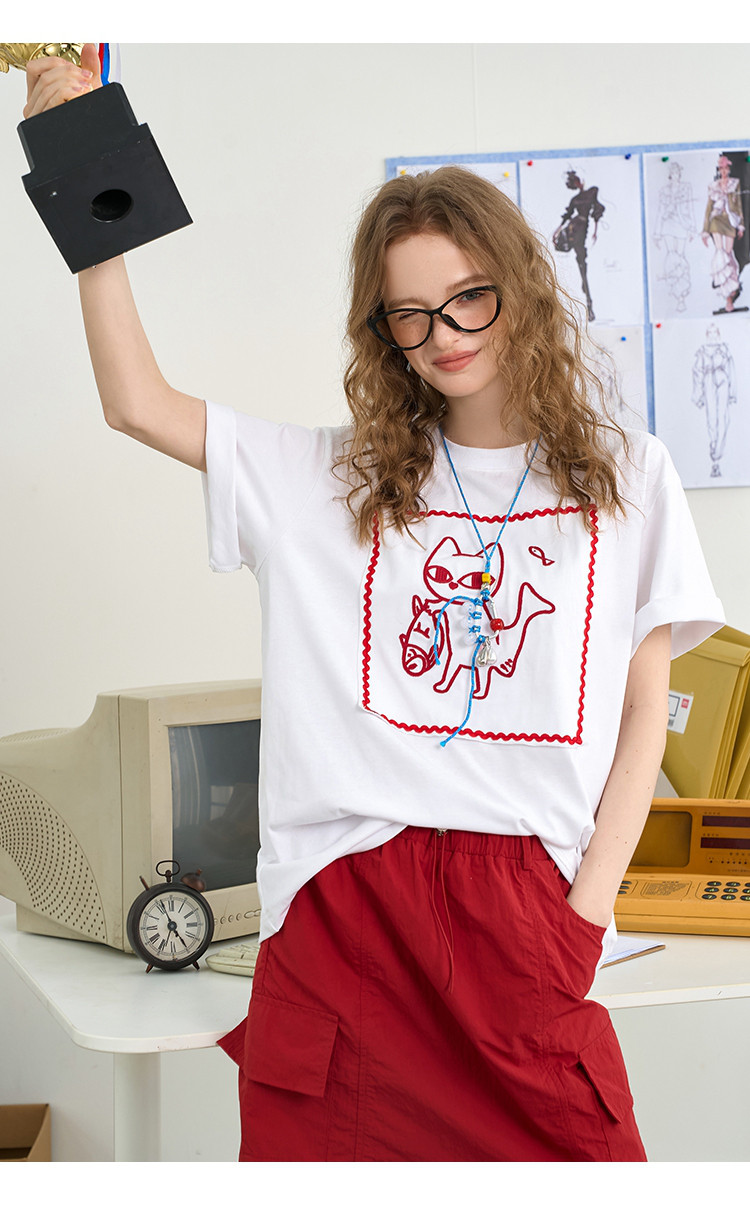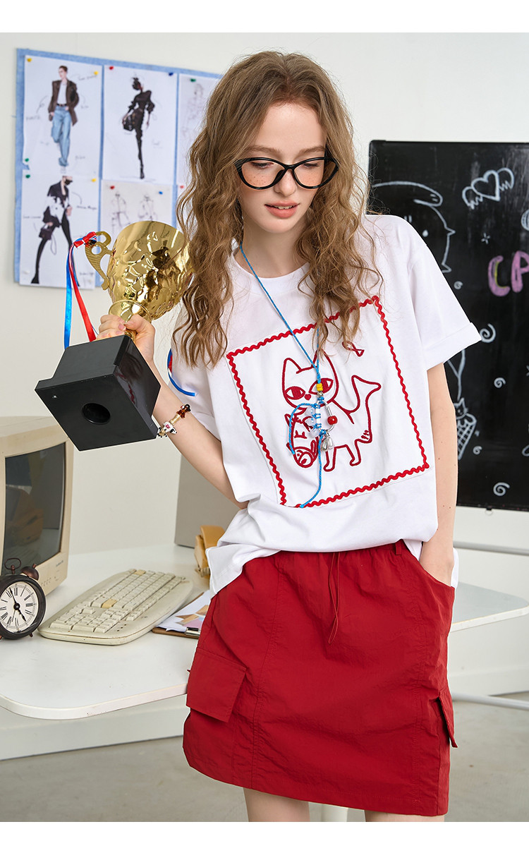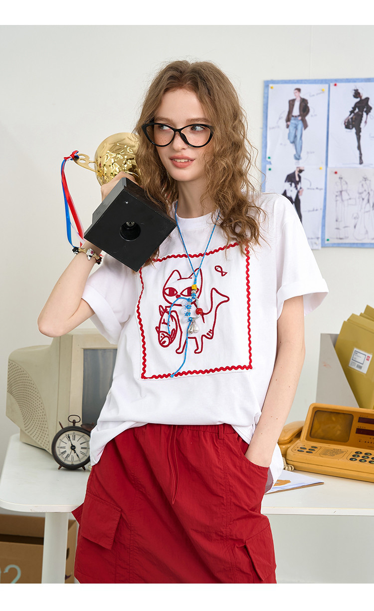 商品名称:美式刺绣宽松圆领撞色短袖上衣2025夏季百搭休闲女式T恤 307997