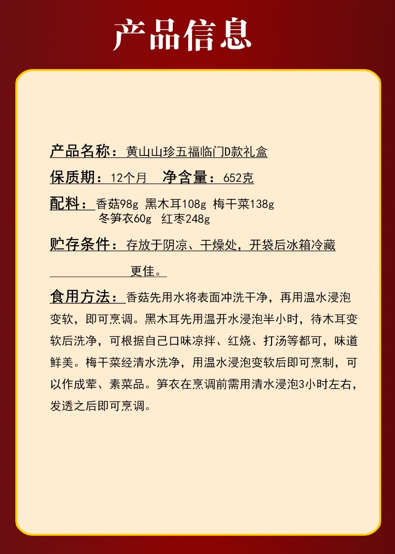 商品名称:小壶天黄山山珍五福临门D款干货礼盒652g