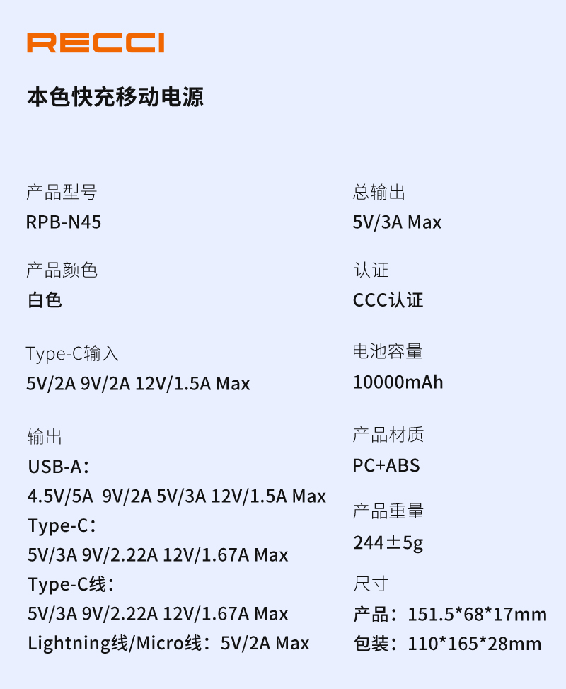 商品名称:Recci/锐思10000mAh本色快充移动电源RPB-N45