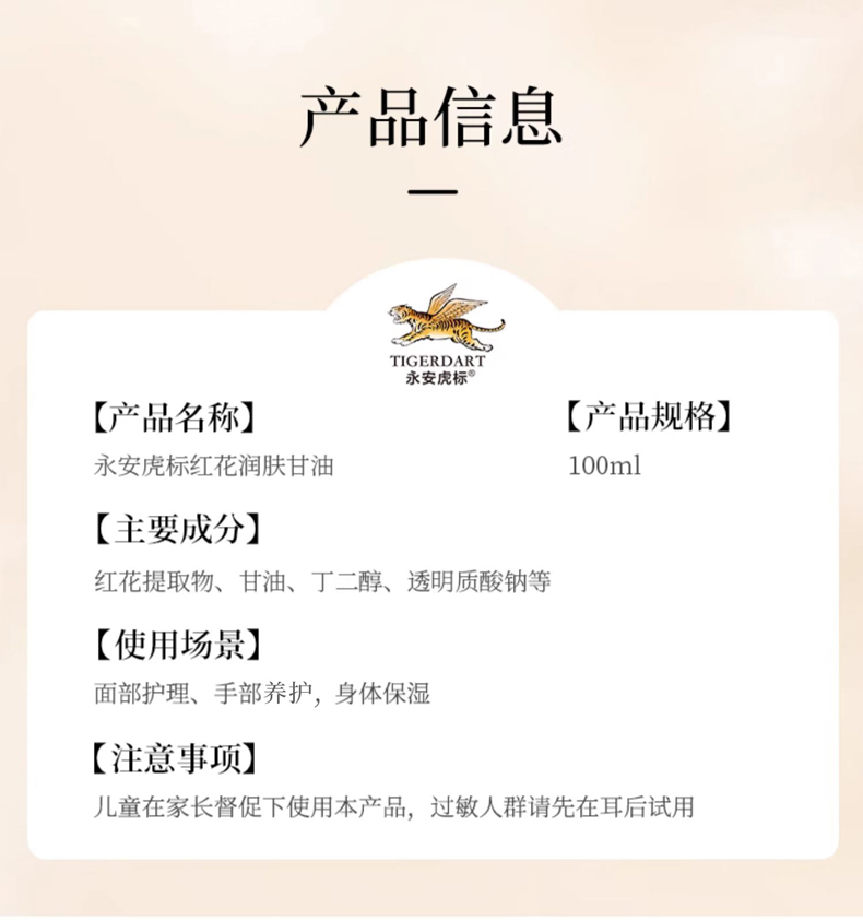 商品名称:TIGER DART/永安虎标红花润肤甘油100ml