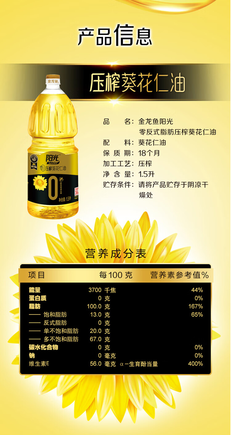商品名称:金龙鱼阳光零反式脂肪压榨葵花仁油礼盒1.5L*4桶