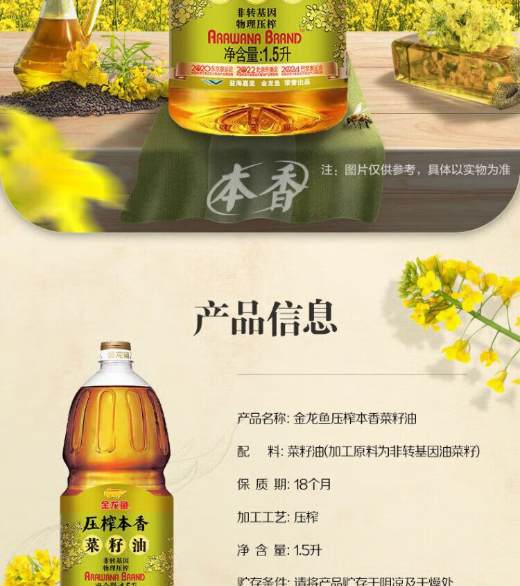 商品名称:金龙鱼压榨本香菜籽油礼盒1.5L*4桶