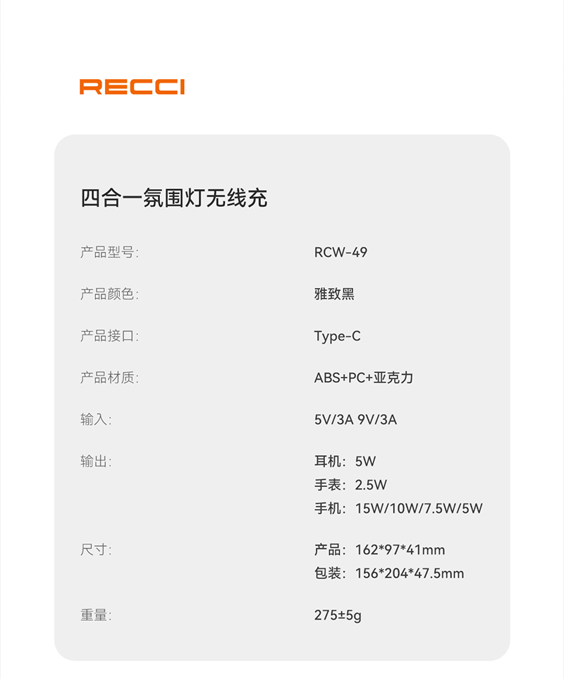 商品名称:Recci/锐思四合一氛围灯无线充RCW-49