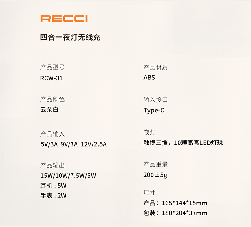 商品名称:Recci/锐思四合一夜灯无线充RCW-31