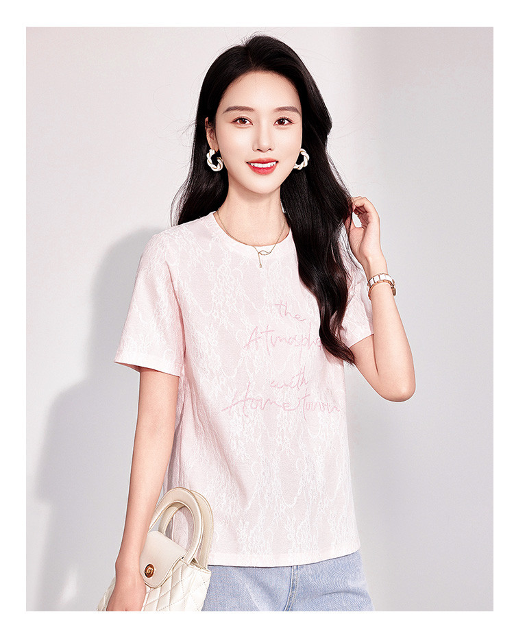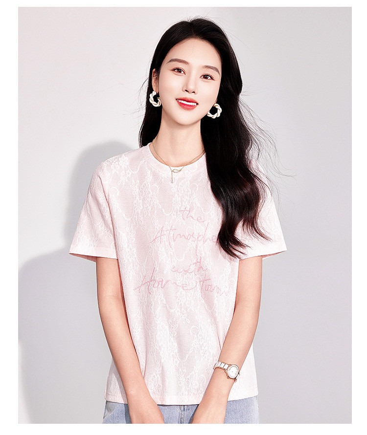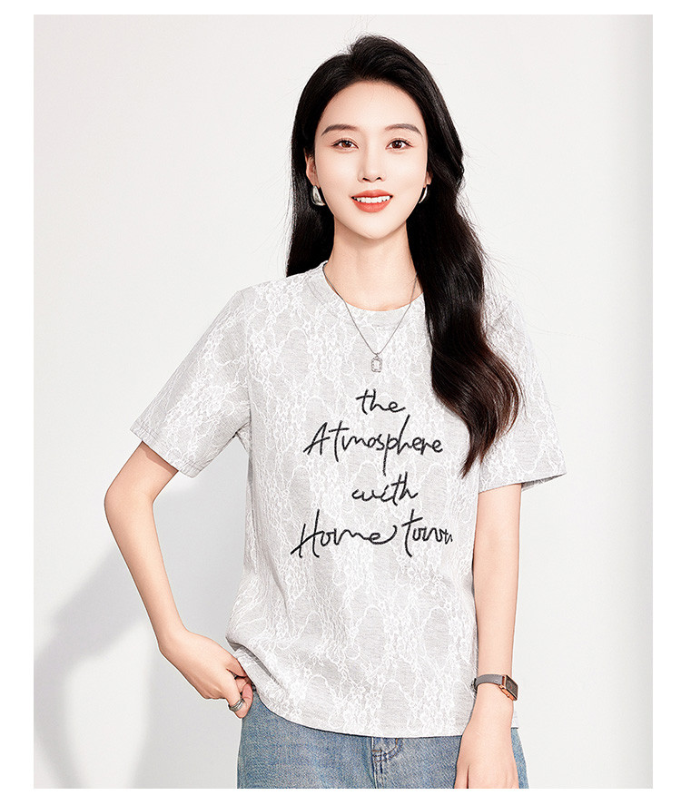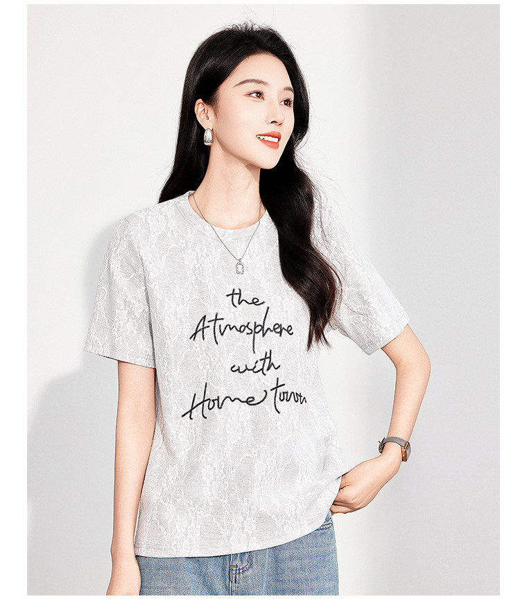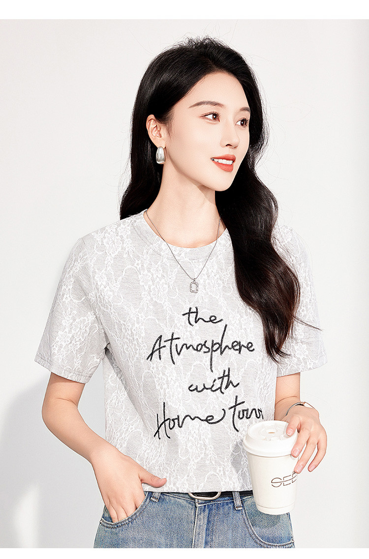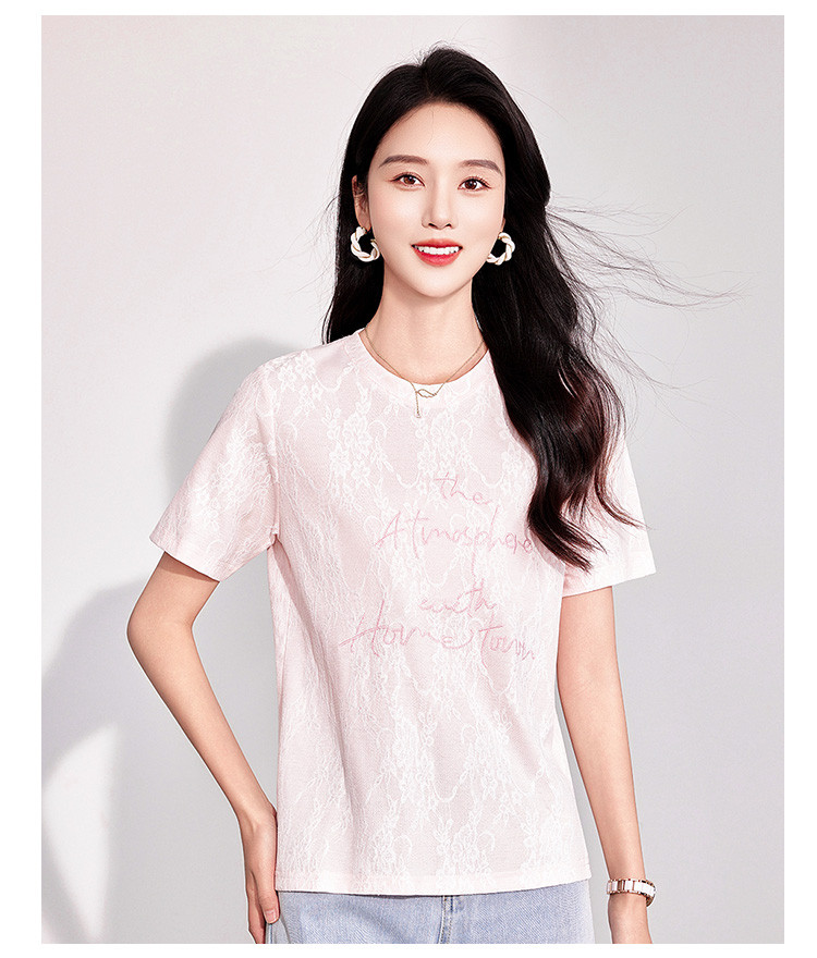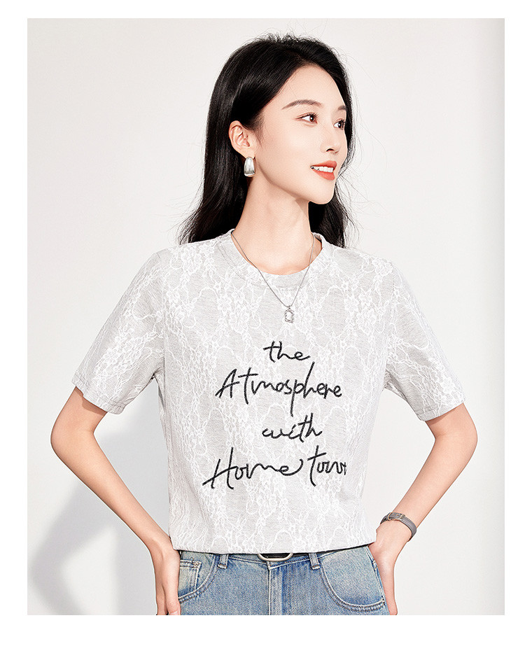 商品名称:25夏季新款韩系高级感蕾丝压纱上衣女式温柔字母刺绣短袖T恤 290463