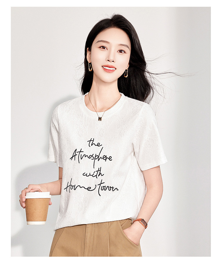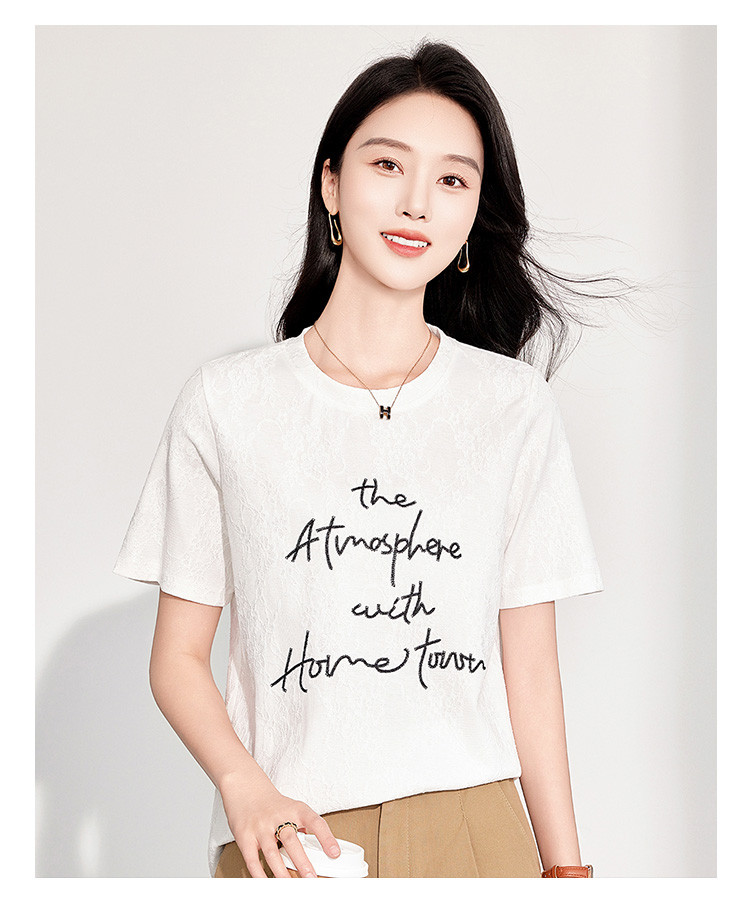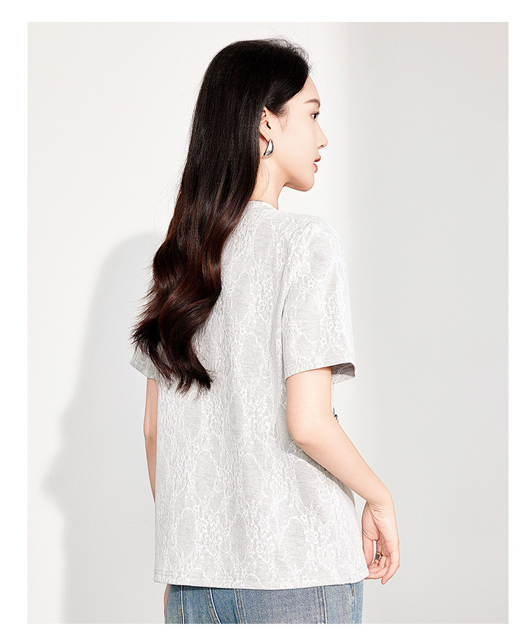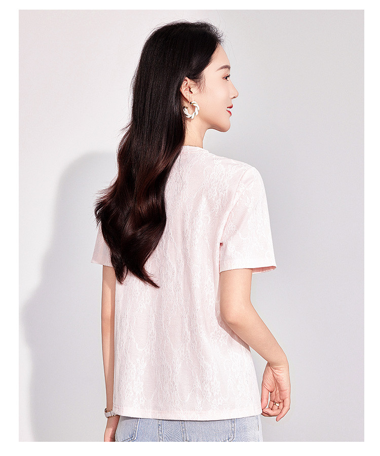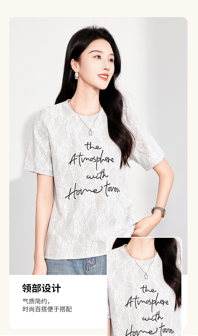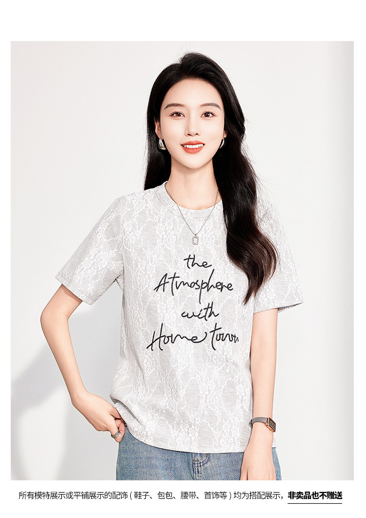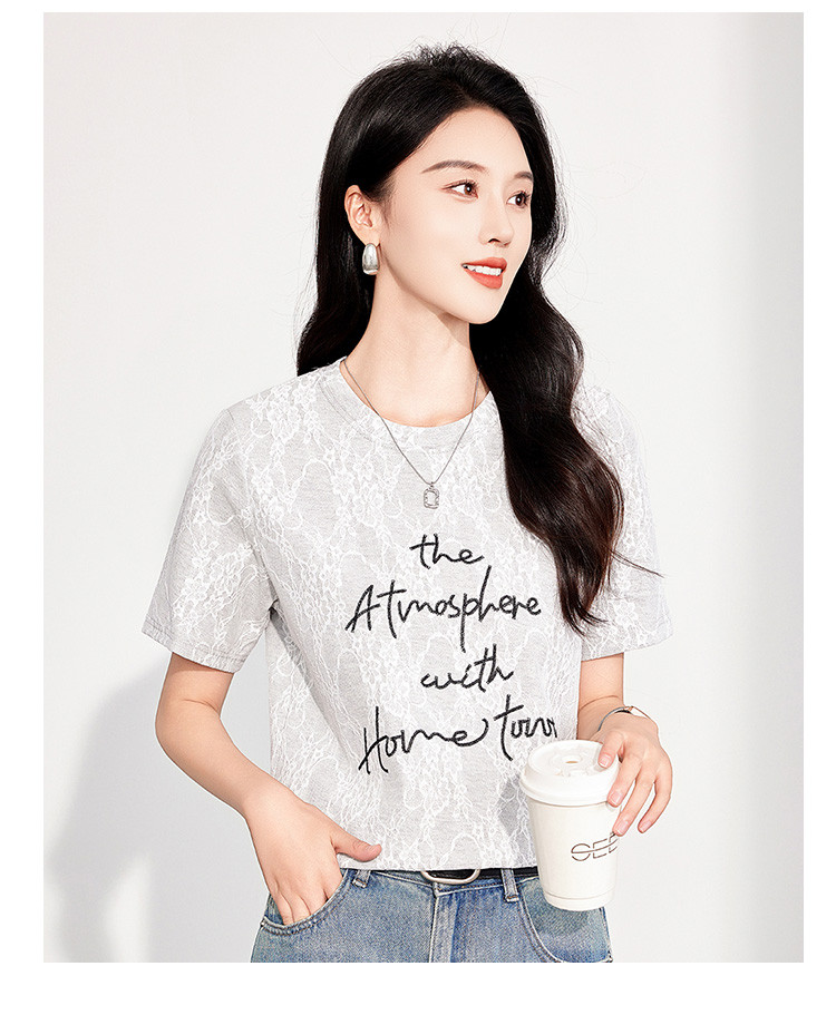 商品名称:25夏季新款韩系高级感蕾丝压纱上衣女式温柔字母刺绣短袖T恤 290463