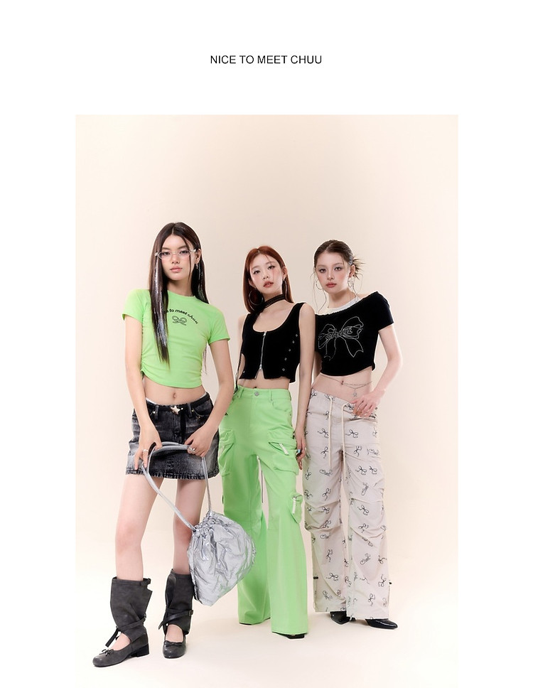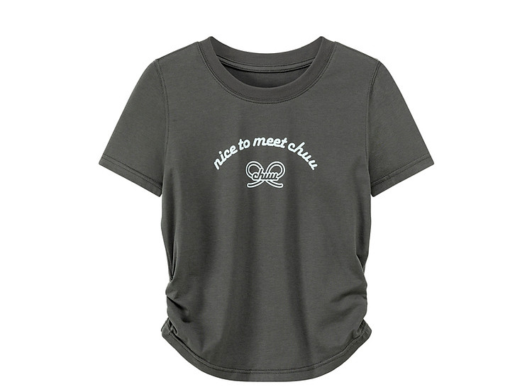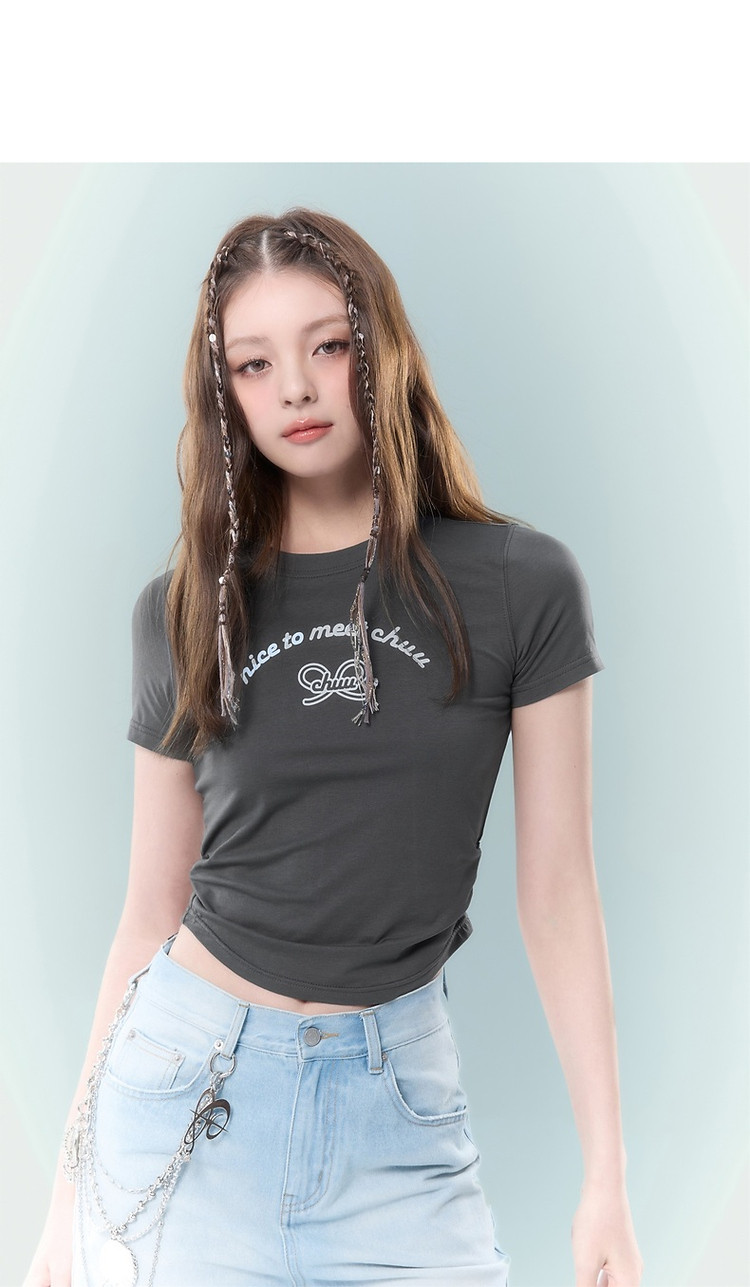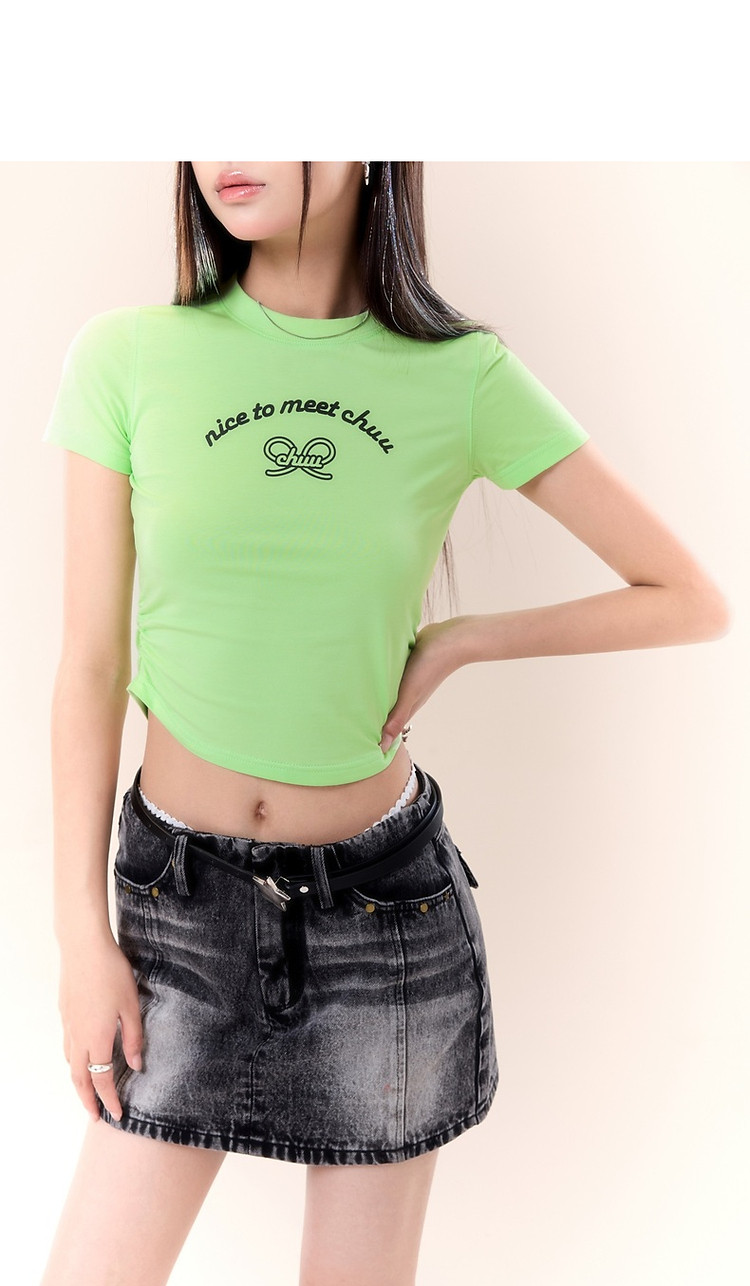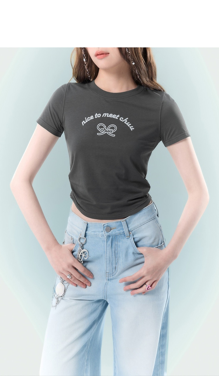 字母蝴蝶结T恤女2025夏甜美减龄设计感褶皱修身上衣 877907