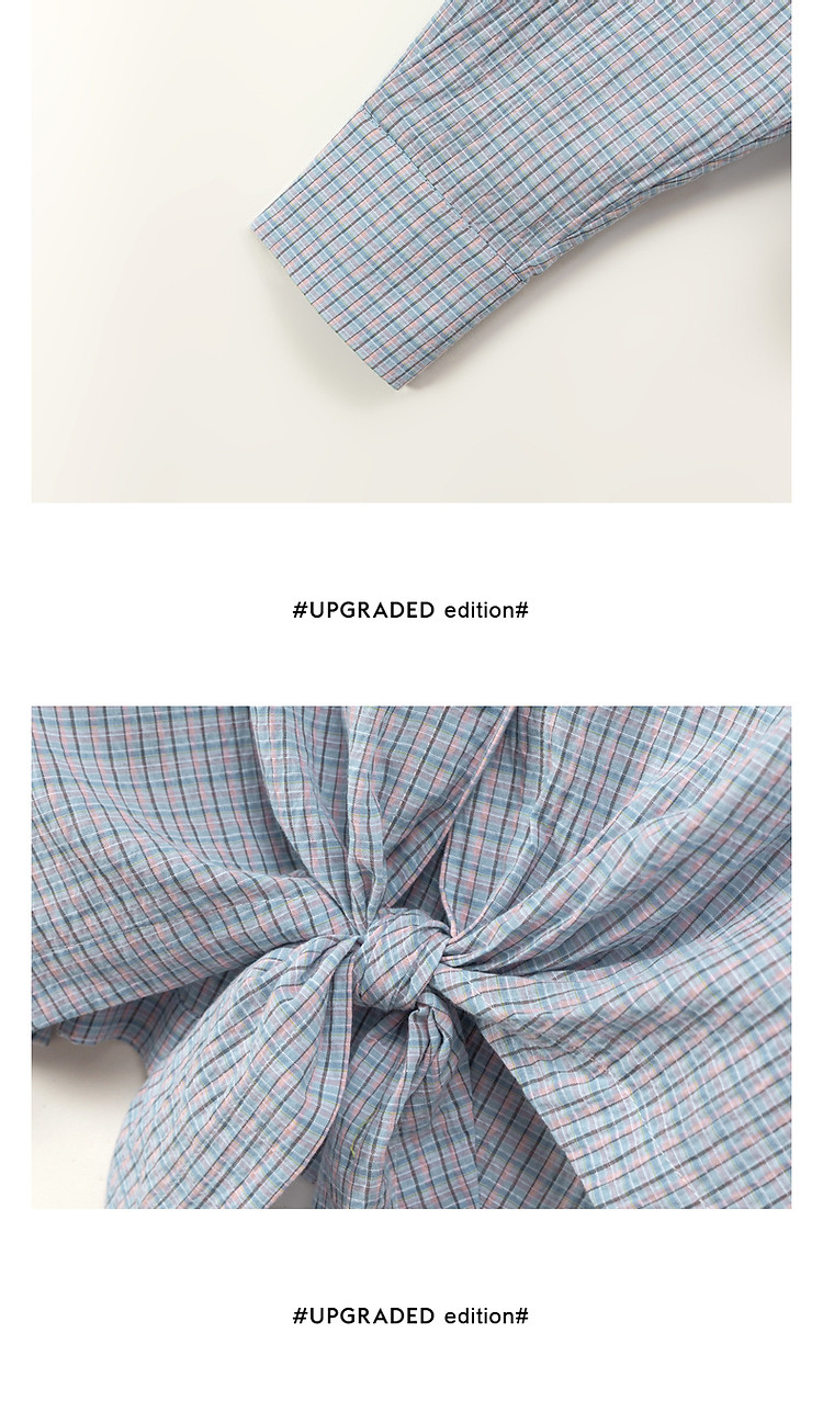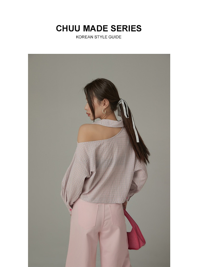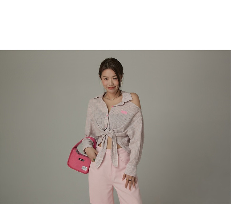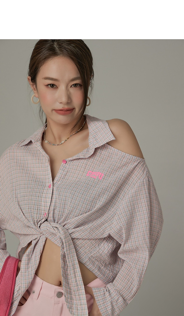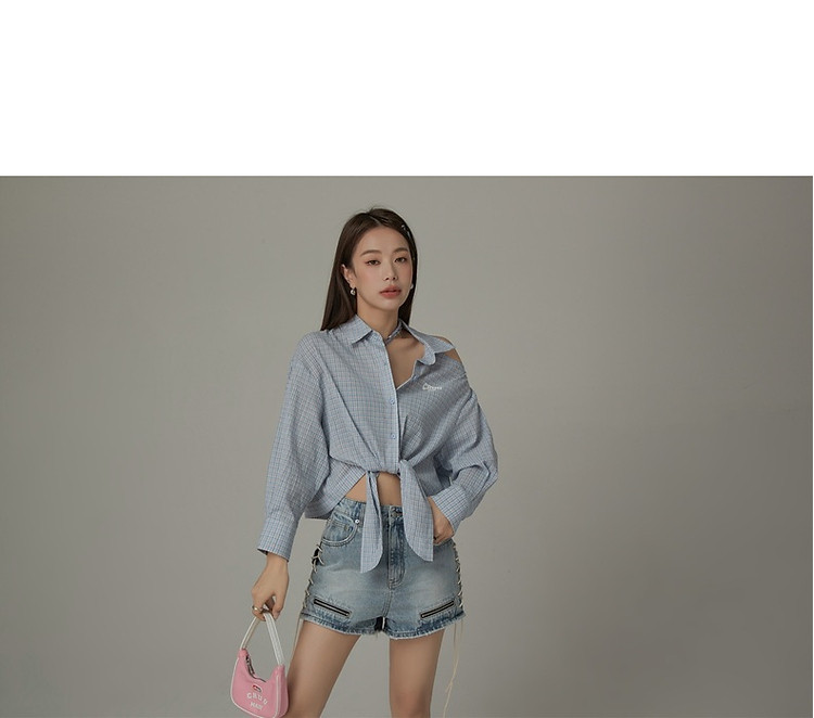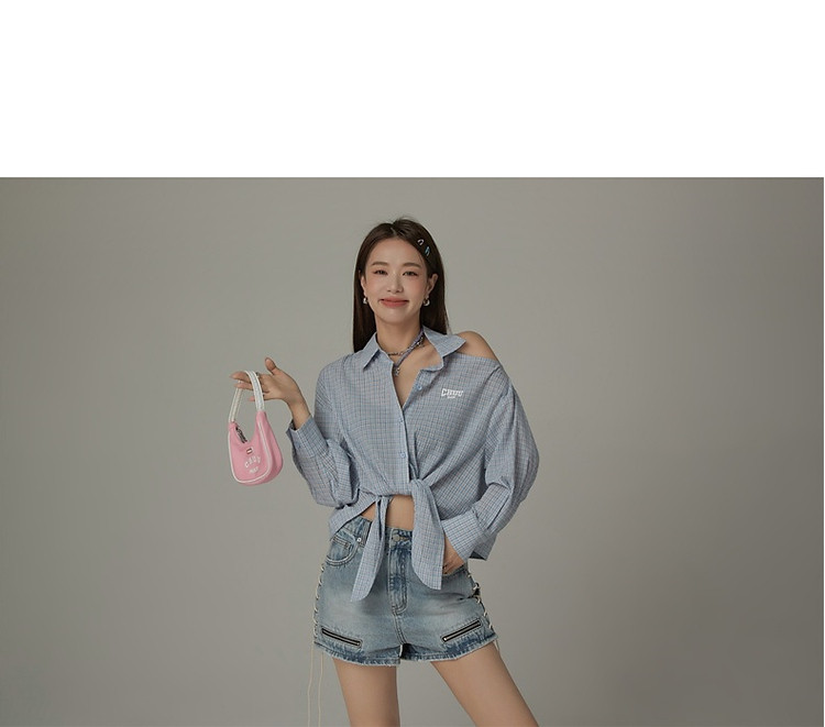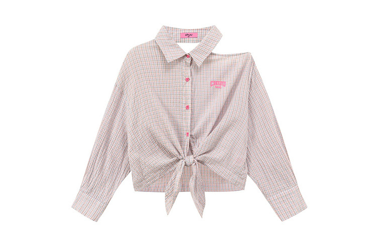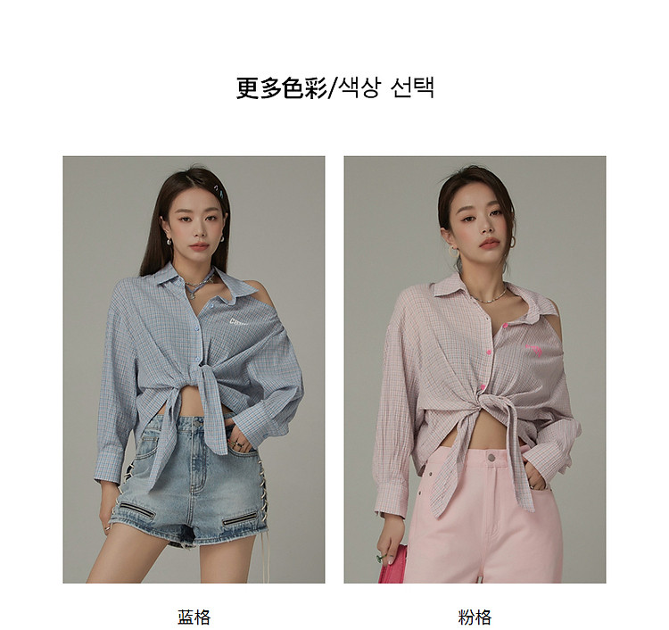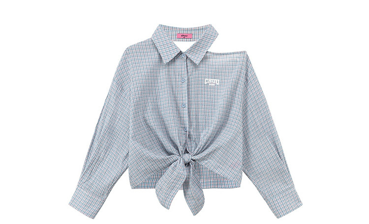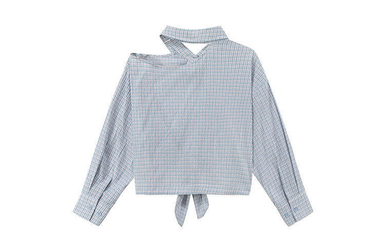 商品名称:格子露肩衬衫女士夏字母系带不规则长袖开衫上衣 062291