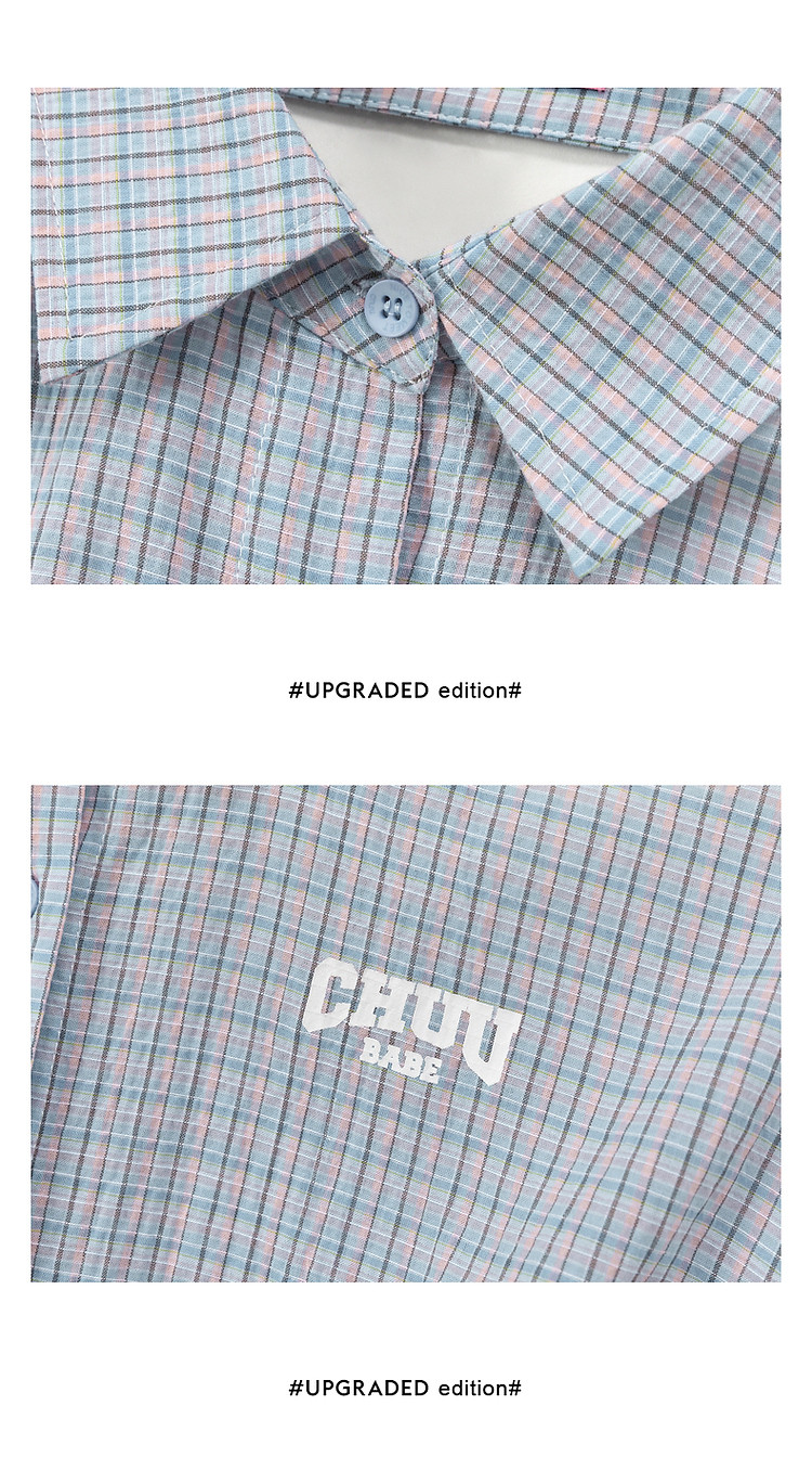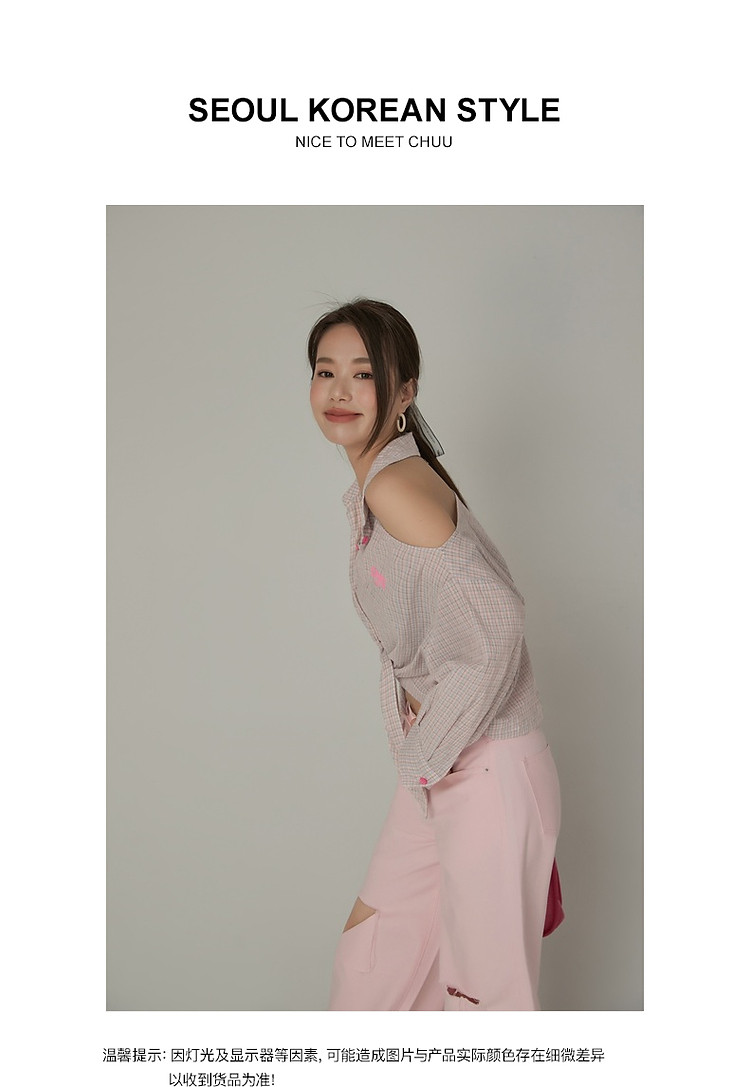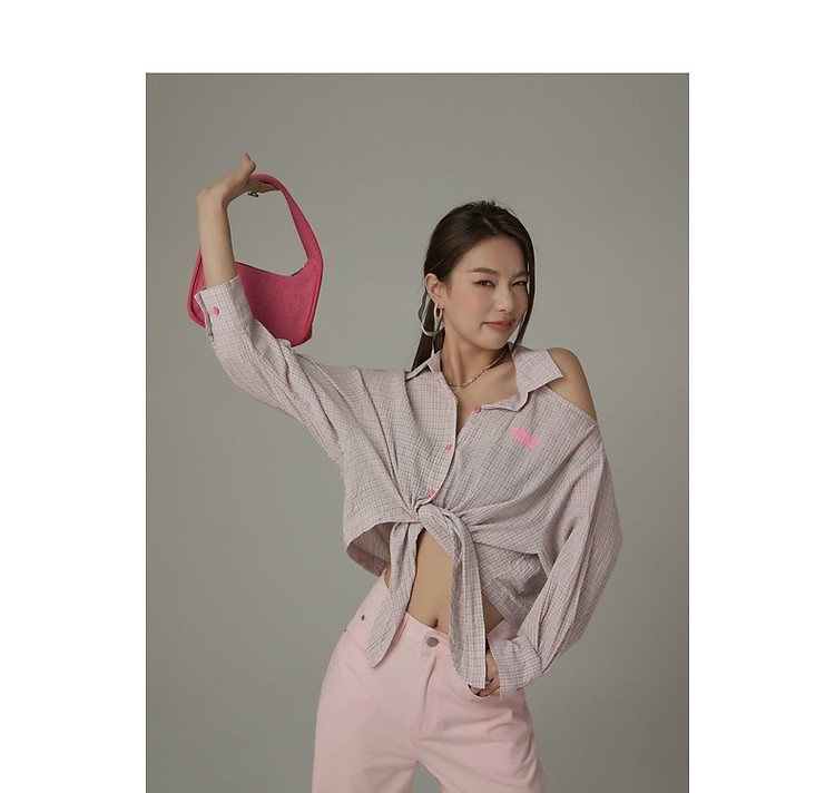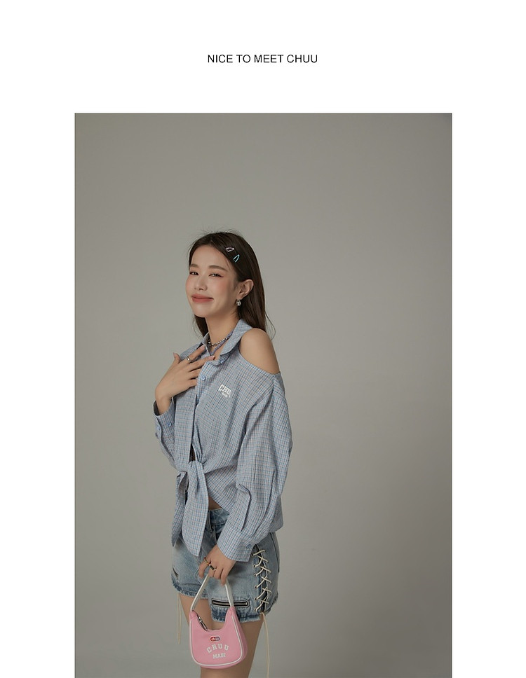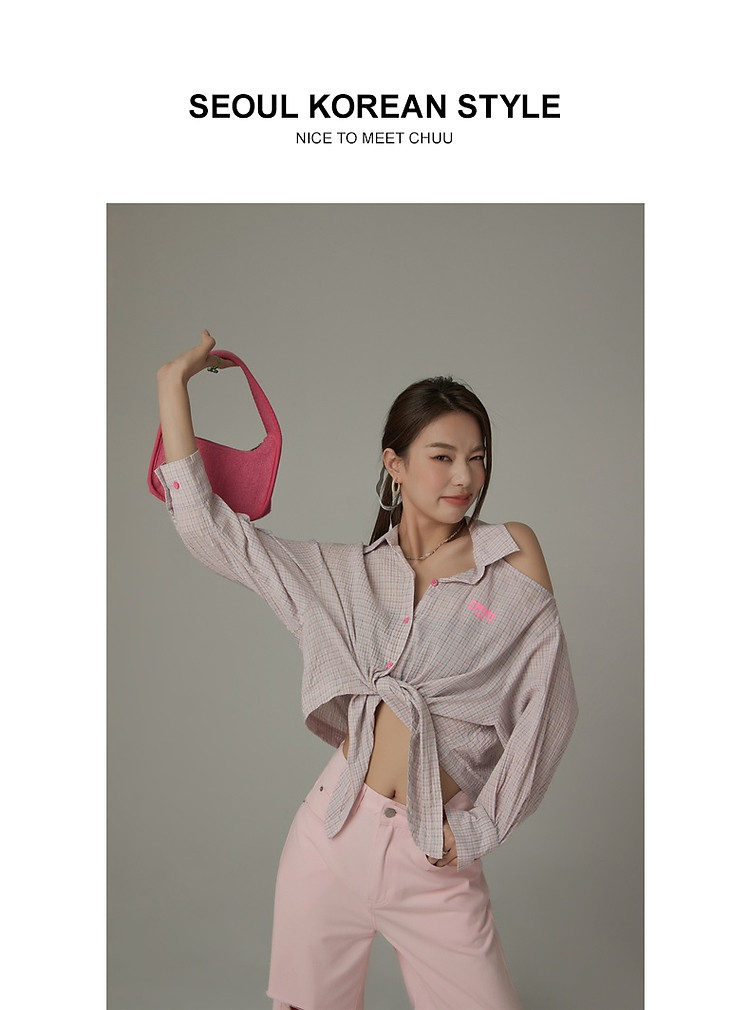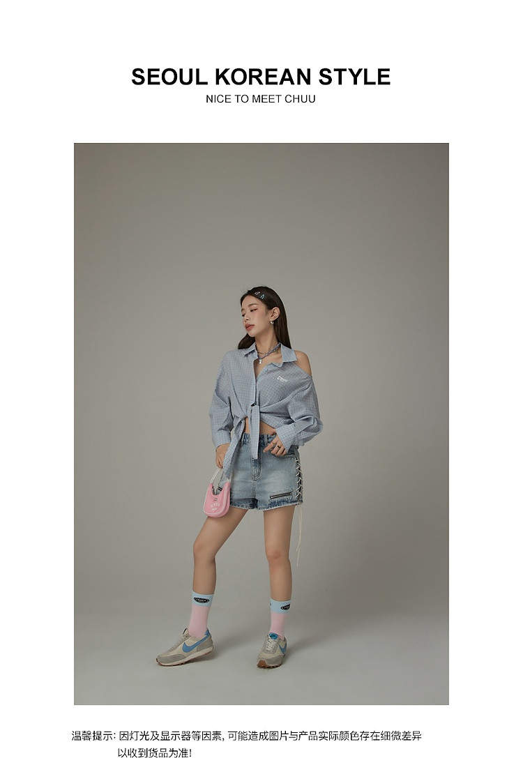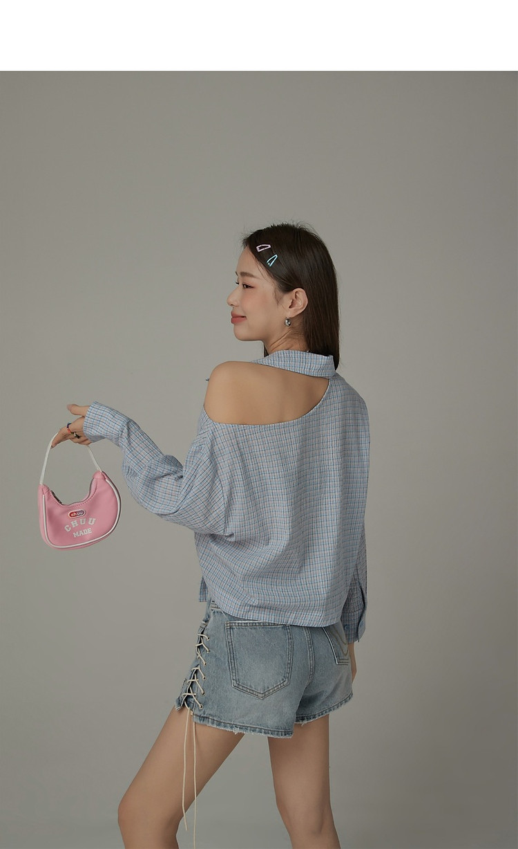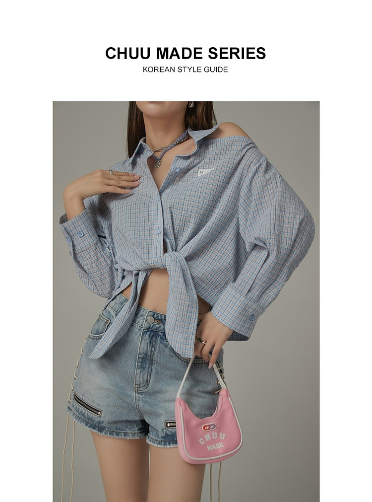 商品名称:格子露肩衬衫女士夏字母系带不规则长袖开衫上衣 062291