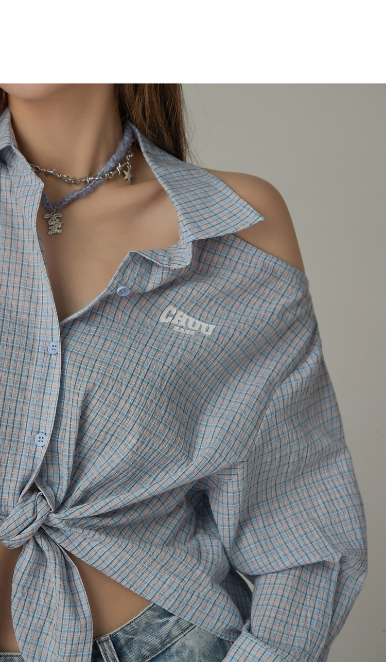 格子露肩衬衫女士夏字母系带不规则长袖开衫上衣 062291