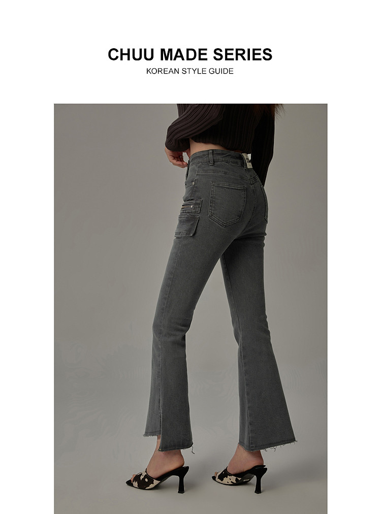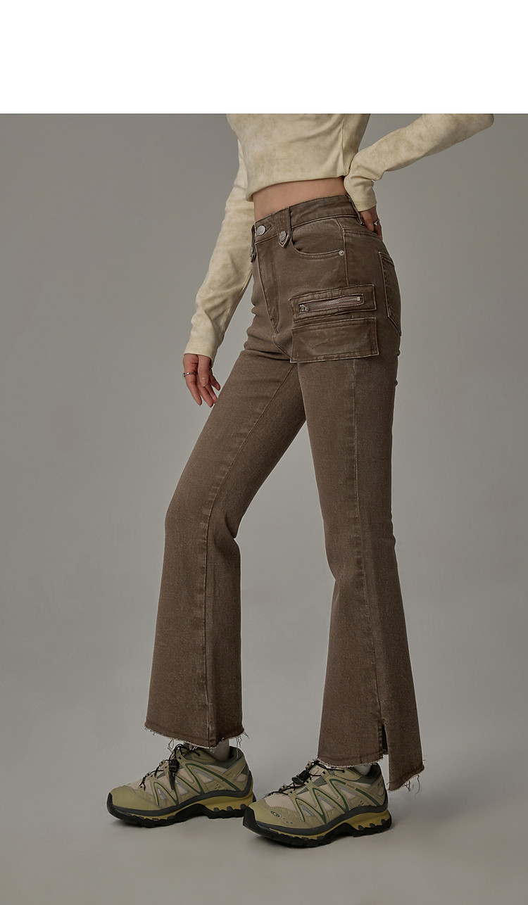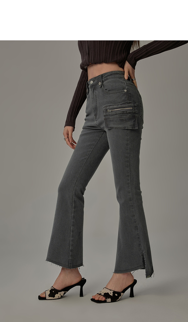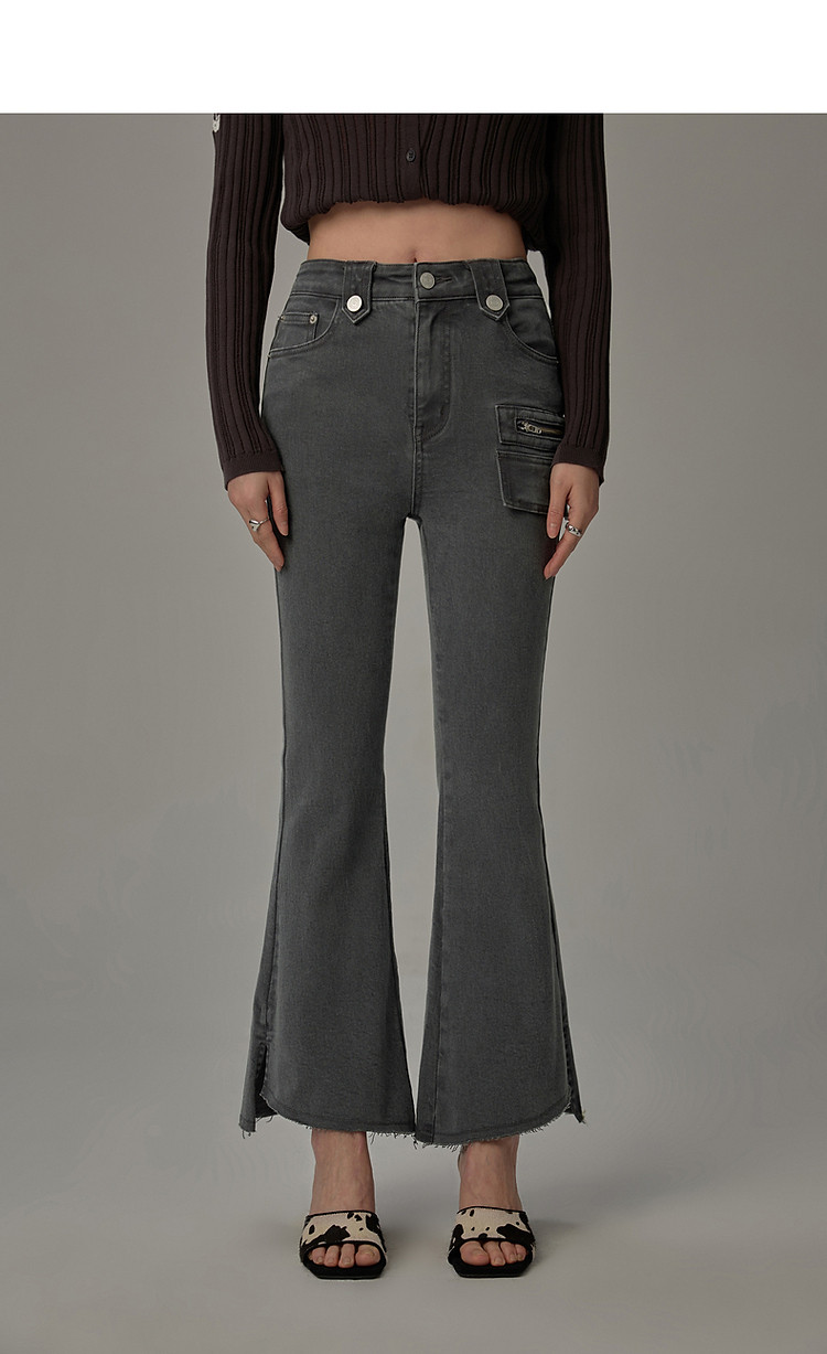 开叉微喇牛仔裤女2025夏毛边不对称口袋修身九分裤子 515923