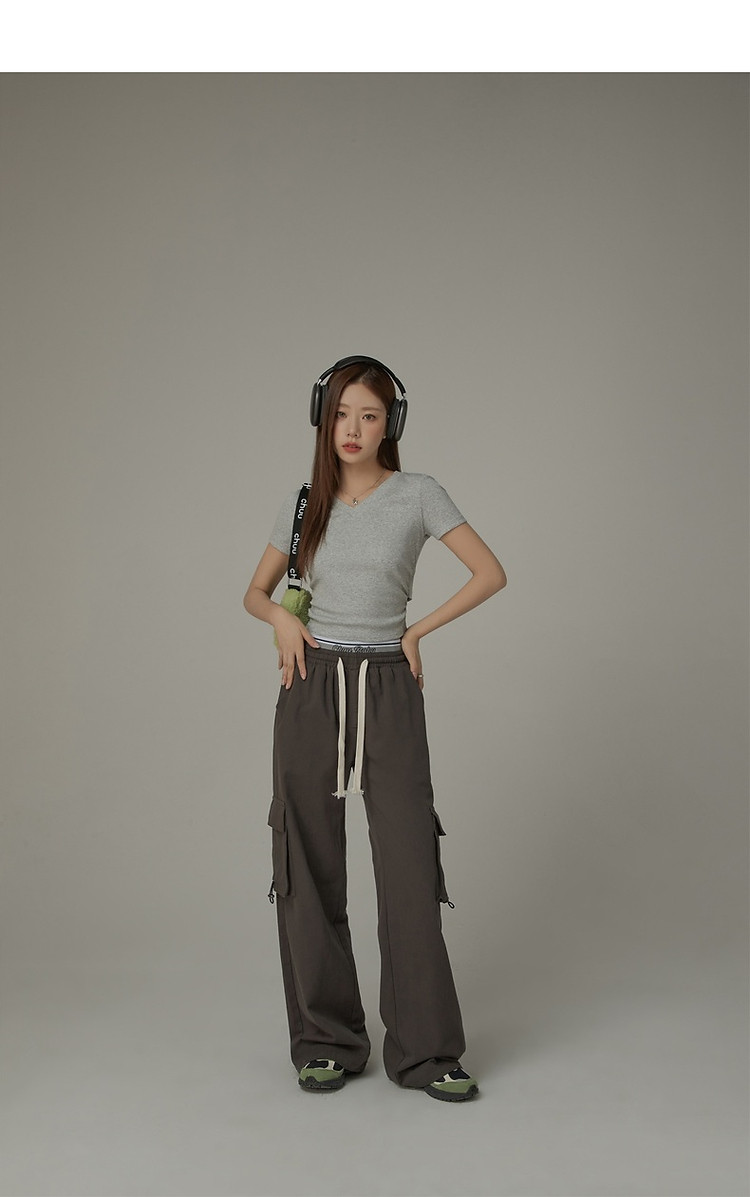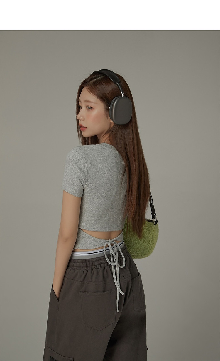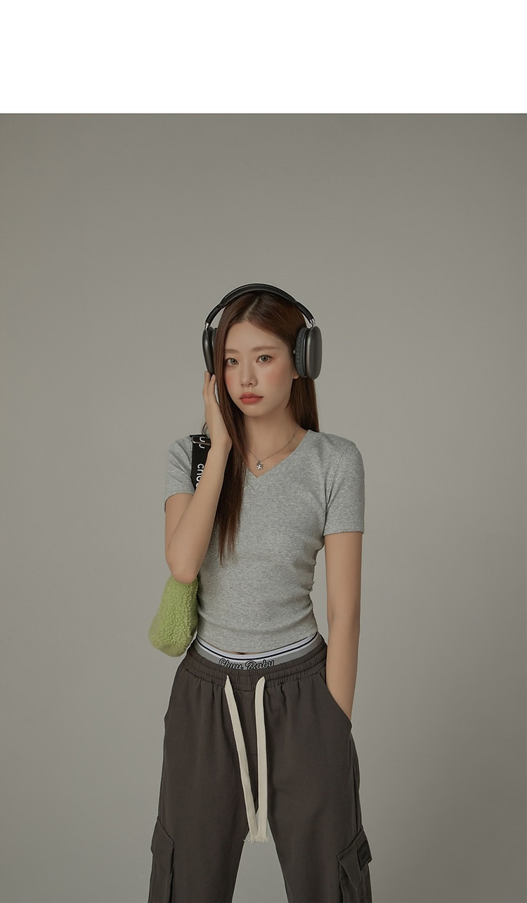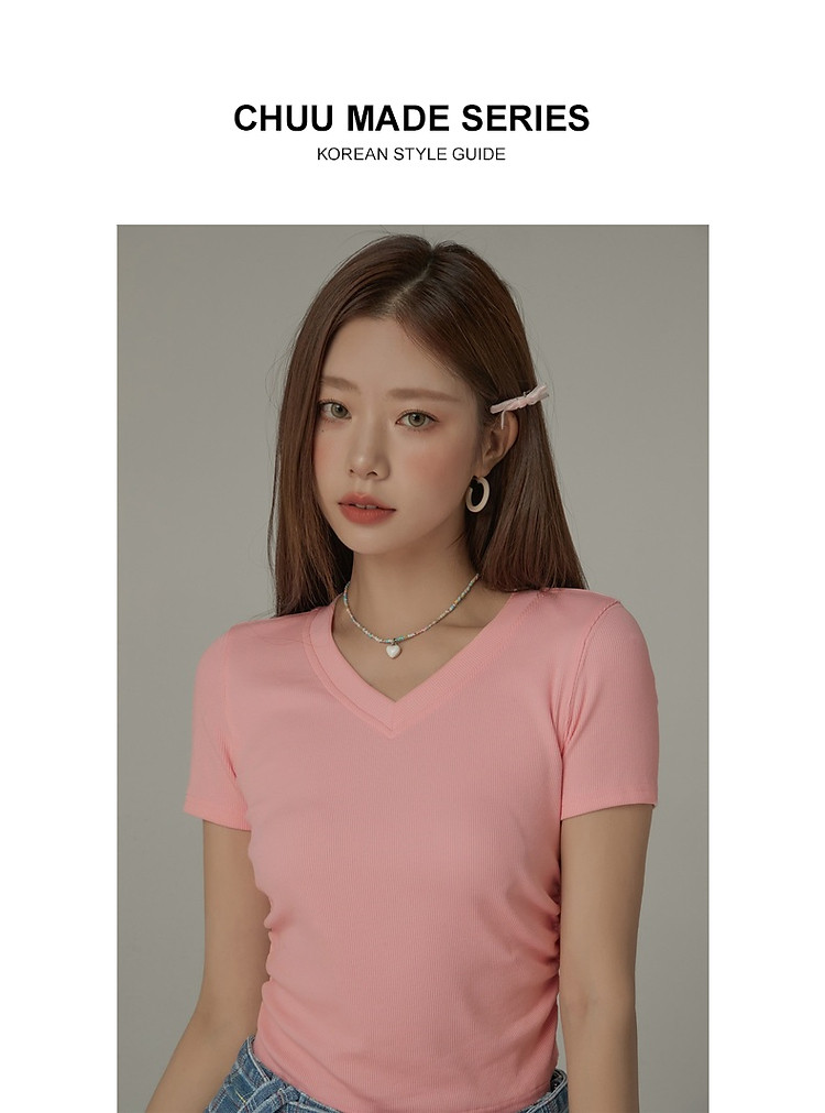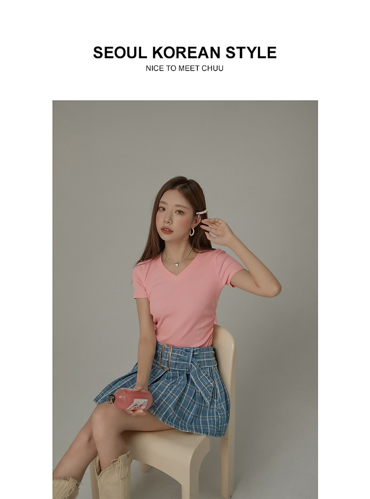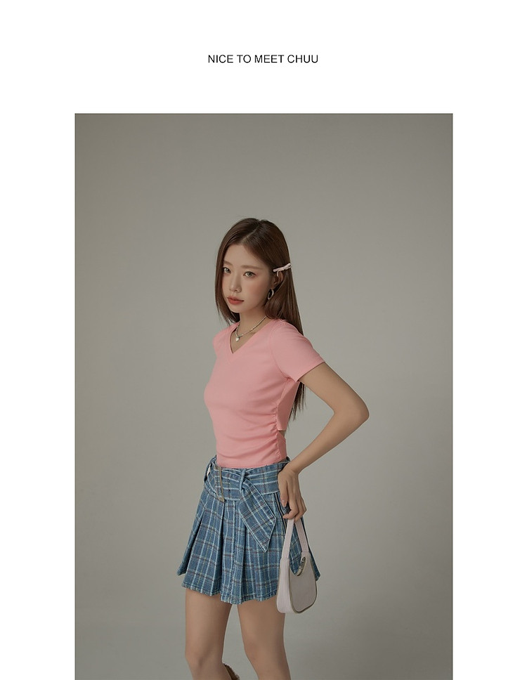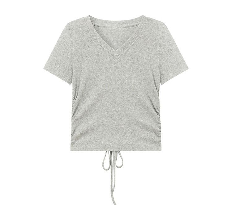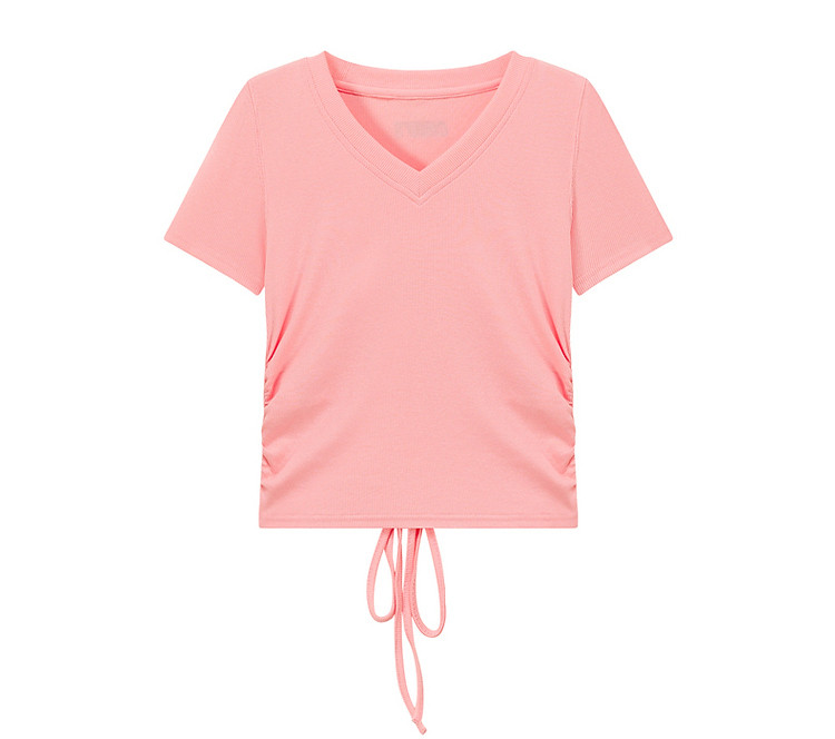 商品名称:正肩短袖T恤女秋字母镂空系带抽褶V领纯色上衣薄 145491