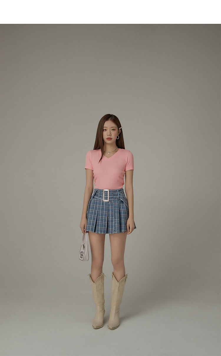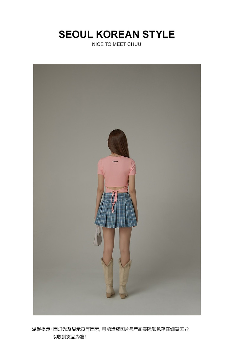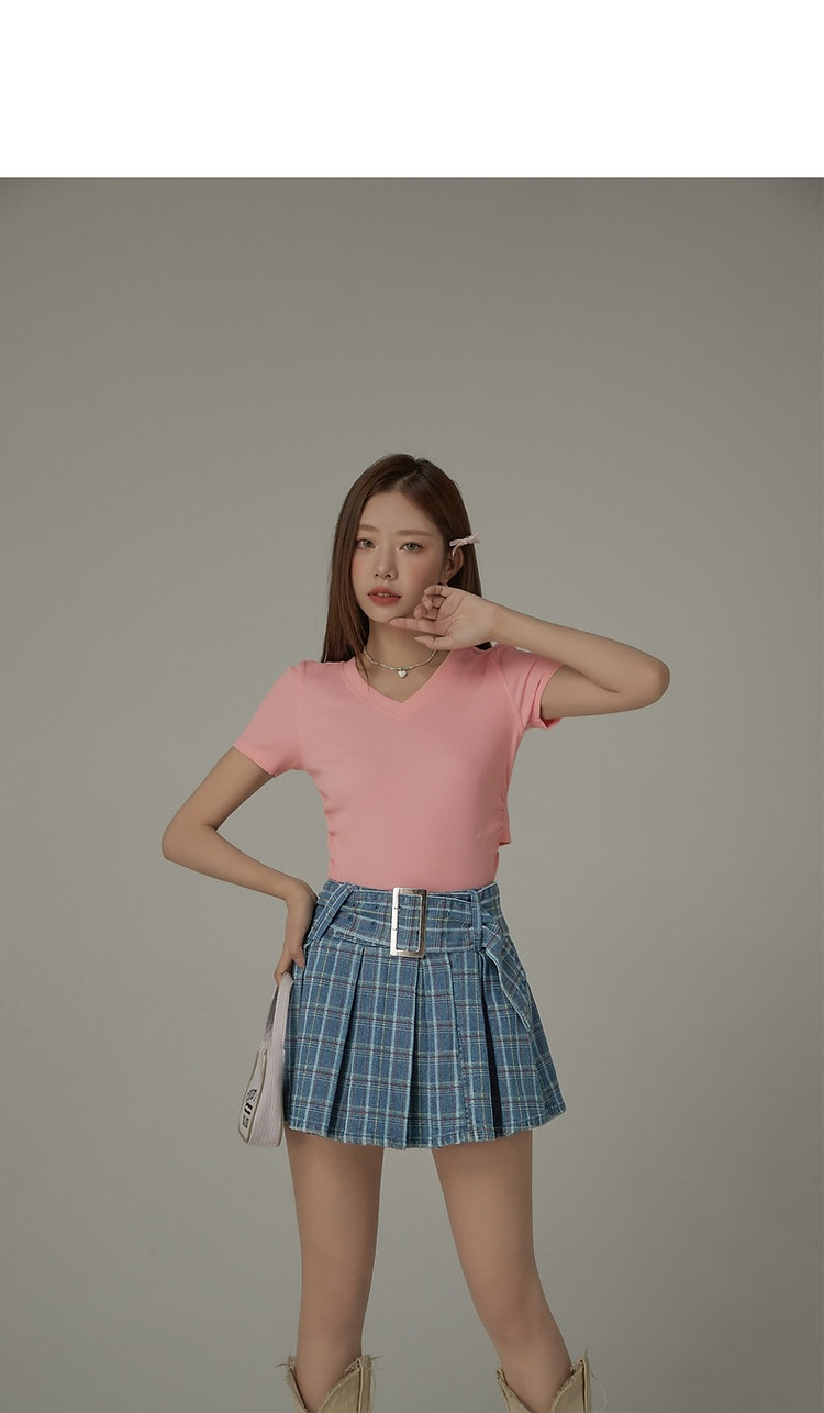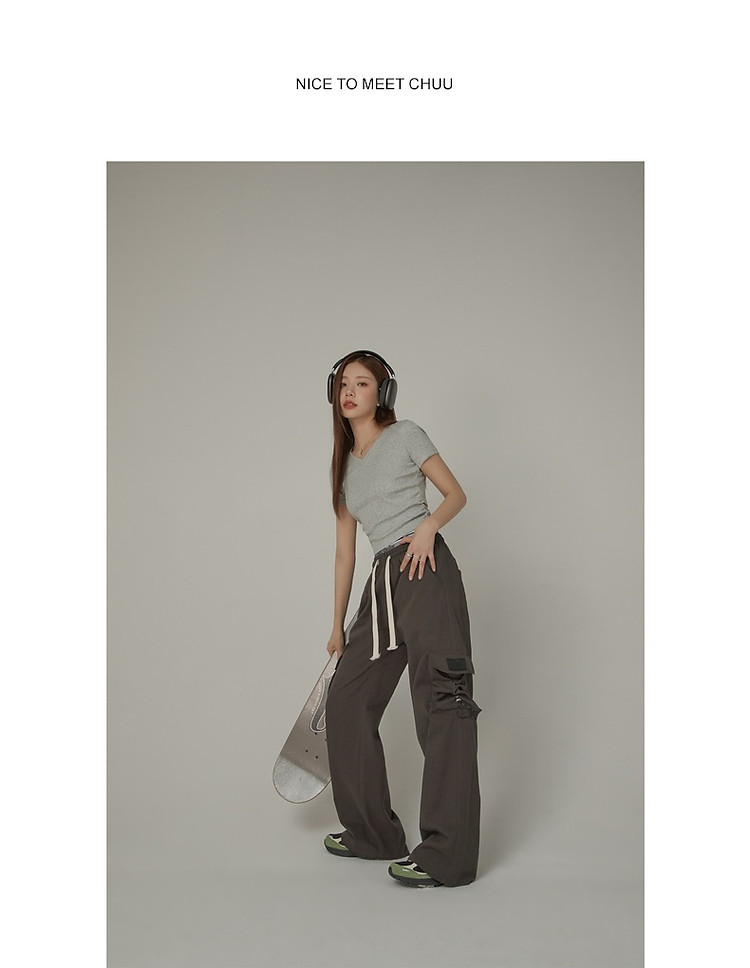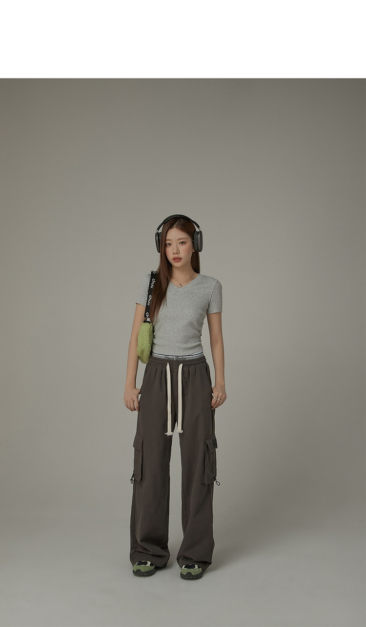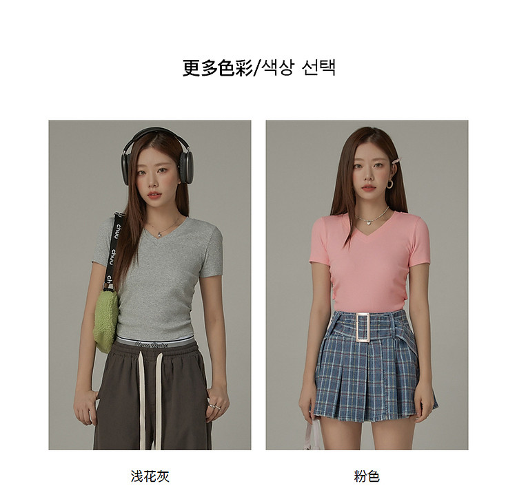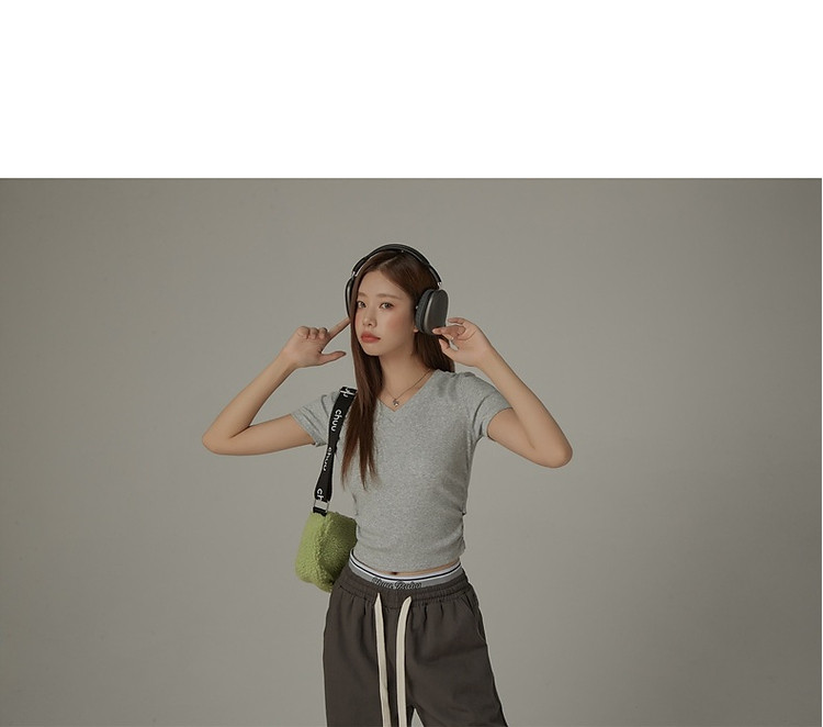 商品名称:正肩短袖T恤女秋字母镂空系带抽褶V领纯色上衣薄 145491