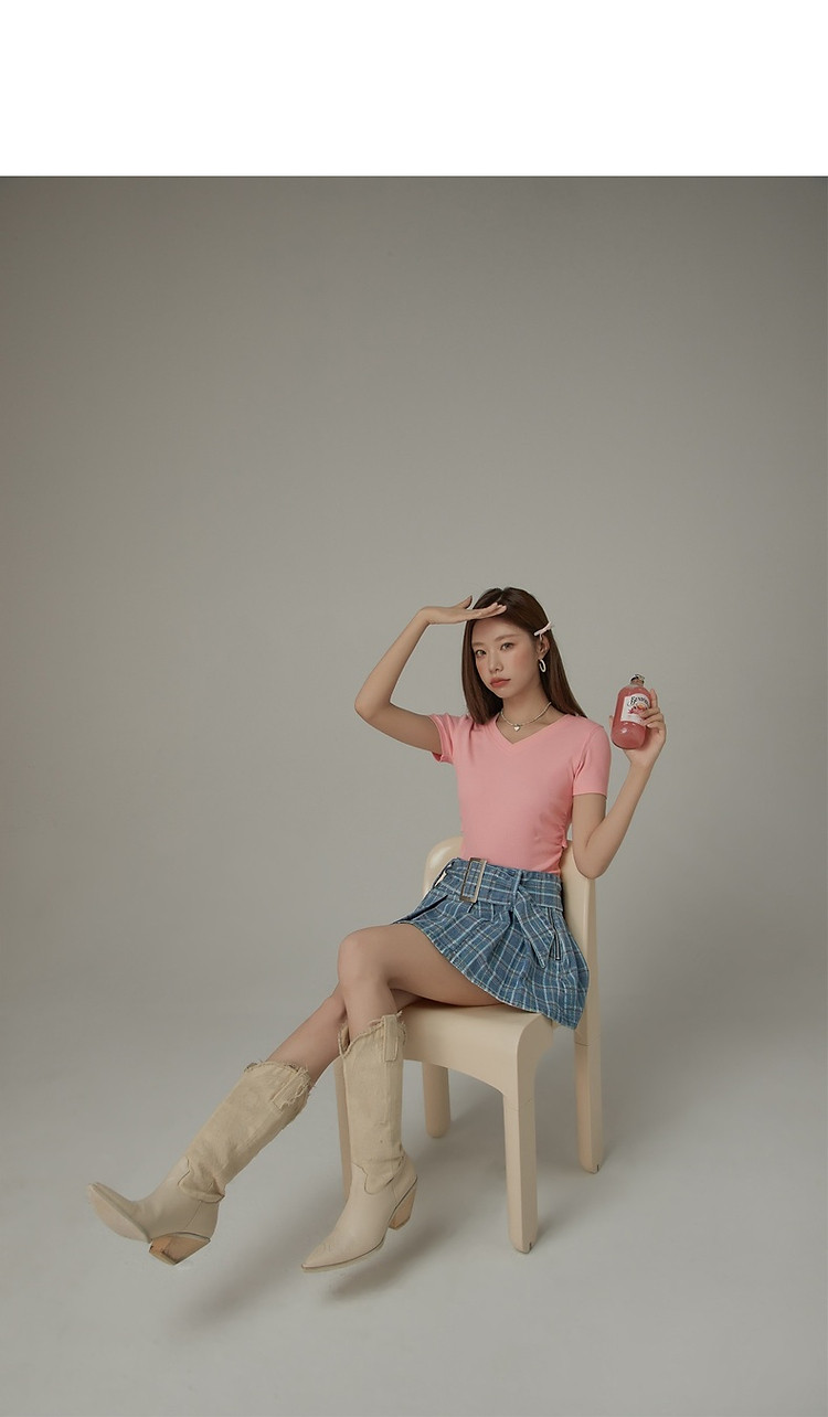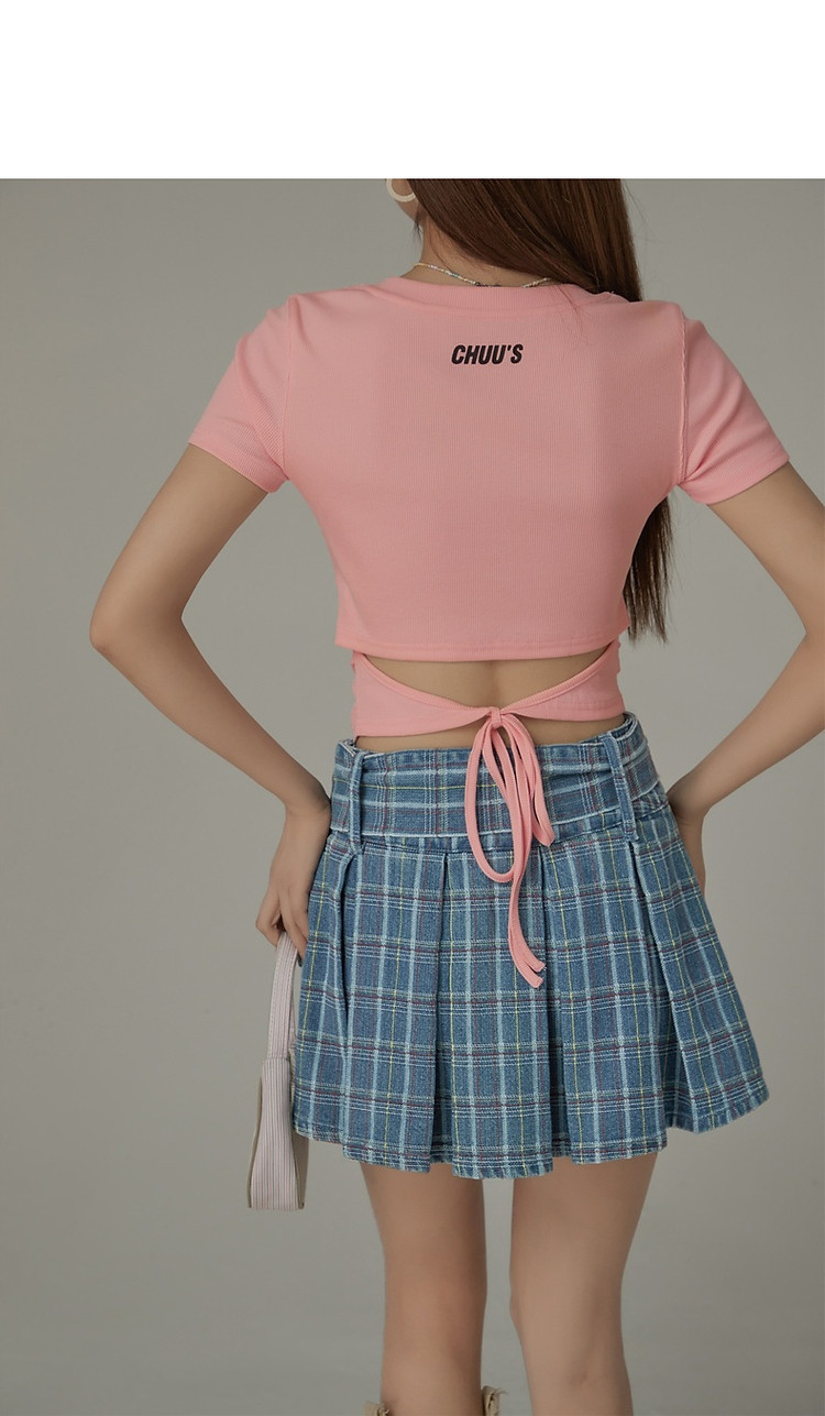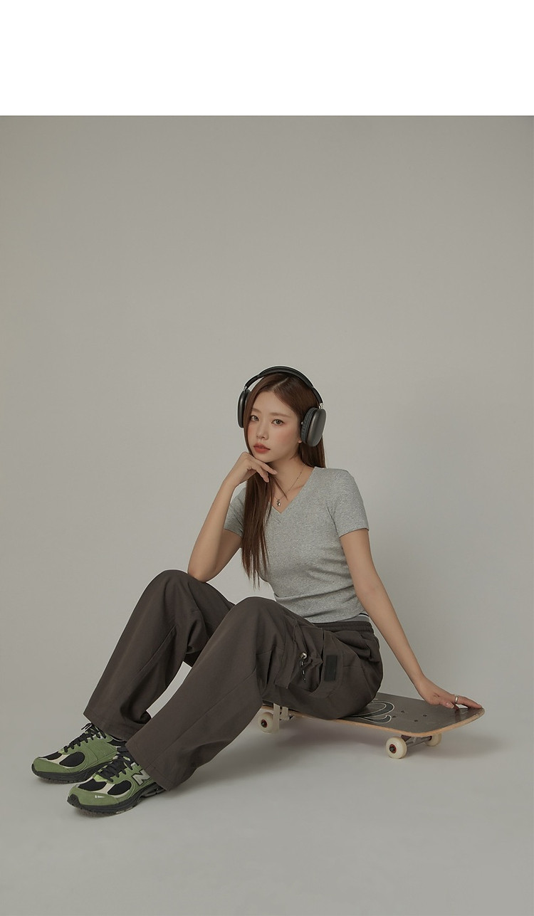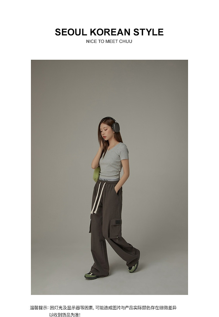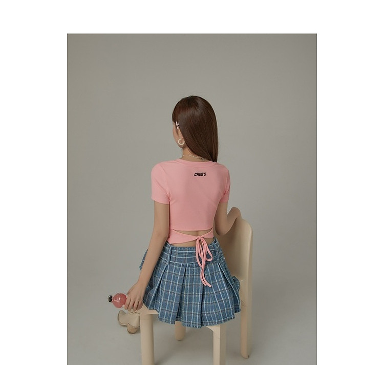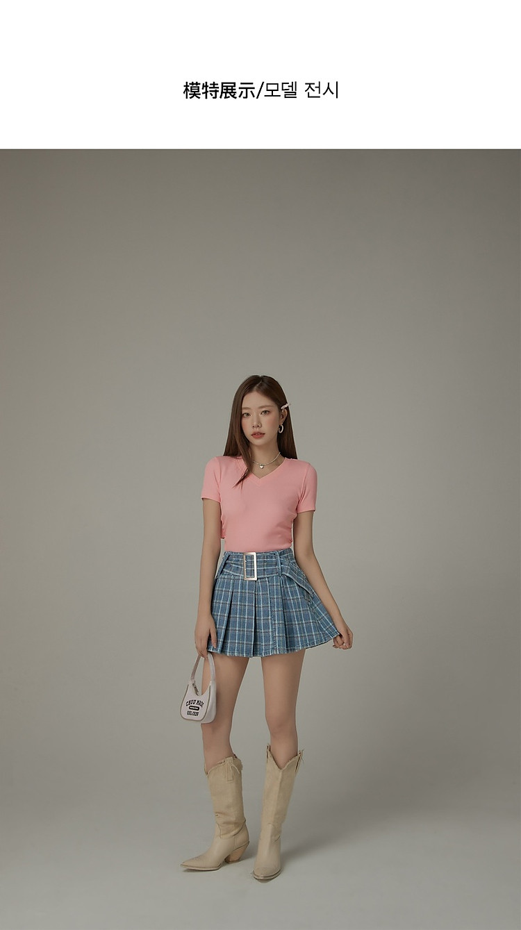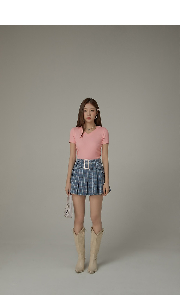 商品名称:正肩短袖T恤女秋字母镂空系带抽褶V领纯色上衣薄 145491
