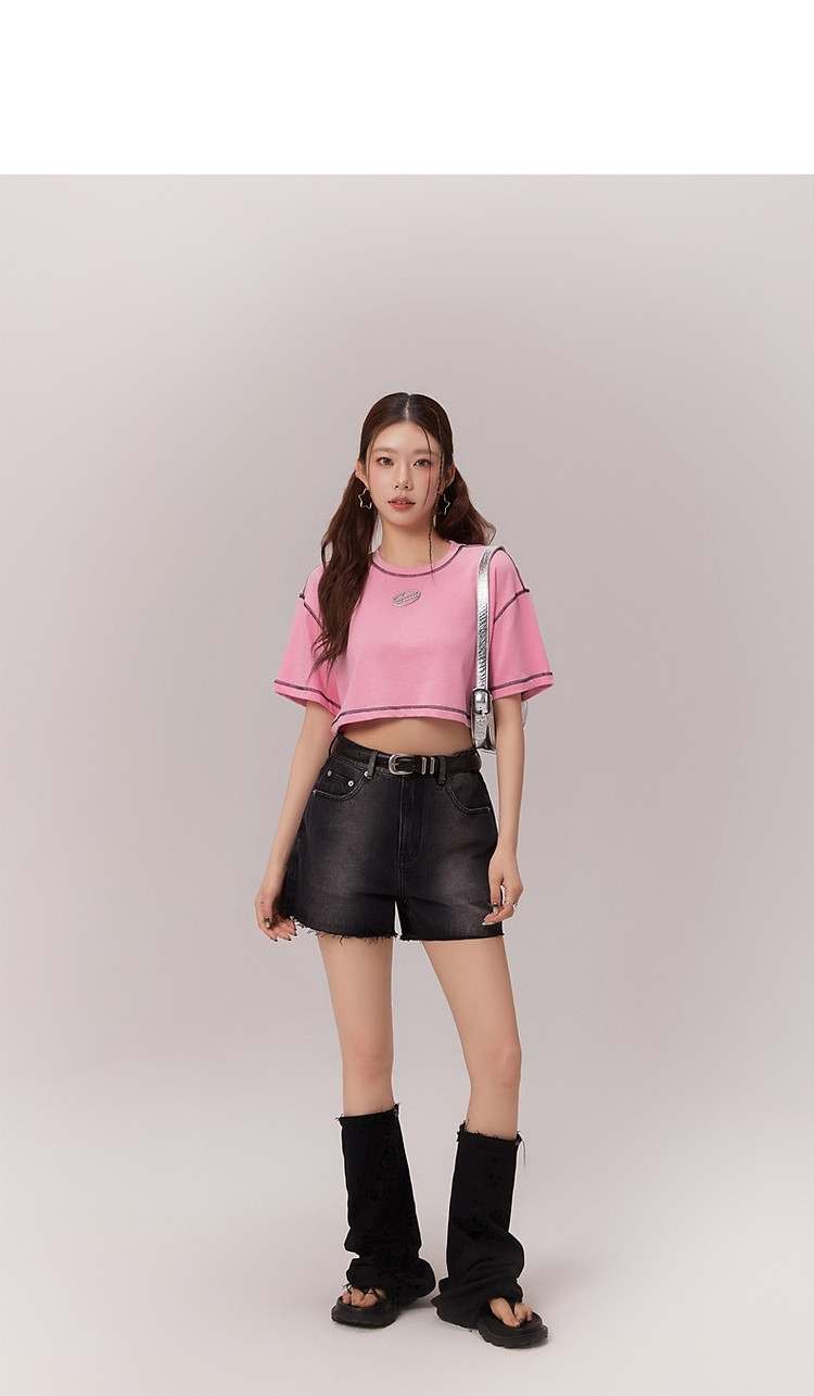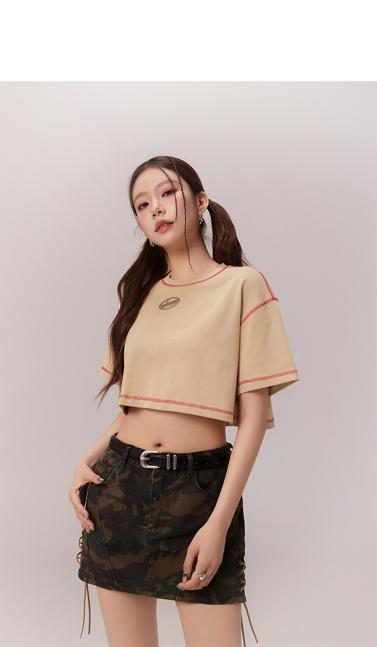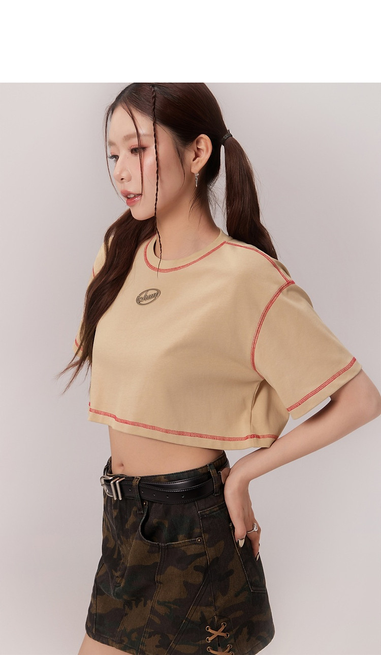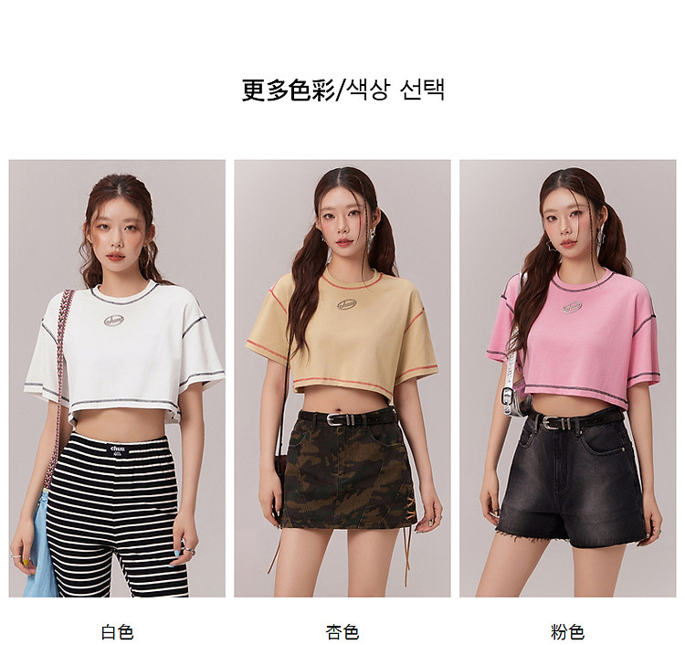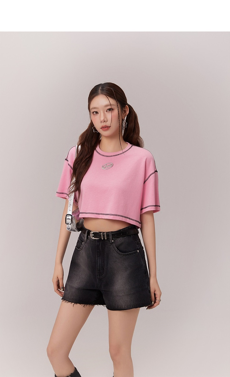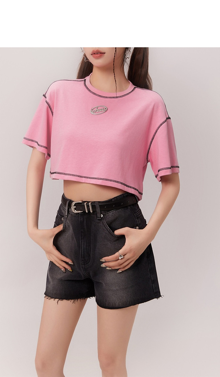 明线撞色落肩袖T恤女2025夏基础辣妹宽松露脐短款上衣 922963