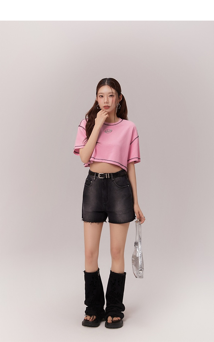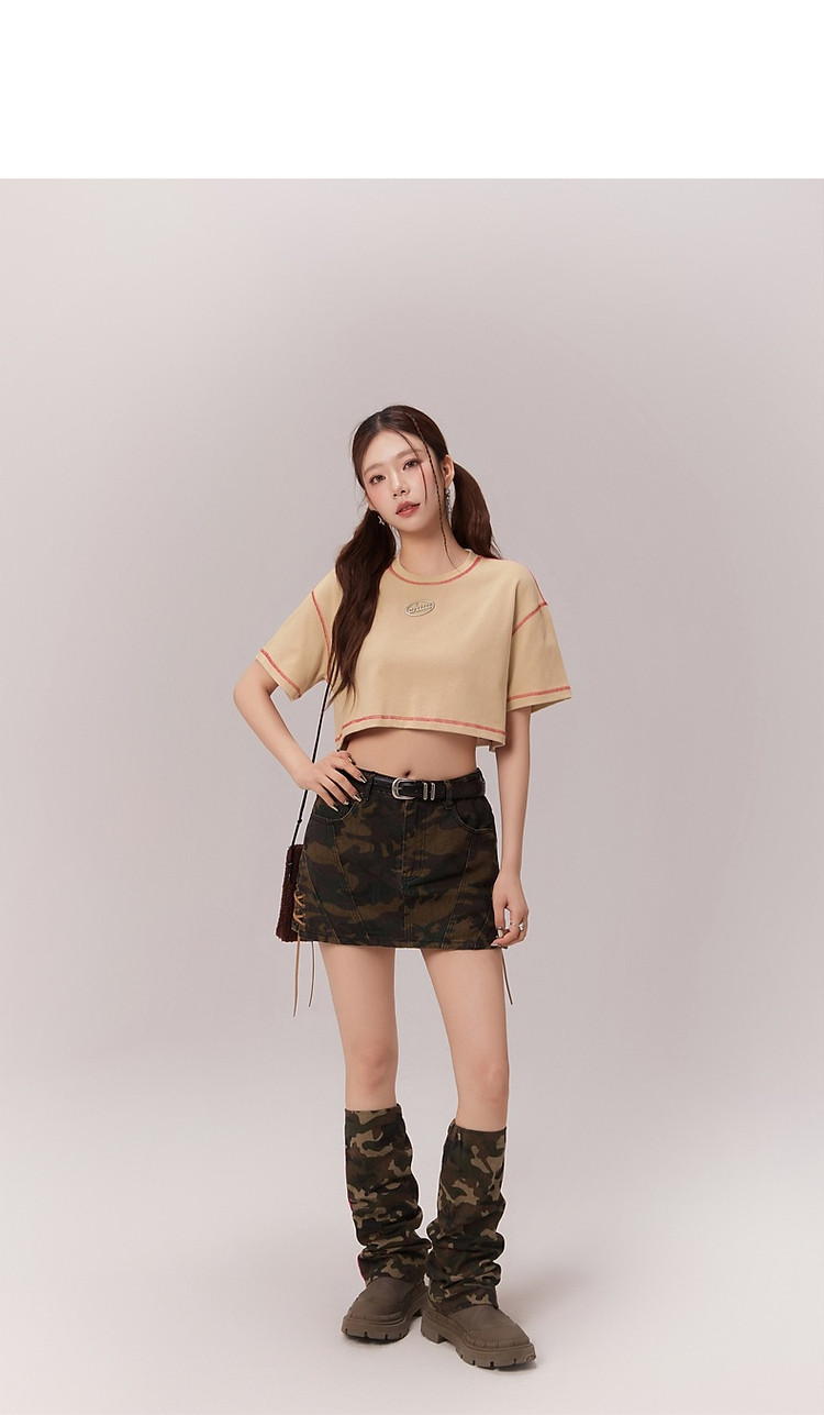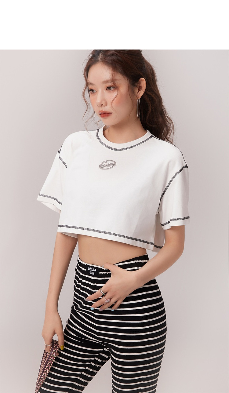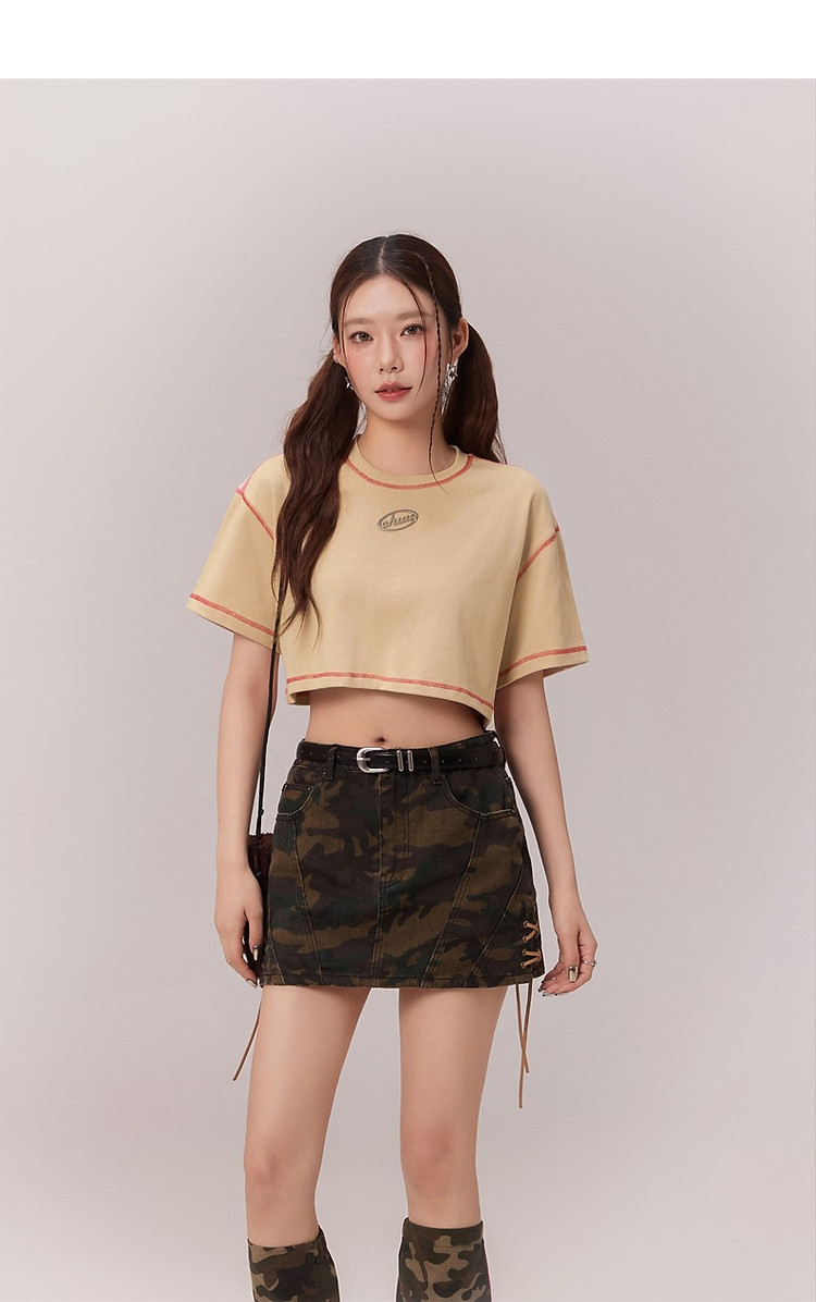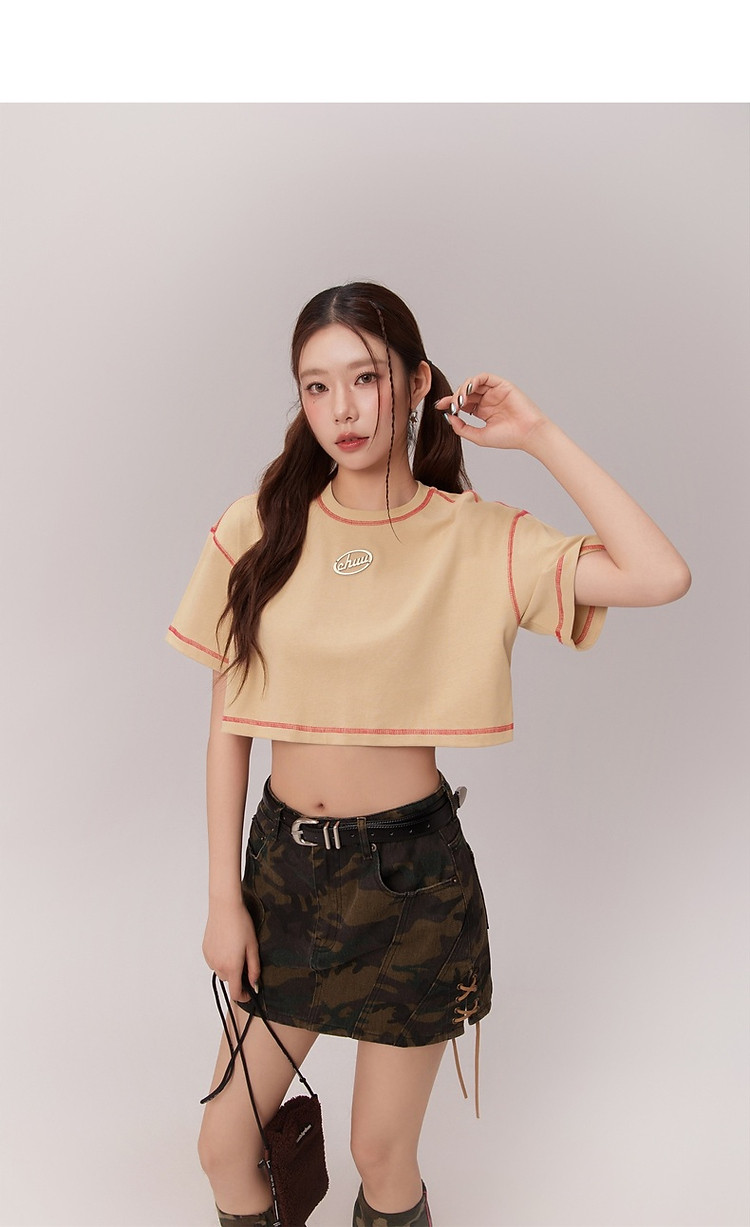 明线撞色落肩袖T恤女2025夏基础辣妹宽松露脐短款上衣 922963