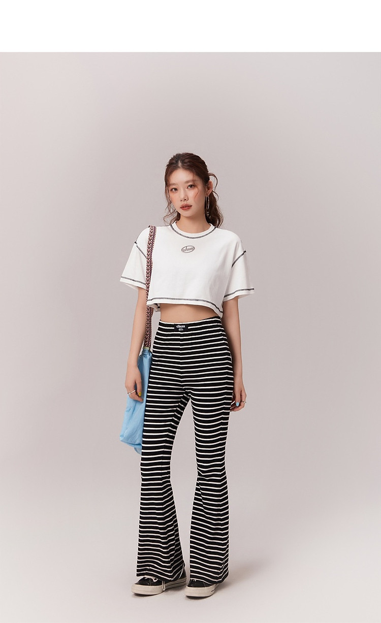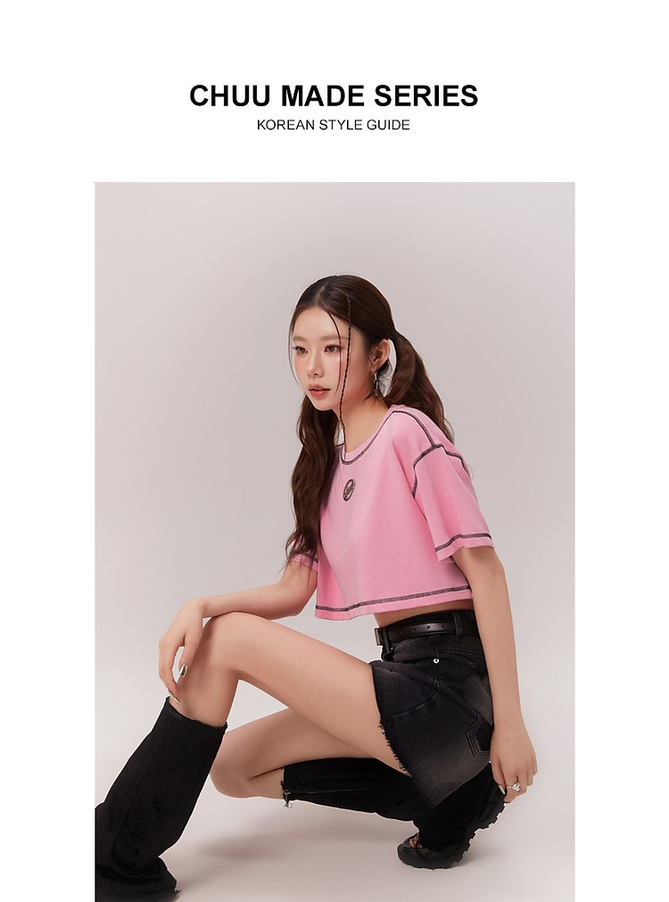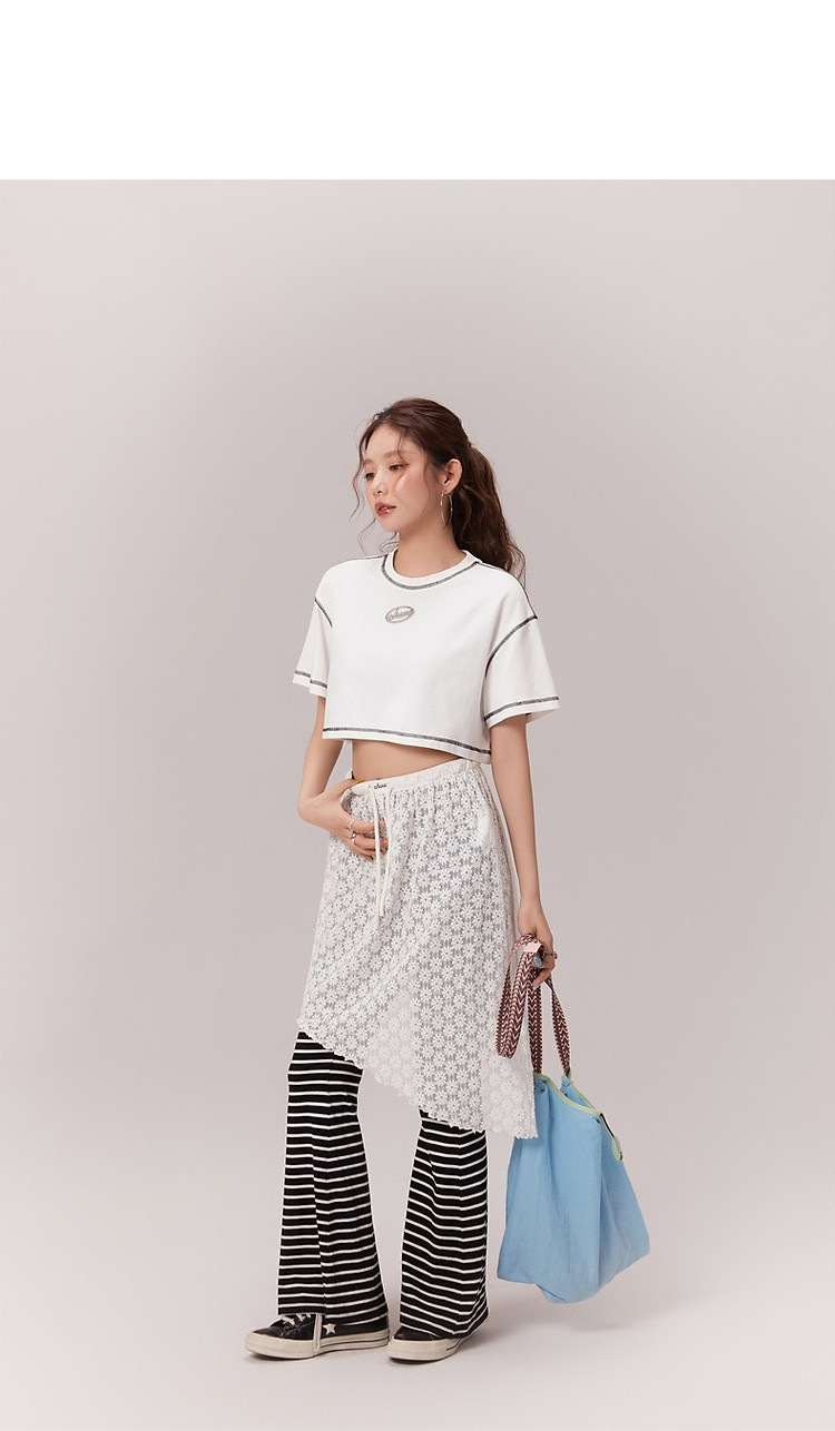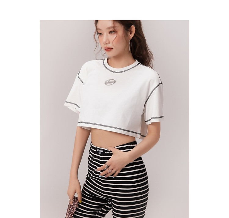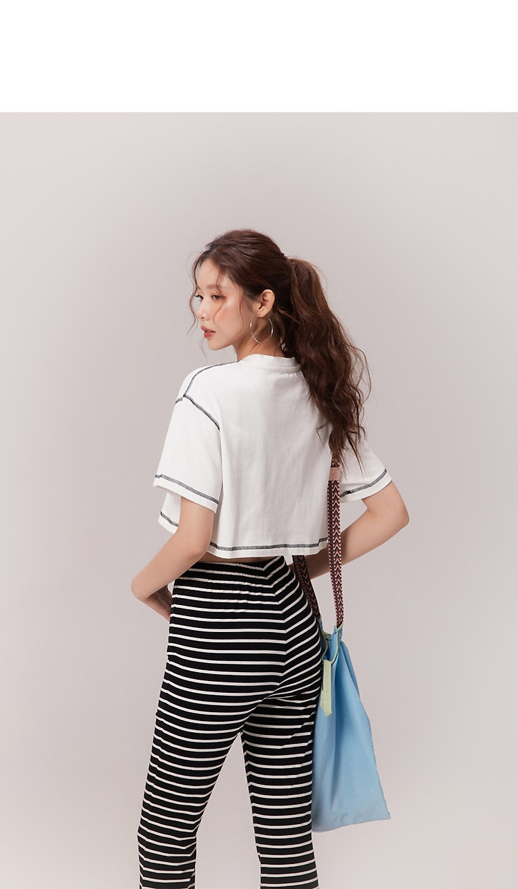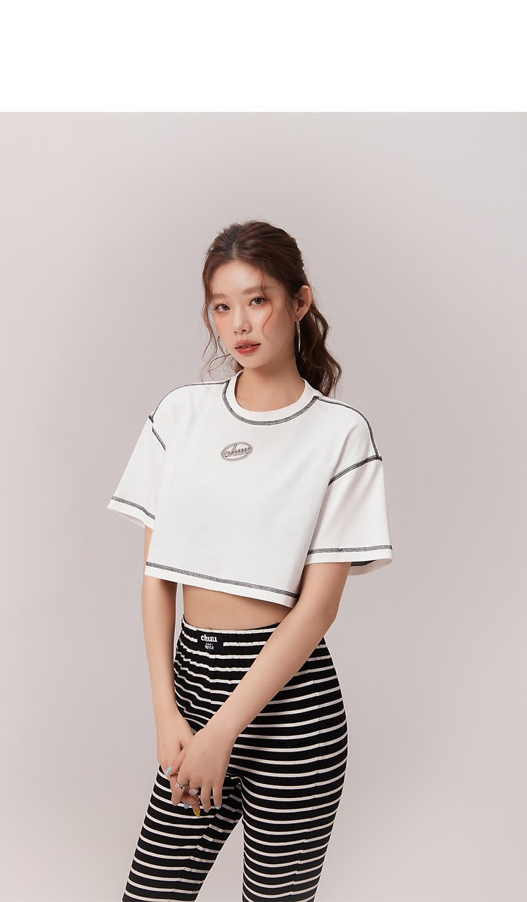 明线撞色落肩袖T恤女2025夏基础辣妹宽松露脐短款上衣 922963