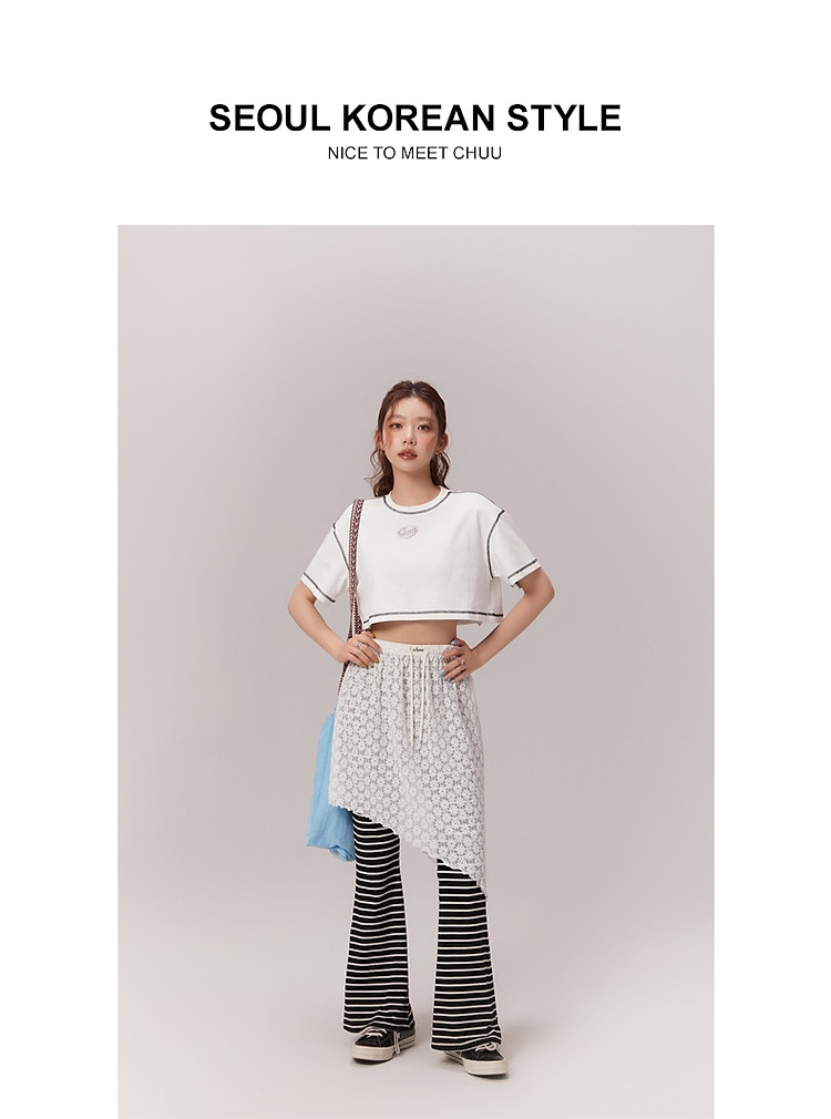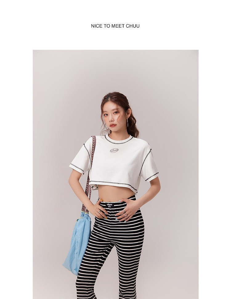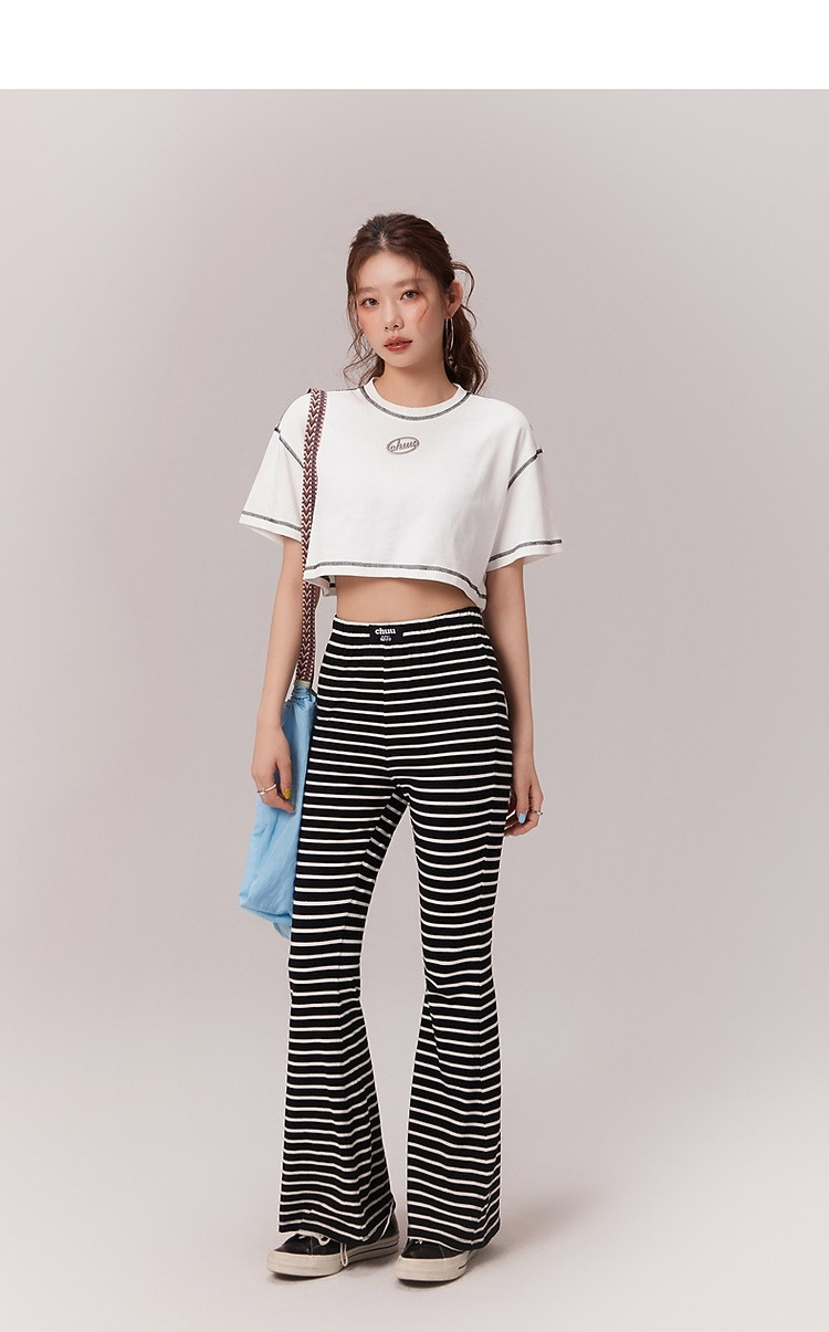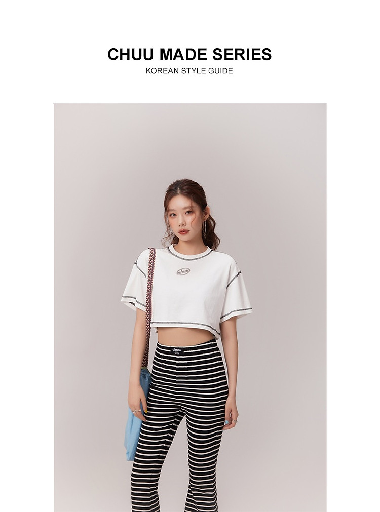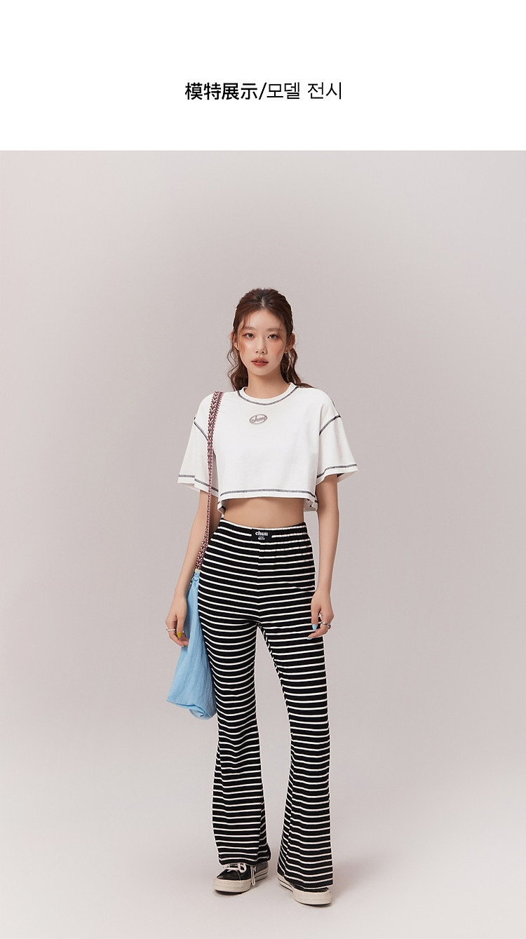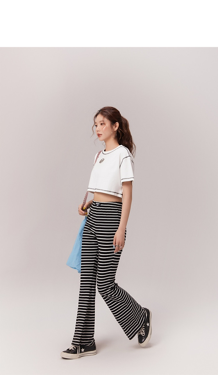 明线撞色落肩袖T恤女2025夏基础辣妹宽松露脐短款上衣 922963