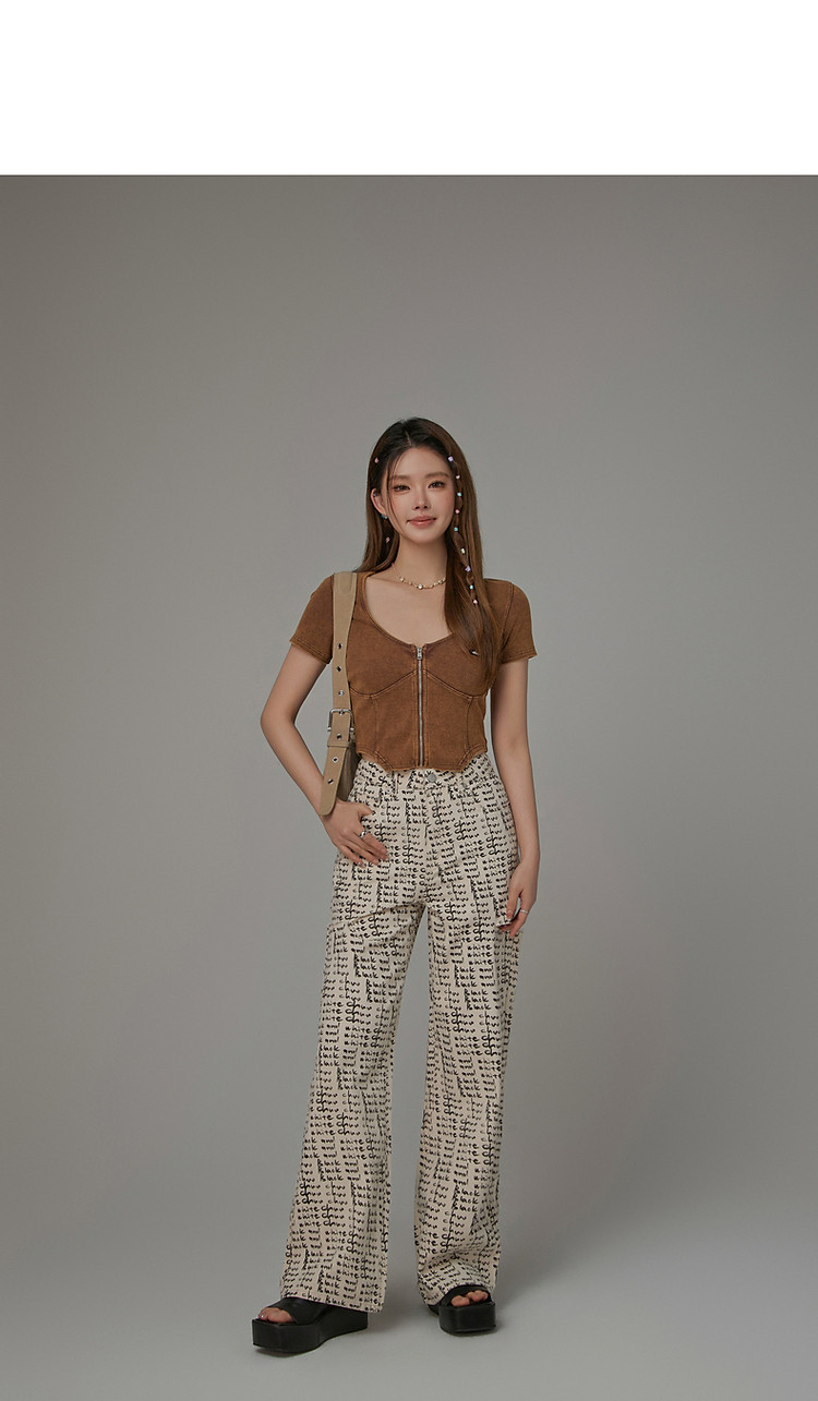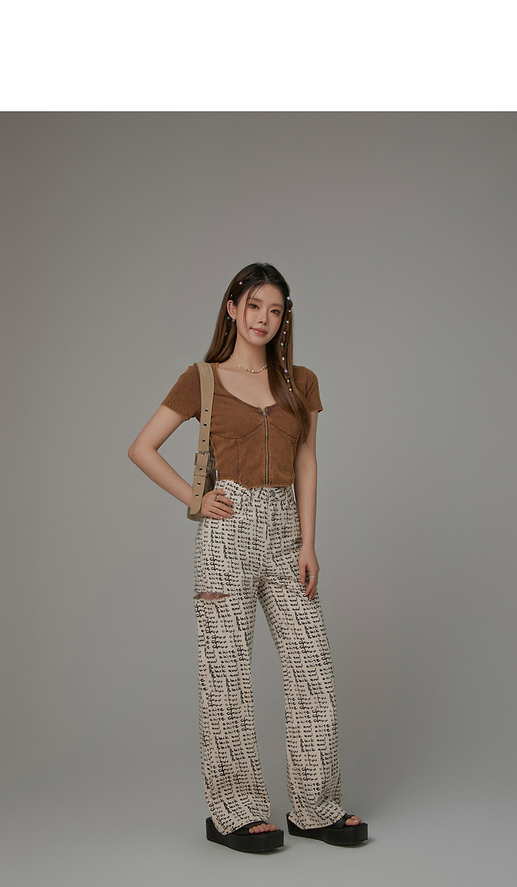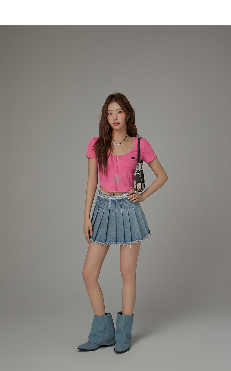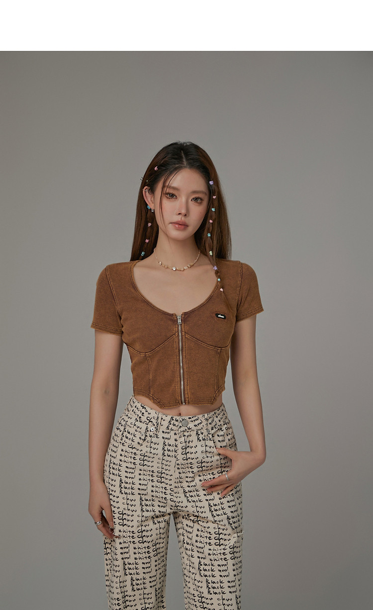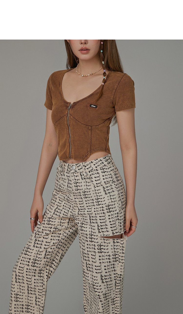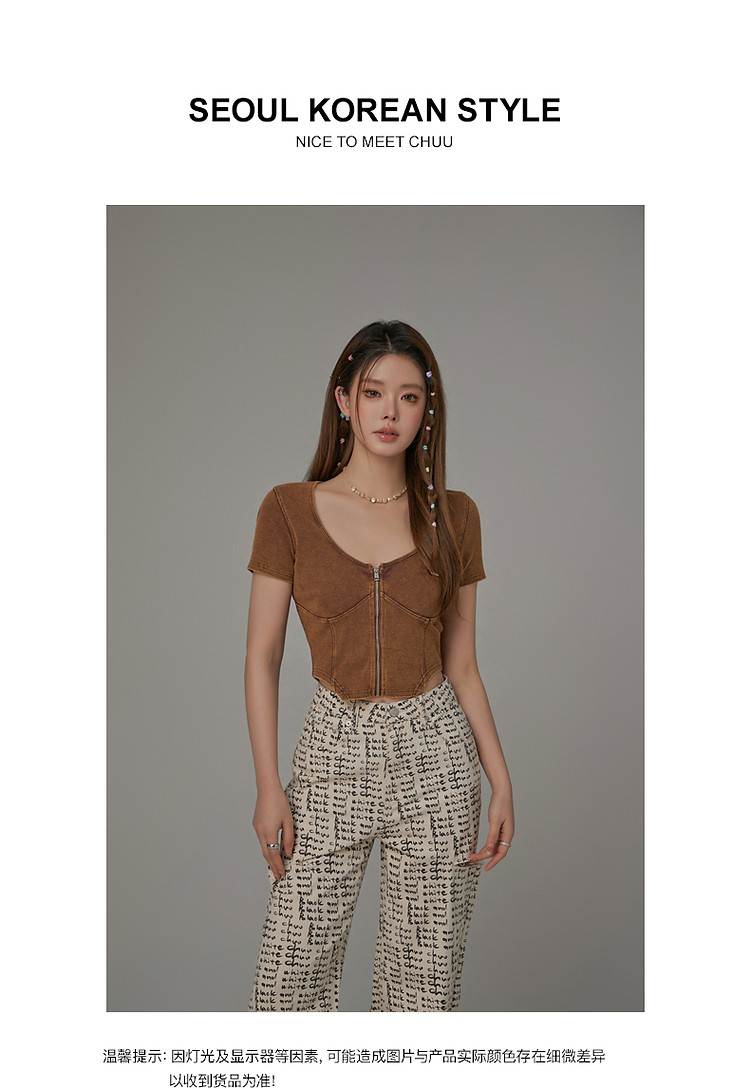 直角肩短袖T恤女2025春夏辣妹做旧拉链不规则立体感上衣 201619