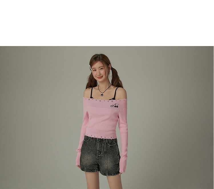 CHUU一字肩针织衫女2025春新款小樱桃字母刺绣破洞上衣 686547