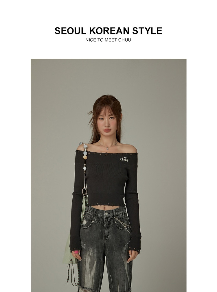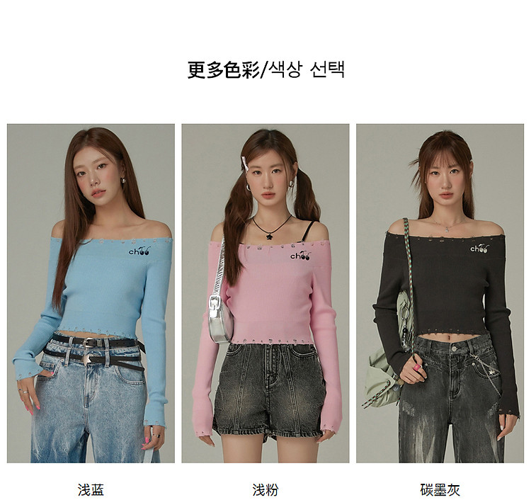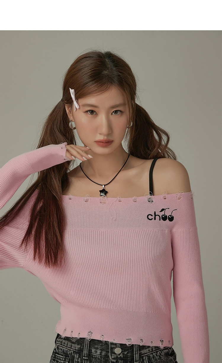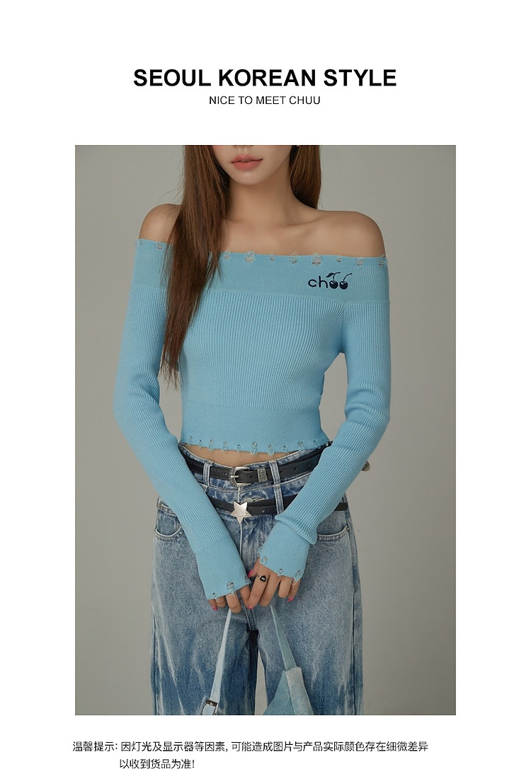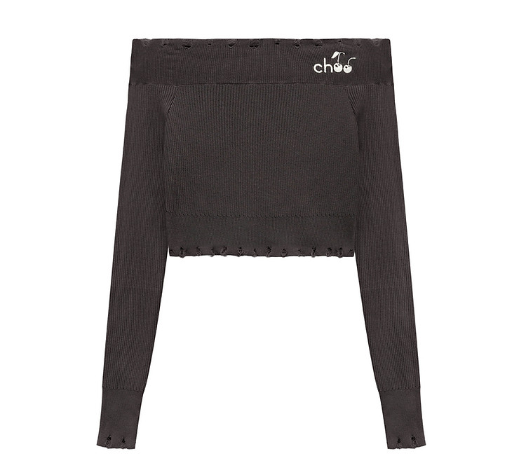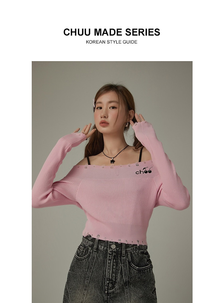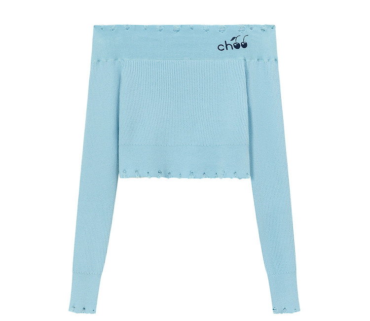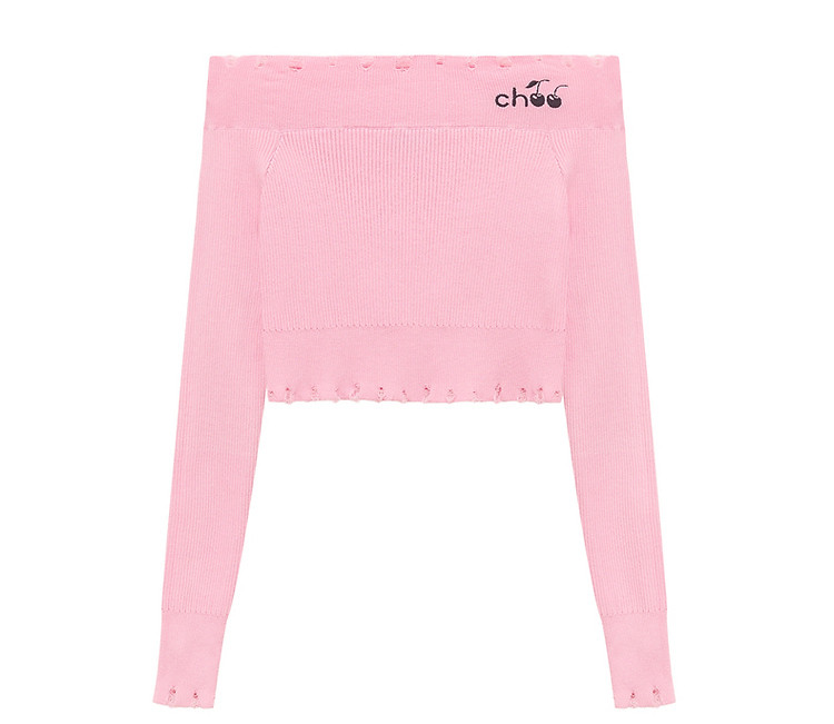 商品名称:CHUU一字肩针织衫女2025春新款小樱桃字母刺绣破洞上衣 686547