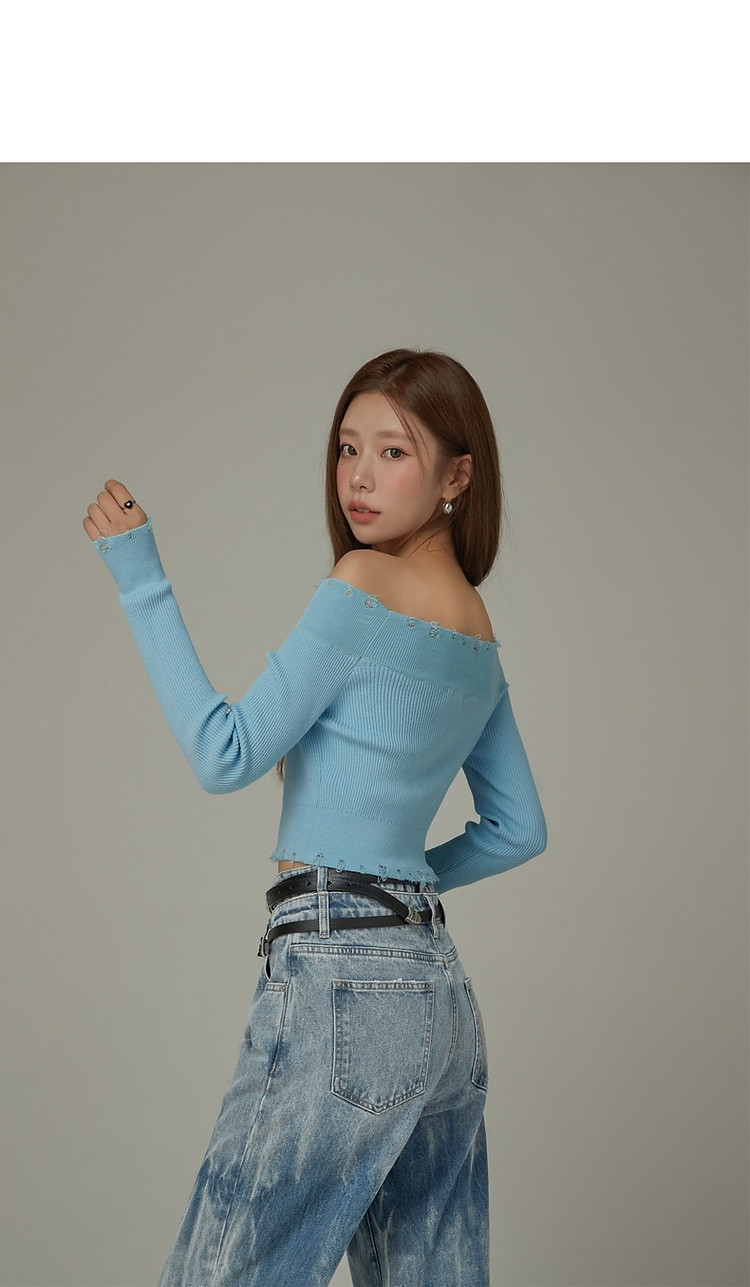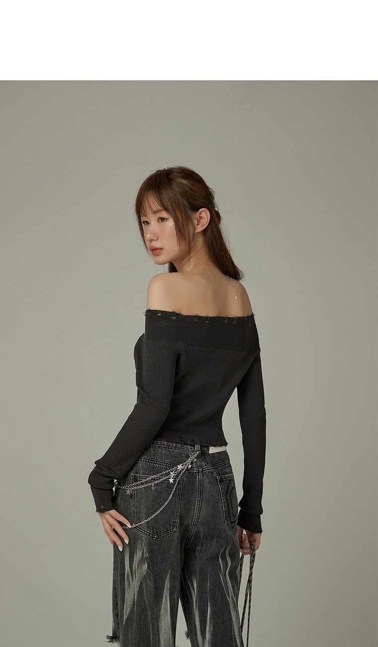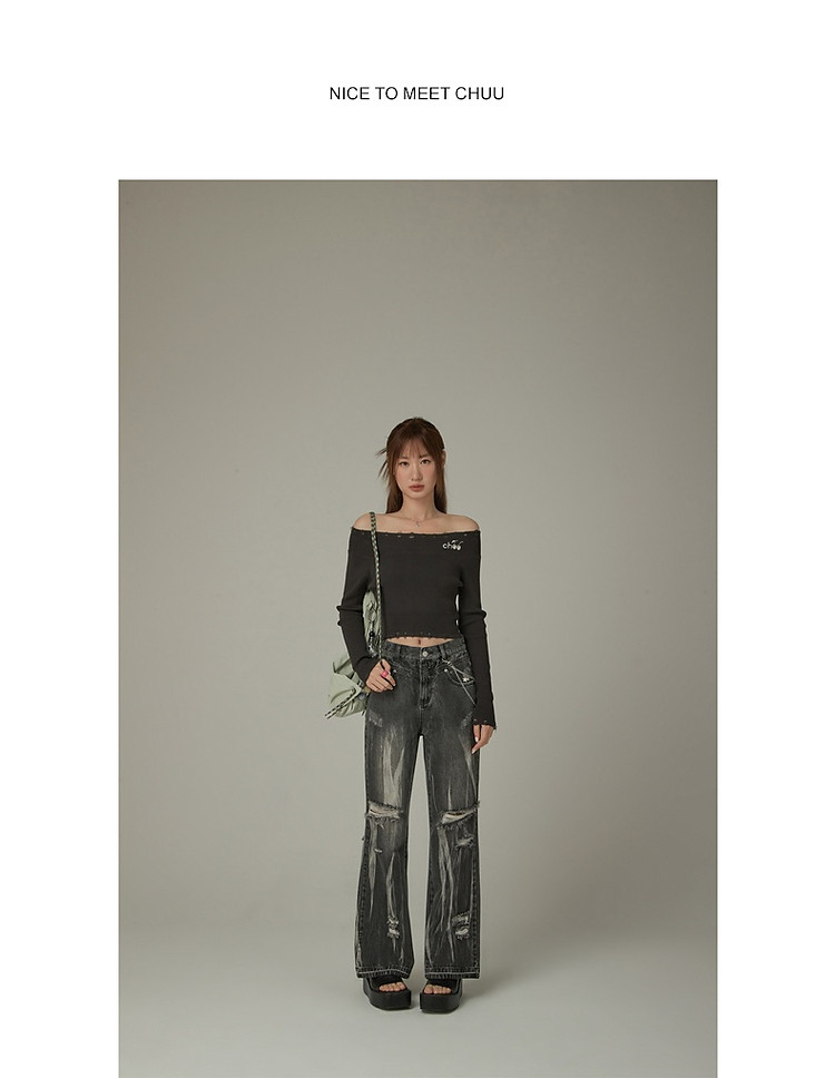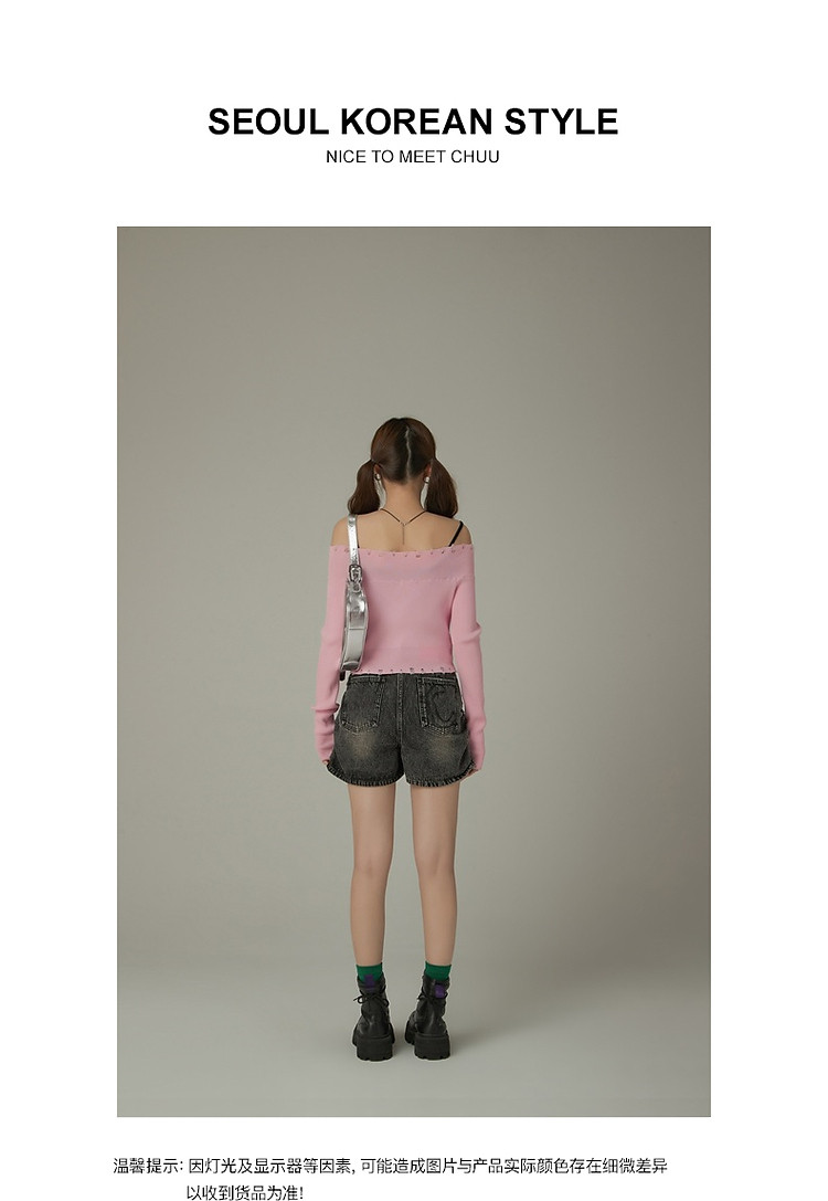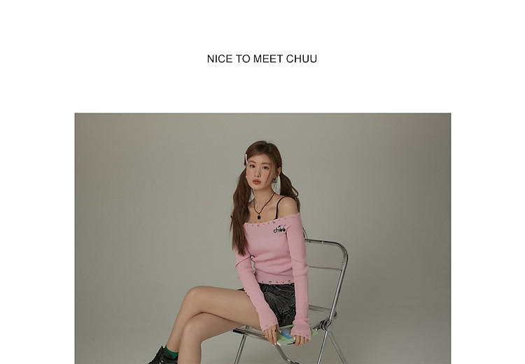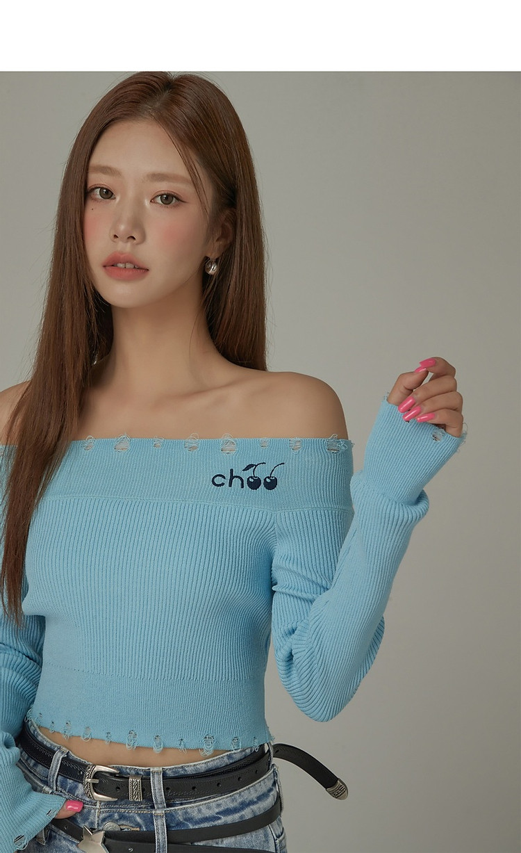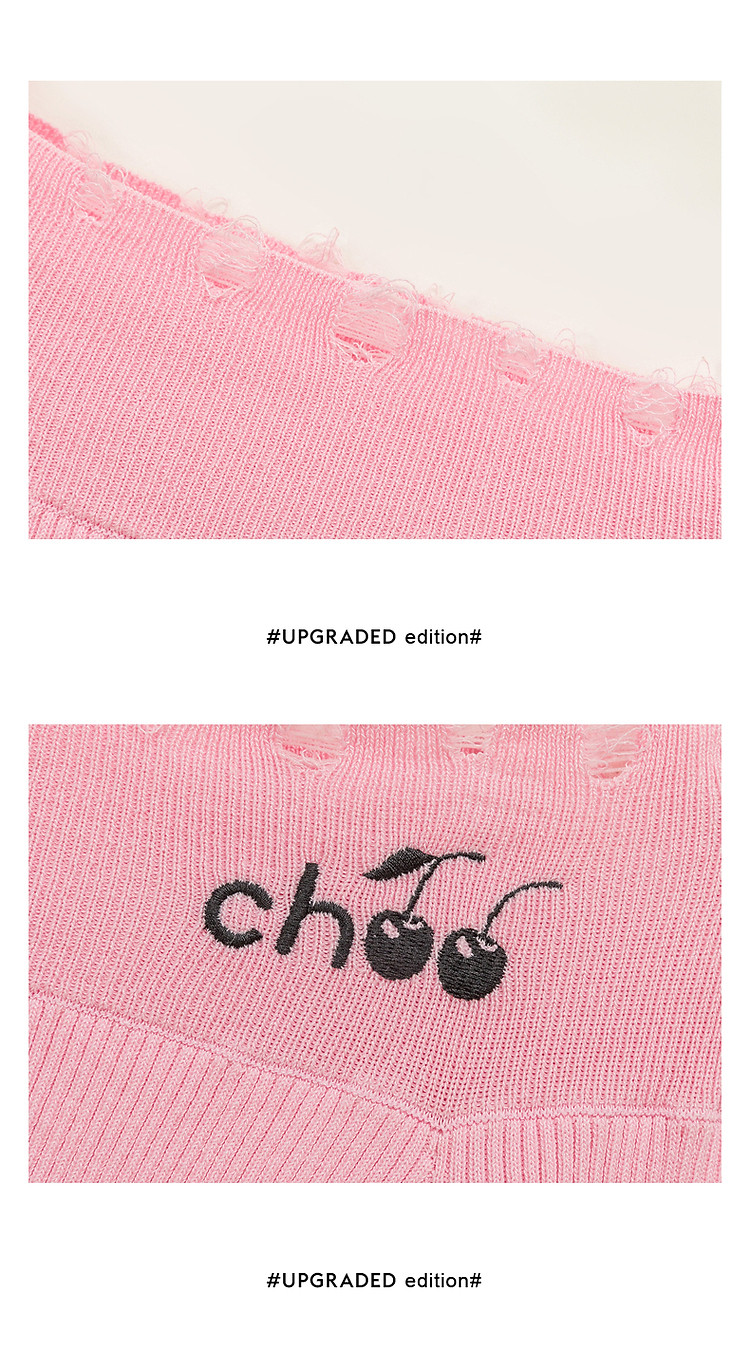 商品名称:CHUU一字肩针织衫女2025春新款小樱桃字母刺绣破洞上衣 686547
