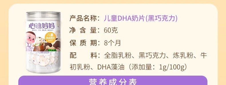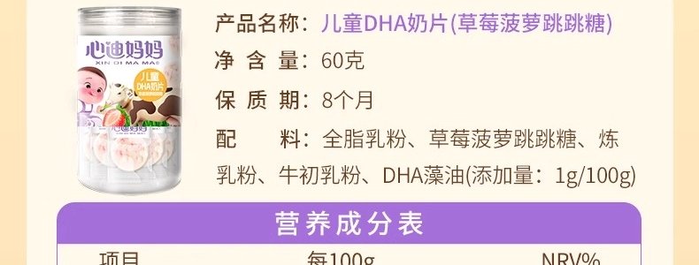 商品名称:心迪妈妈 儿童DHA奶片(草莓菠萝跳跳糖) 60g/罐