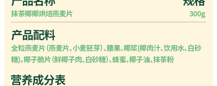 商品名称:谷之优品 抹茶椰椰烘焙燕麦片 300g*1袋