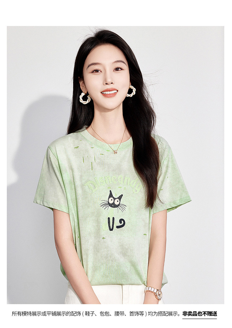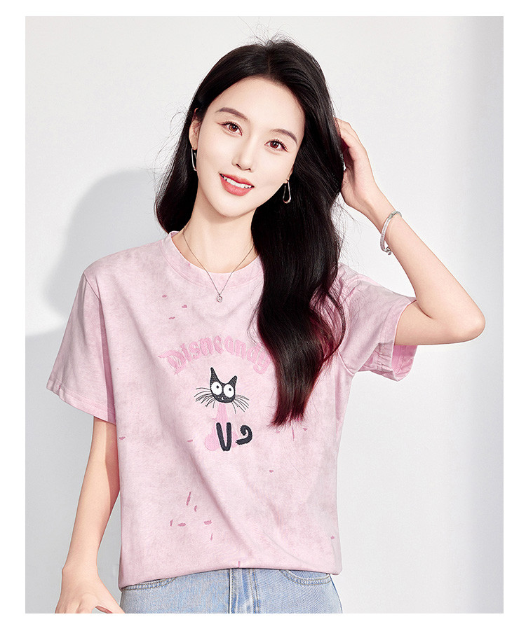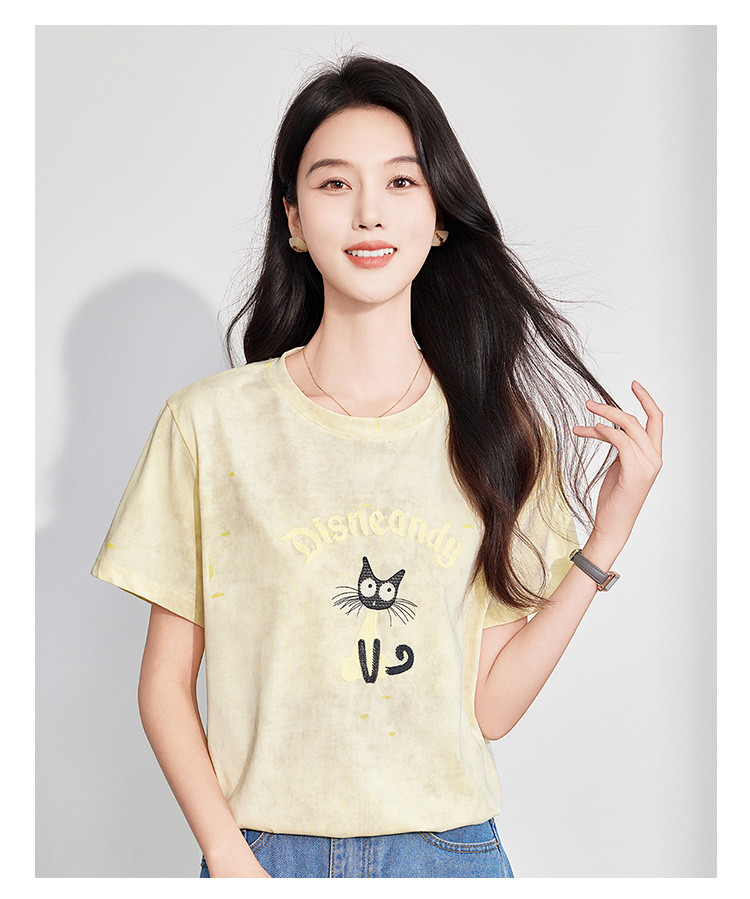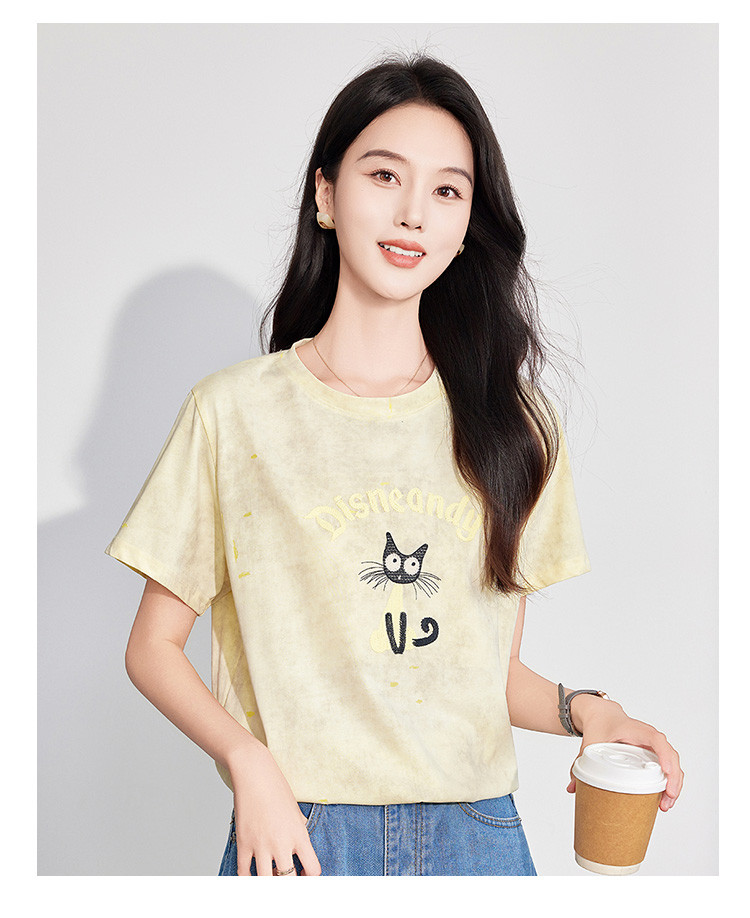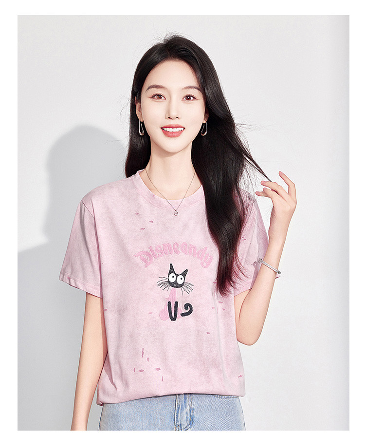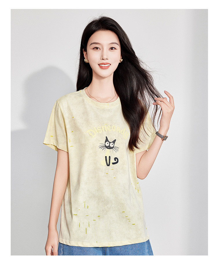 25夏季新款做旧氛围感减龄猫咪短袖女式韩系街头风百搭T恤上衣 601951