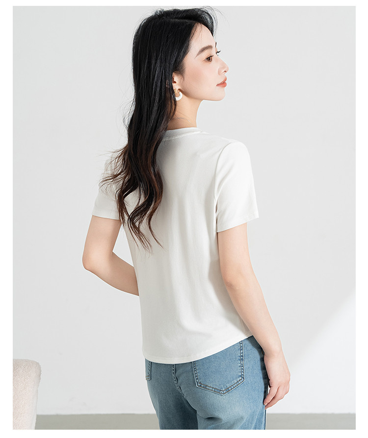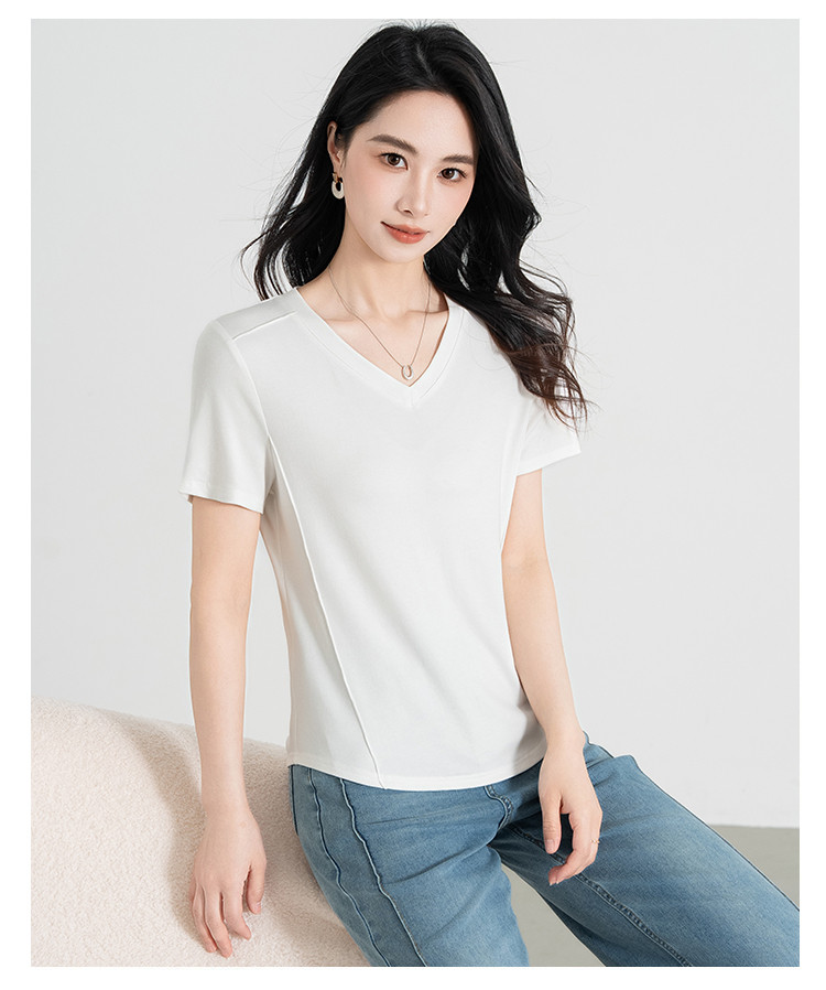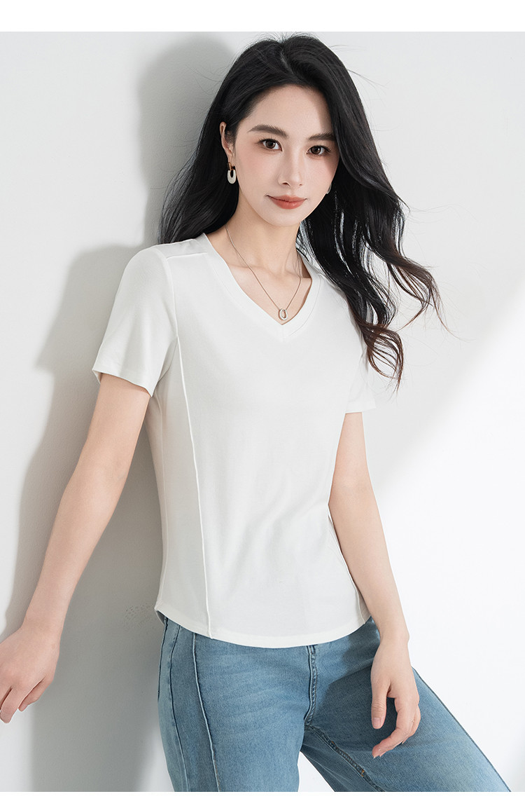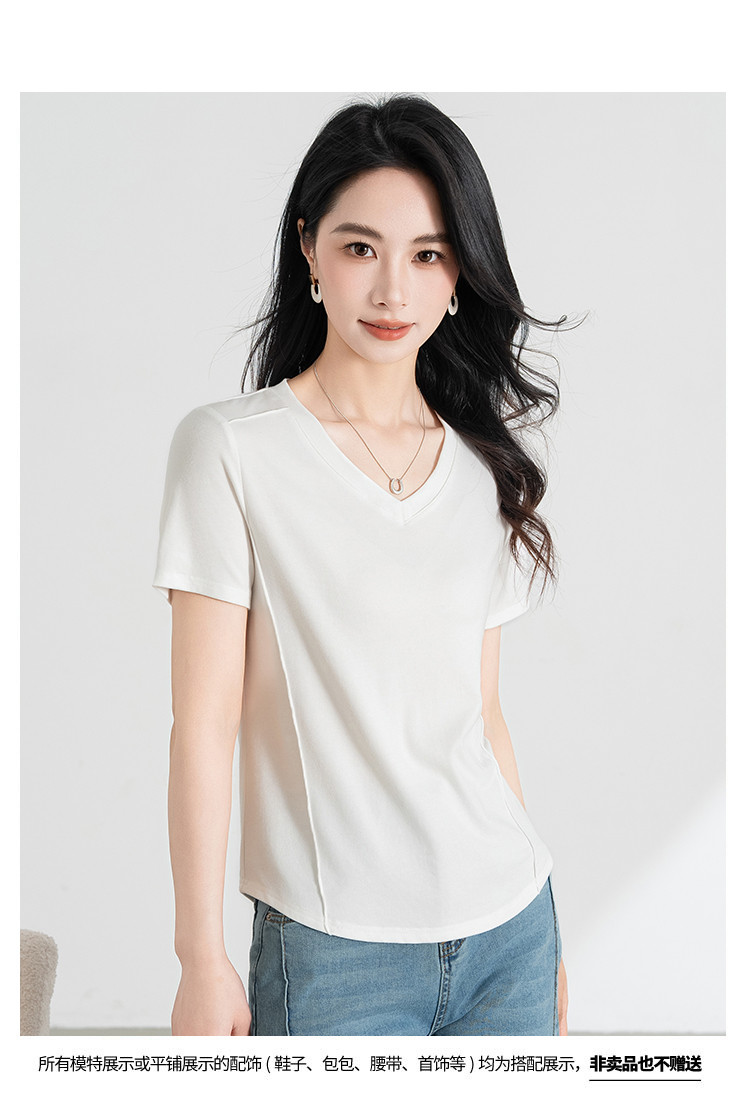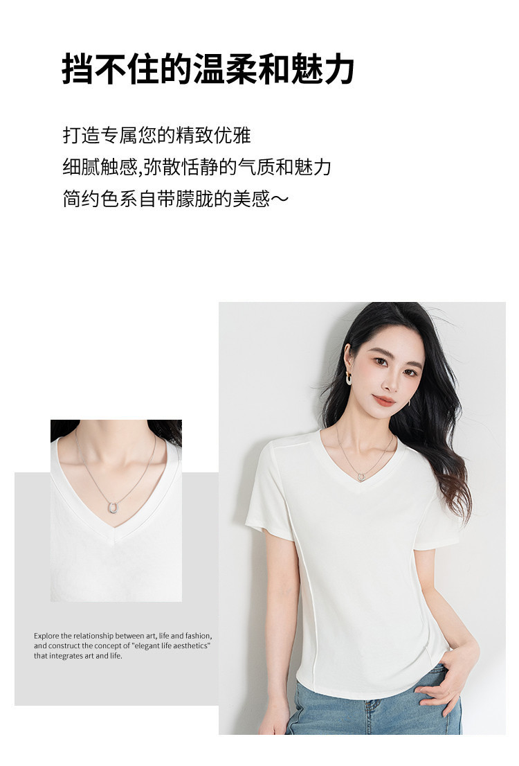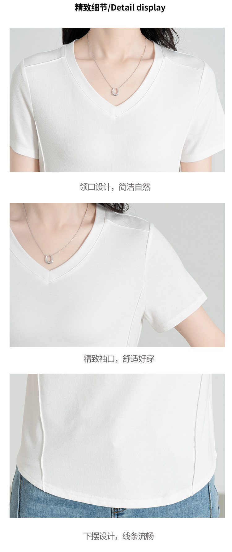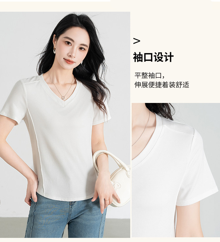 商品名称:【三色可选】鱼骨收腰显瘦V领t恤女夏季2025气质正肩短袖t 310175