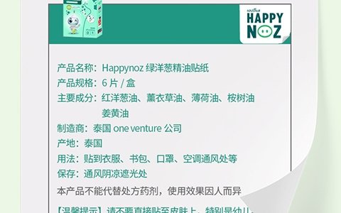 商品名称:泰国 HAPPYNOZ 儿童绿洋葱精油贴纸 姜黄味 6片装