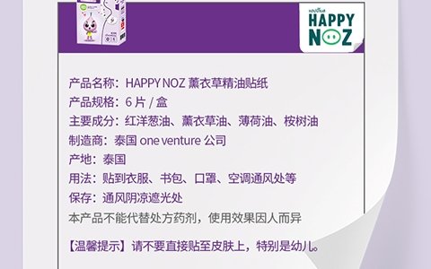 商品名称:泰国 HAPPYNOZ 儿童紫洋葱精油贴纸 薰衣草味 6片装