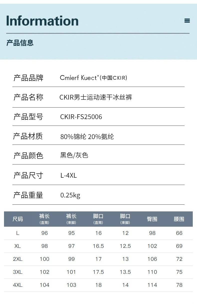 商品名称:Cmierf Kuect 男士运动速干冰丝裤CKIR-FS25006