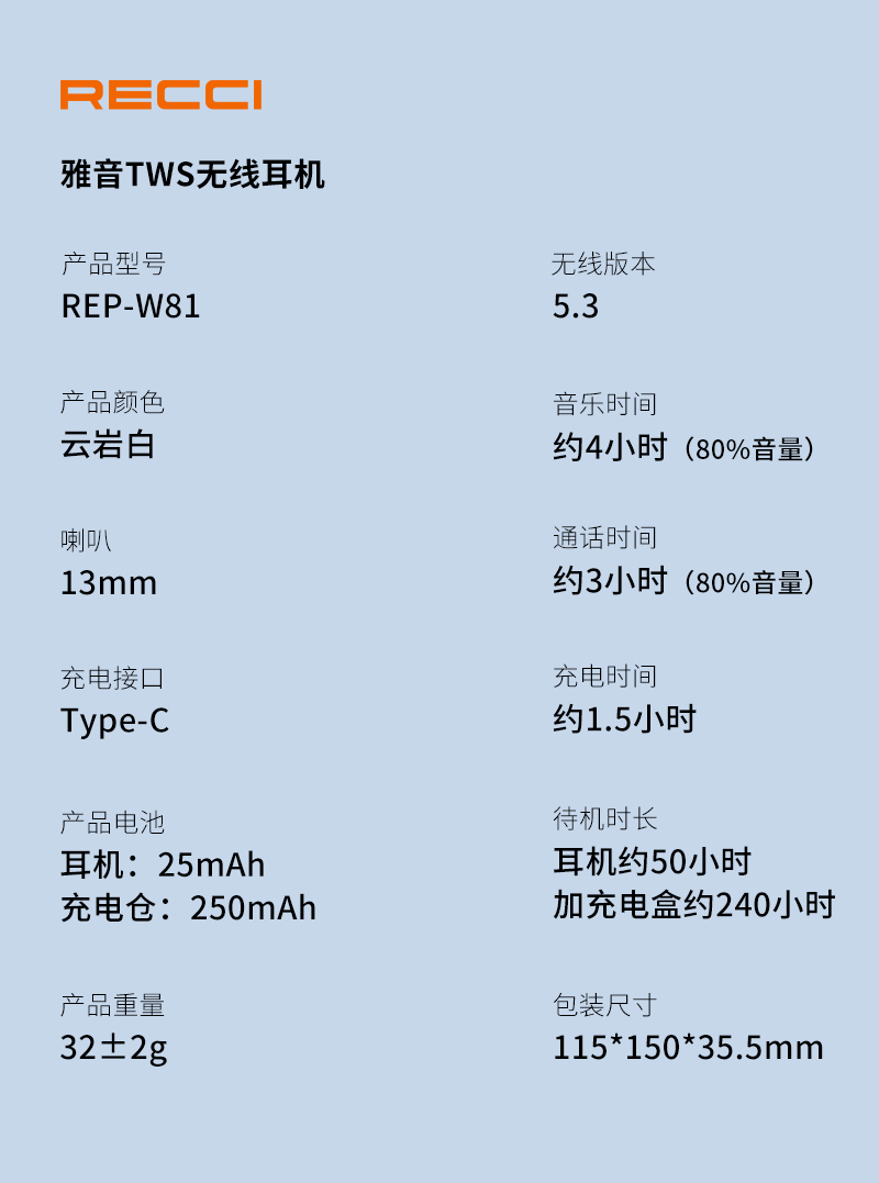 Recci/锐思雅音TWS无线耳机REP-W81