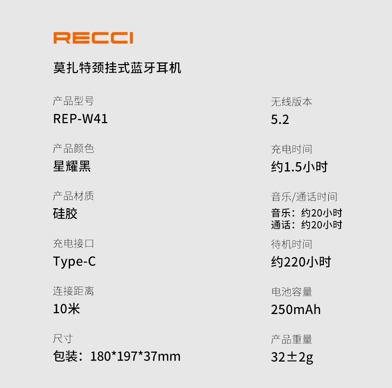 Recci/锐思莫扎特颈挂式蓝牙耳机REP-W41