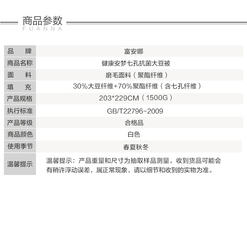 商品名称:FUANNA/富安娜健康安梦七孔抗菌大豆被203*229cm 1500g