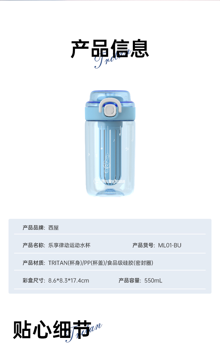 商品名称:Westinghouse/西屋550毫升乐享律动运动水杯ML01-BU