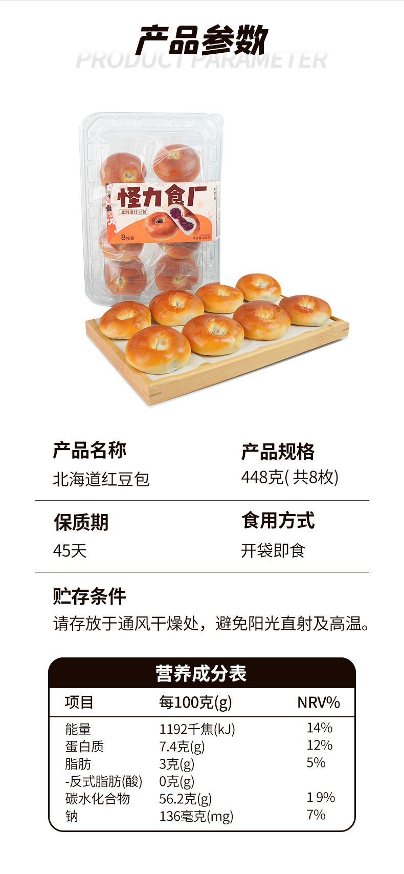 商品名称:怪力食厂北海道红豆面包448g*2盒