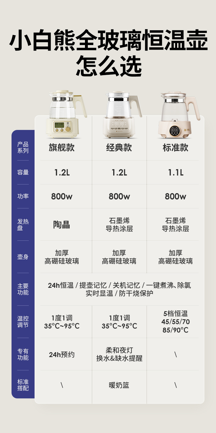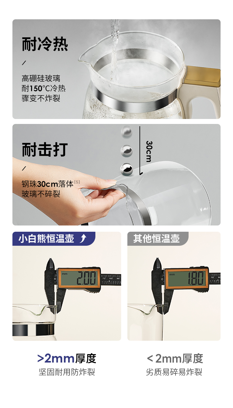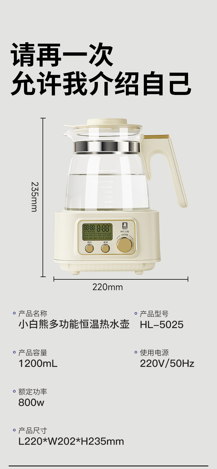 商品名称:Snow Bear/小白熊1.2升白款全玻璃多功能恒温热水壶HL-5025