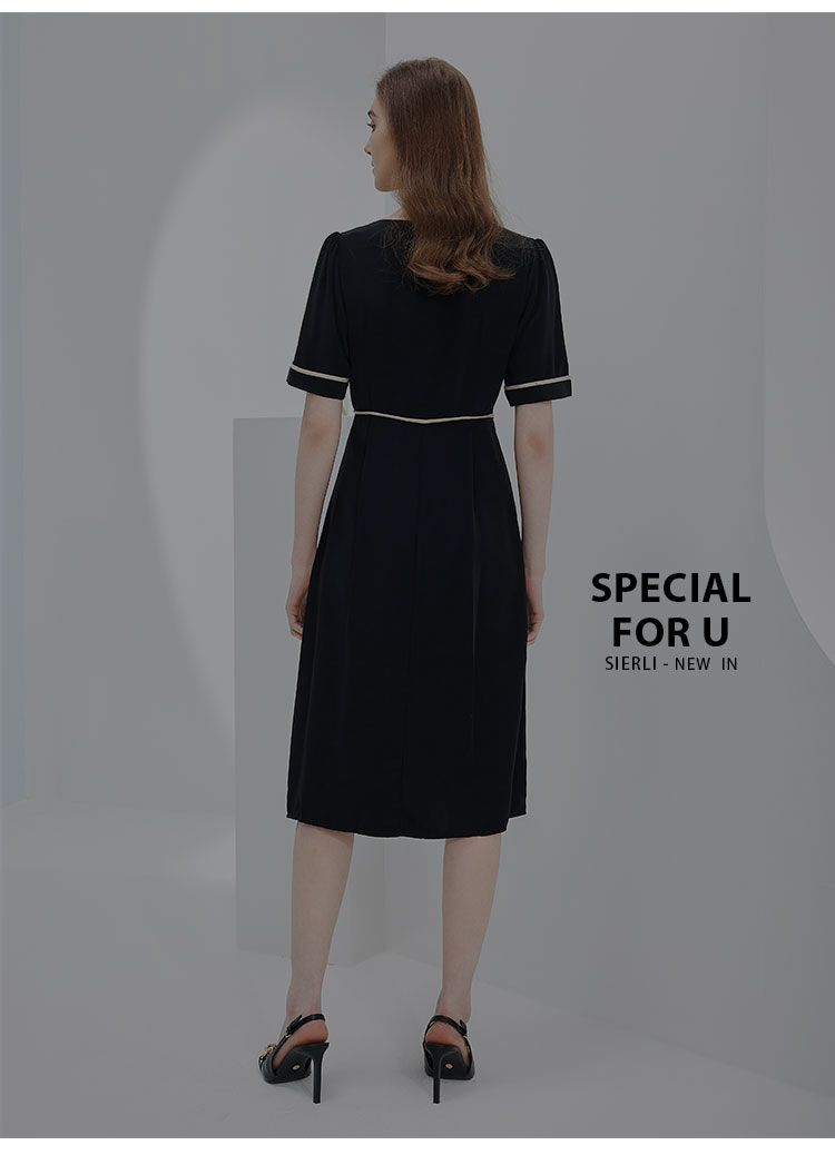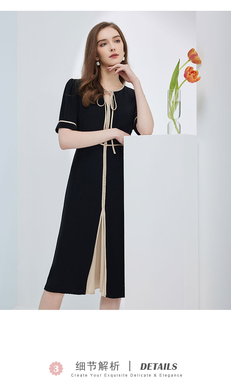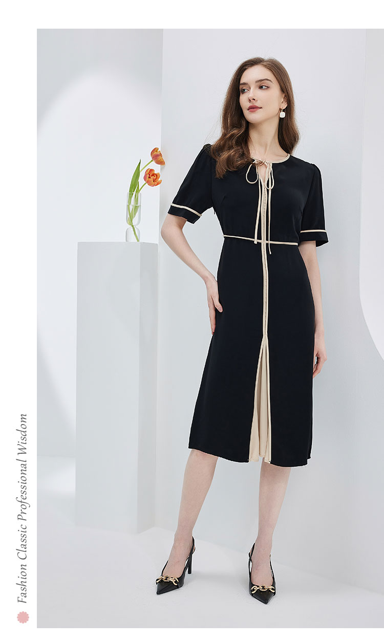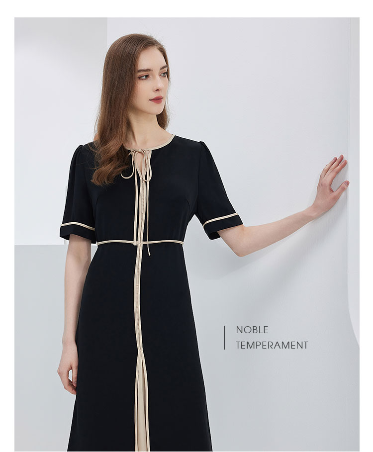 连衣裙春夏时尚圆领蝴蝶结中长拼色收腰显瘦通勤连衣裙 407391