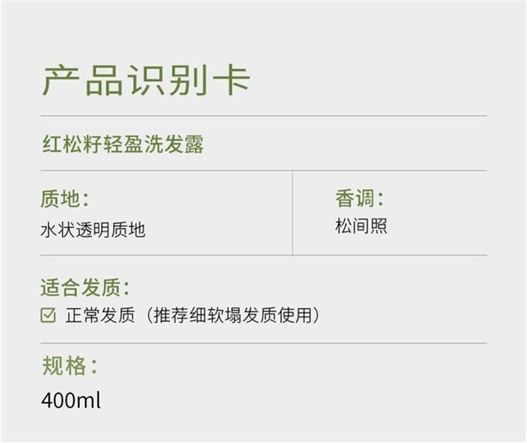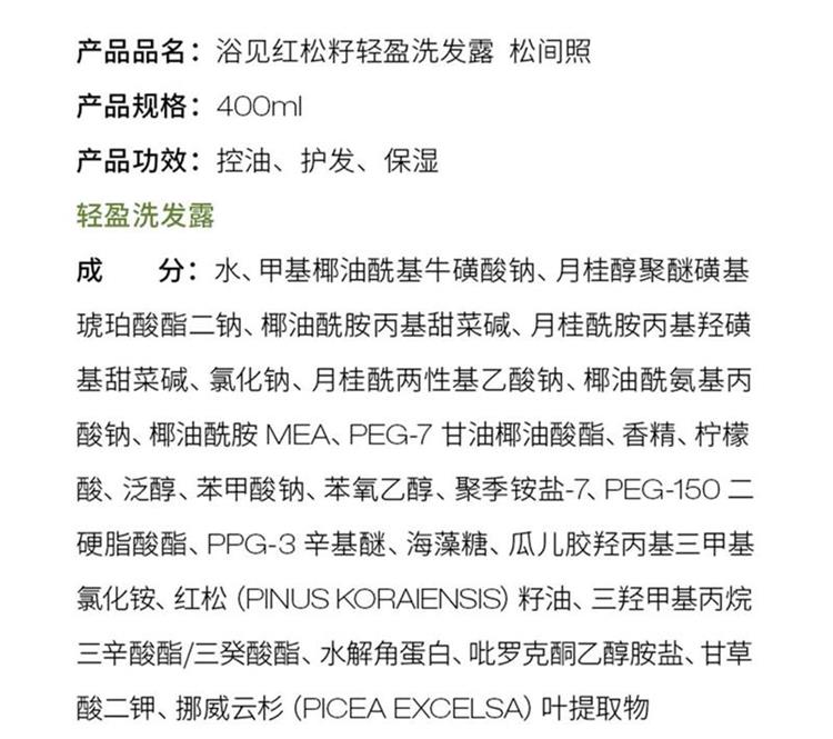 商品名称:浴见红松籽轻盈洗发露 400ml/瓶*2瓶(赠洗发水20ml*2+果酸精华5ml*2香型随机)