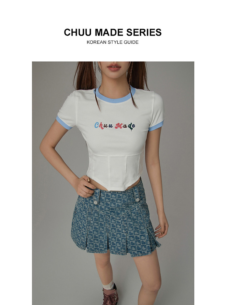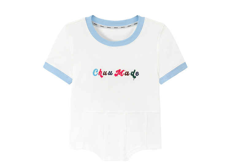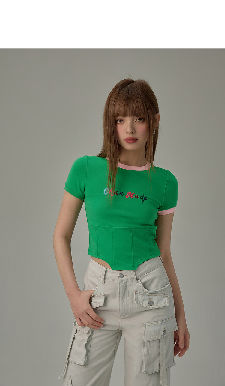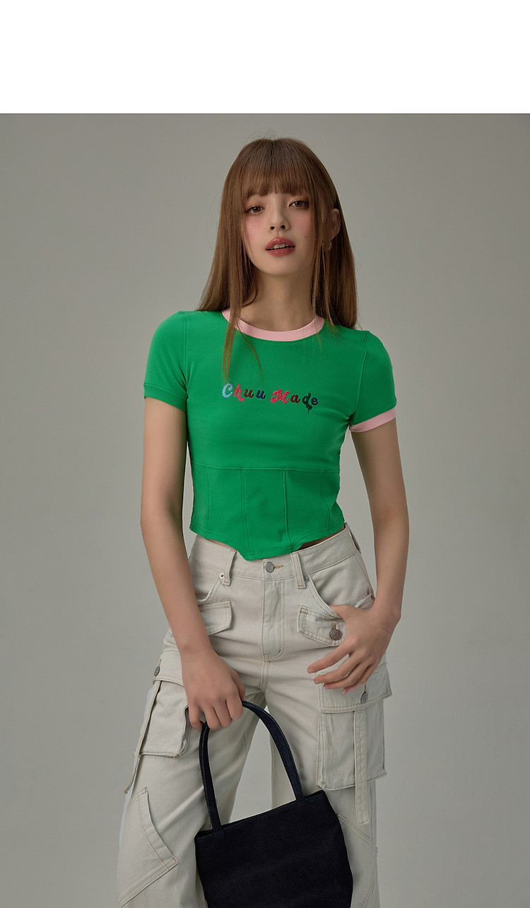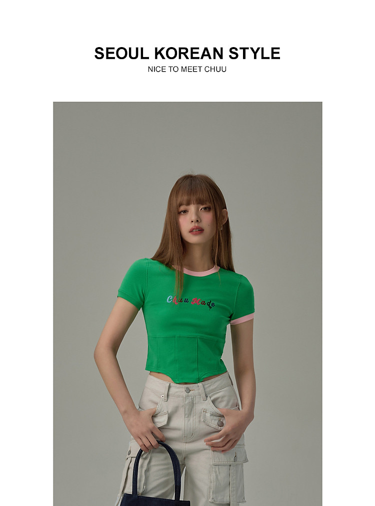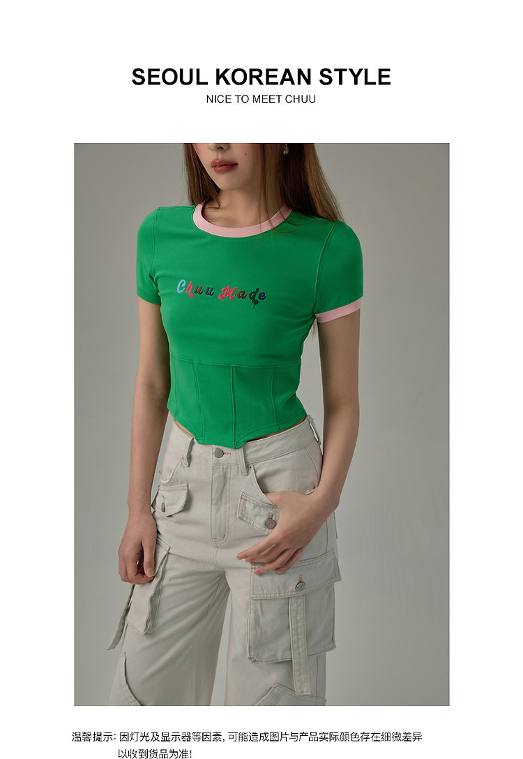 商品名称:彩色字母绣花T恤女2025夏学院风撞色拼接修身短袖上衣 345747